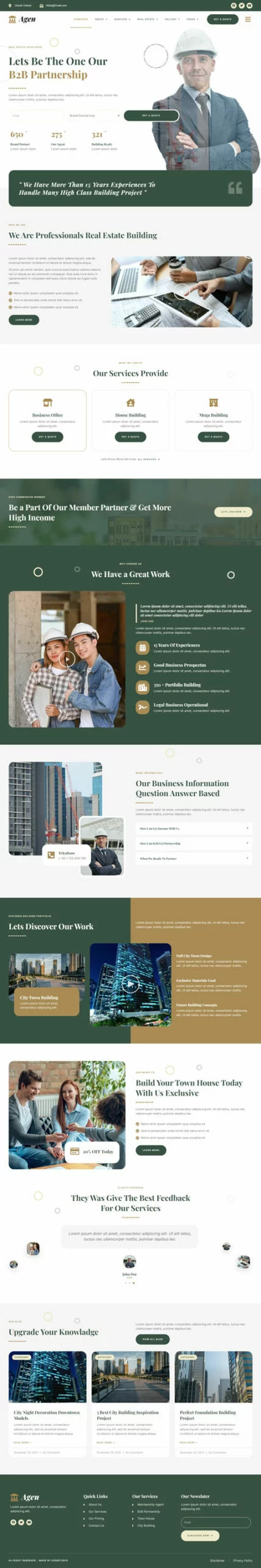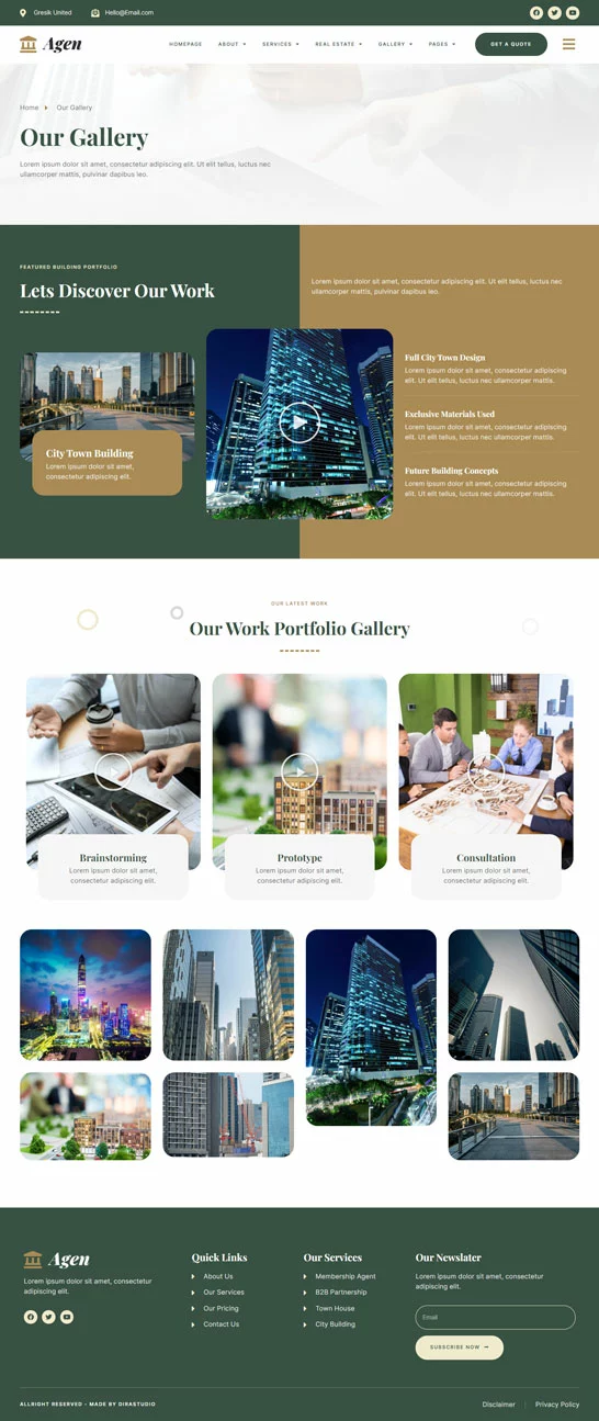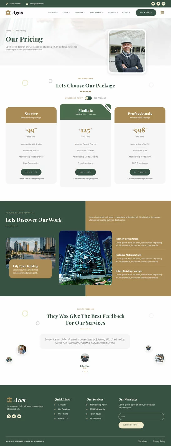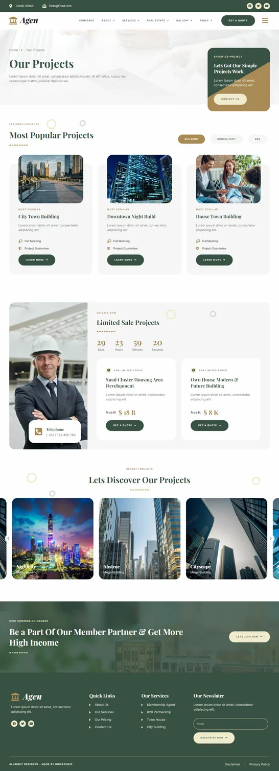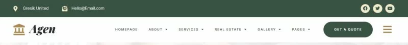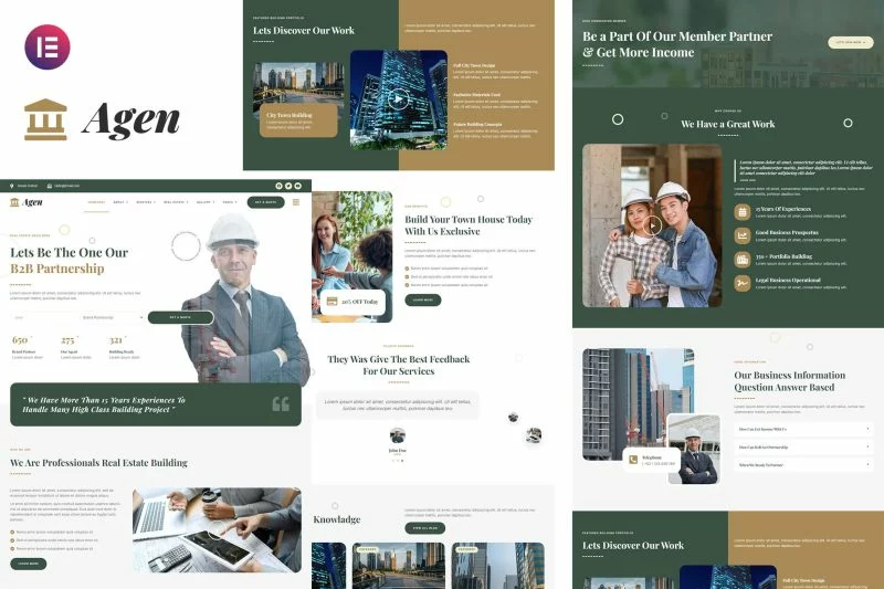 کیت قالب المنتور مشاور املاک و توسعه دهنده ملک Agen برای مشاور املاک و توسعه دهنده ملک یک مجموعه از چیدمانها برای افزونه صفحهساز المنتور برای وردپرس است که برای استفاده با نسخه پرو المنتور جهت طراحیهای پاک و زیبا طراحی شده است. این کیت با بیشتر قالبها سازگار است و برای استفاده با قالب رایگان Hello Elementor بهینه شده است.