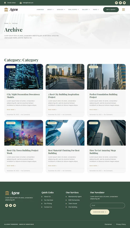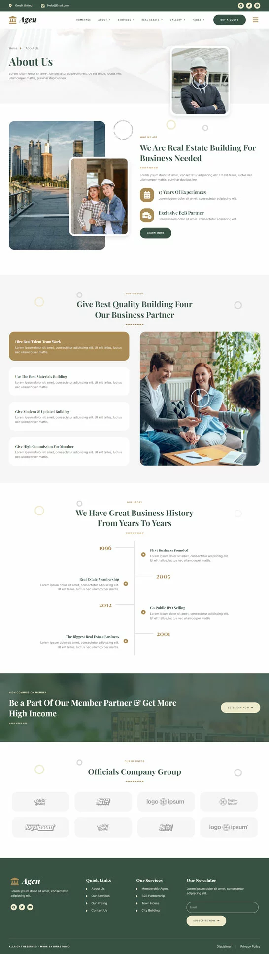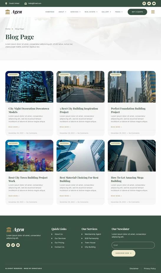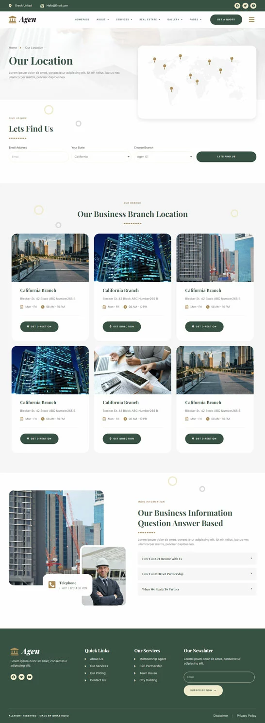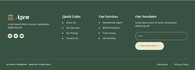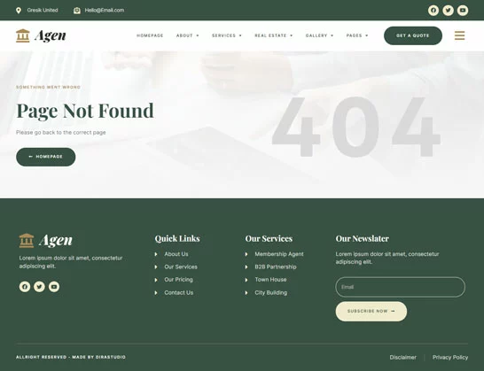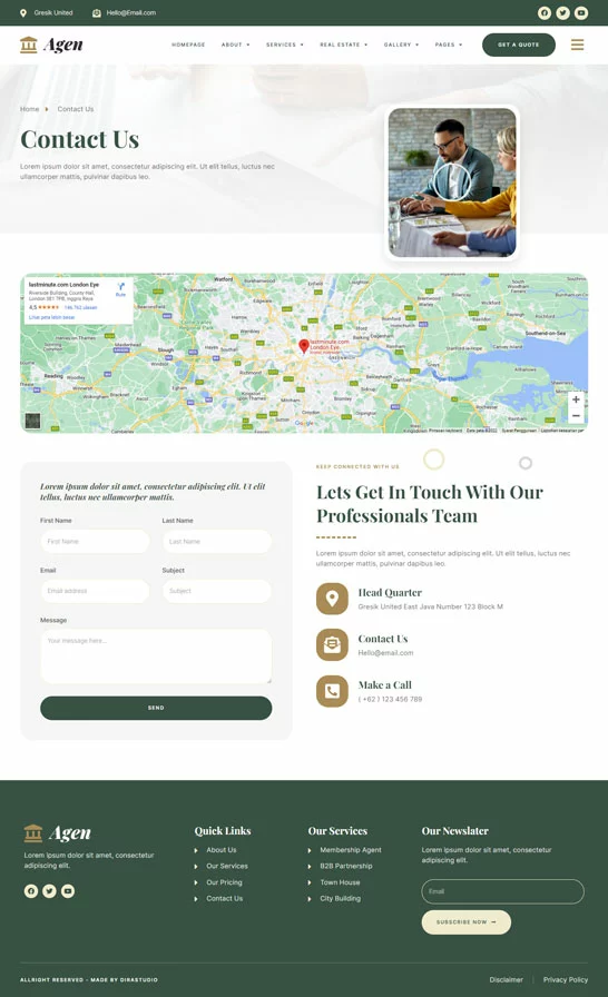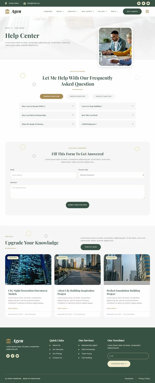 کیت قالب المنتور مشاور املاک و توسعه دهنده ملک Agen برای مشاور املاک و توسعه دهنده ملک یک مجموعه از چیدمانها برای افزونه صفحهساز المنتور برای وردپرس است که برای استفاده با نسخه پرو المنتور جهت طراحیهای پاک و زیبا طراحی شده است. این کیت با بیشتر قالبها سازگار است و برای استفاده با قالب رایگان Hello Elementor بهینه شده است.