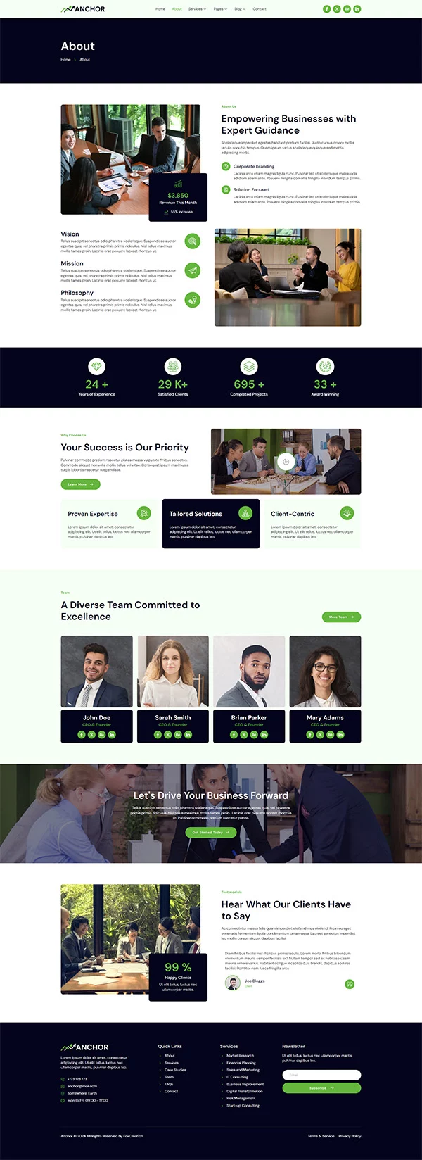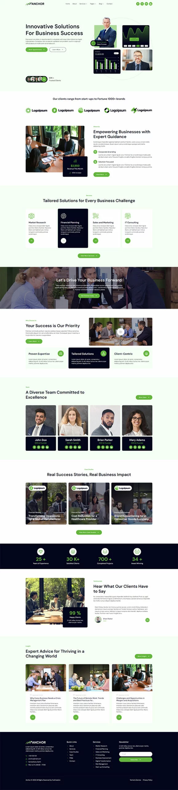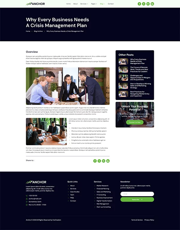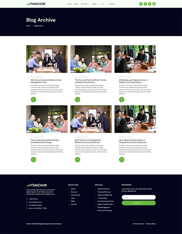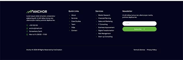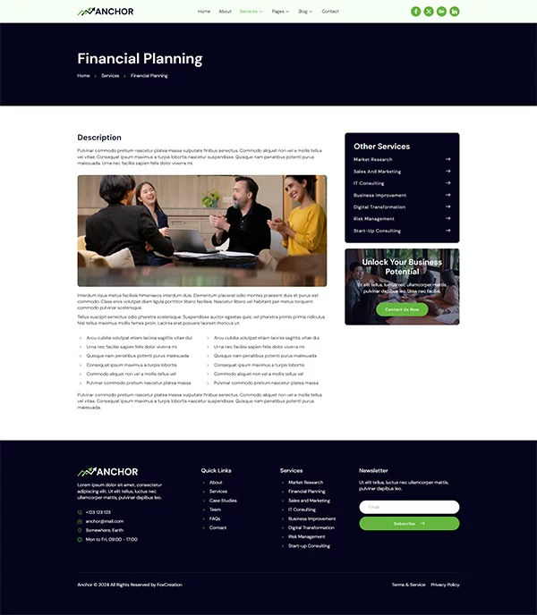 کیت قالب المنتور مشاوره کسب و کار Anchor با طراحی حرفهای و مدرن خود، فضای زیبایی برای معرفی کسبوکار شما فراهم میکند و اعتماد کاربران را جلب میکند. طراحی تمیز و سبک، تجربهای آرامشبخش و حرفهای را به مخاطبان ارائه میدهد.