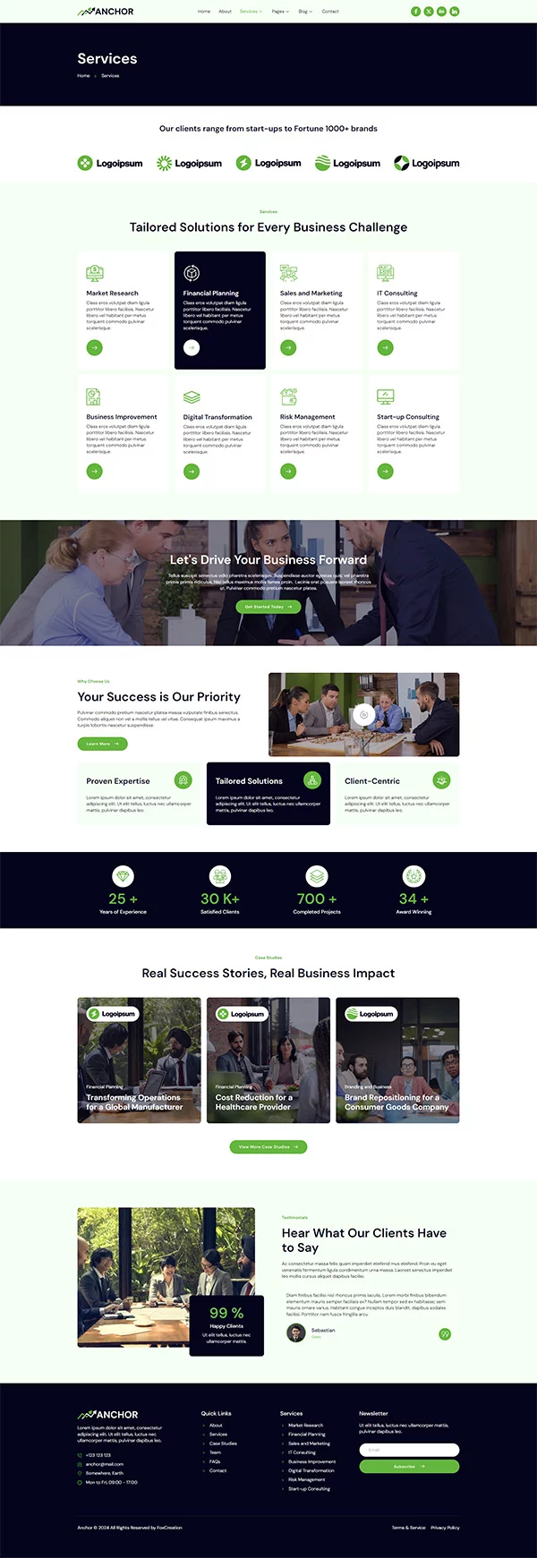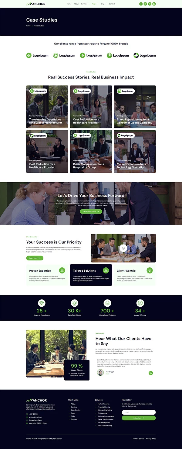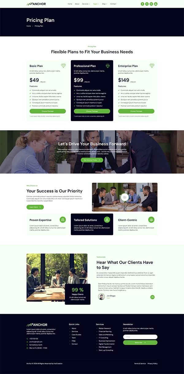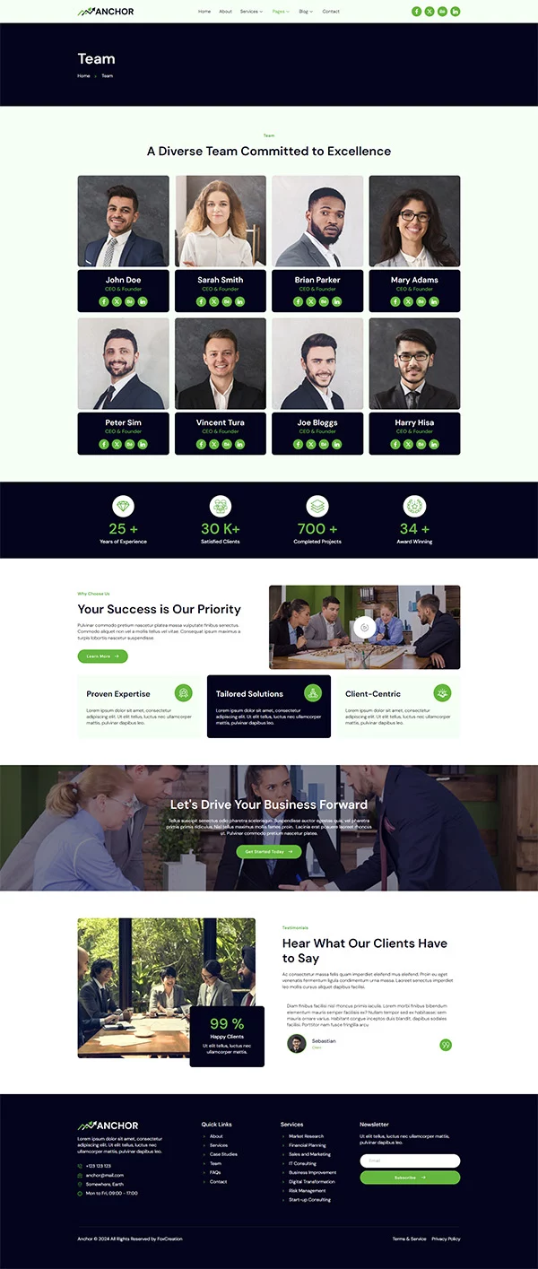 این قالب شامل مجموعهای از صفحات کلیدی و کاربردی است که برای وبسایتهای مشاوره کسبوکار و ارائه خدمات بسیار ایدهآل است: