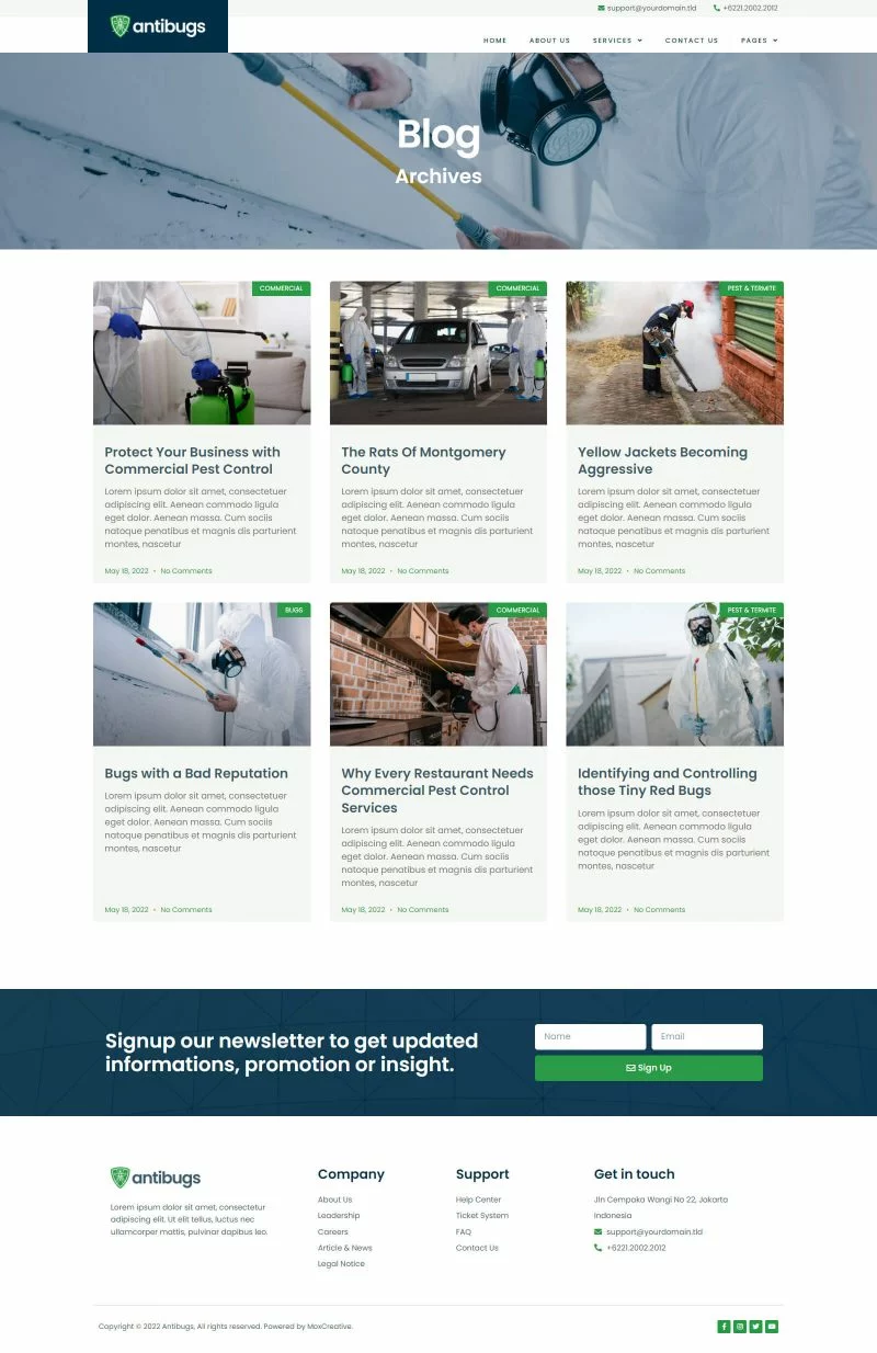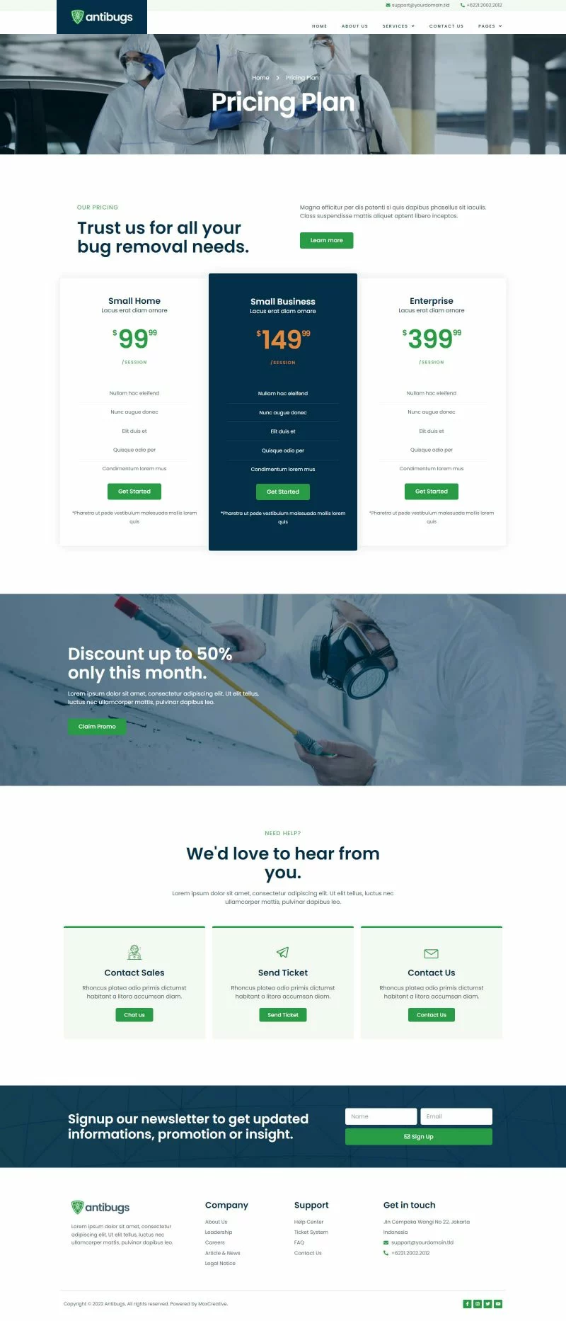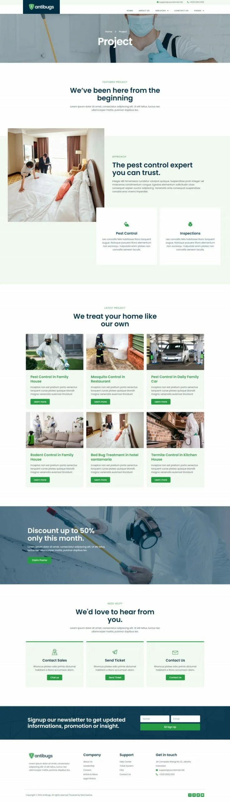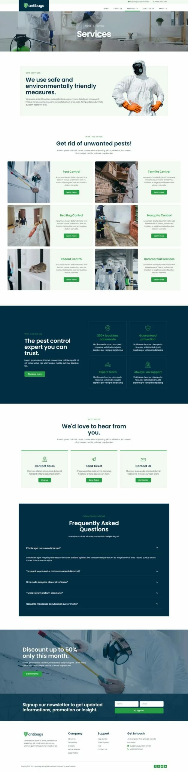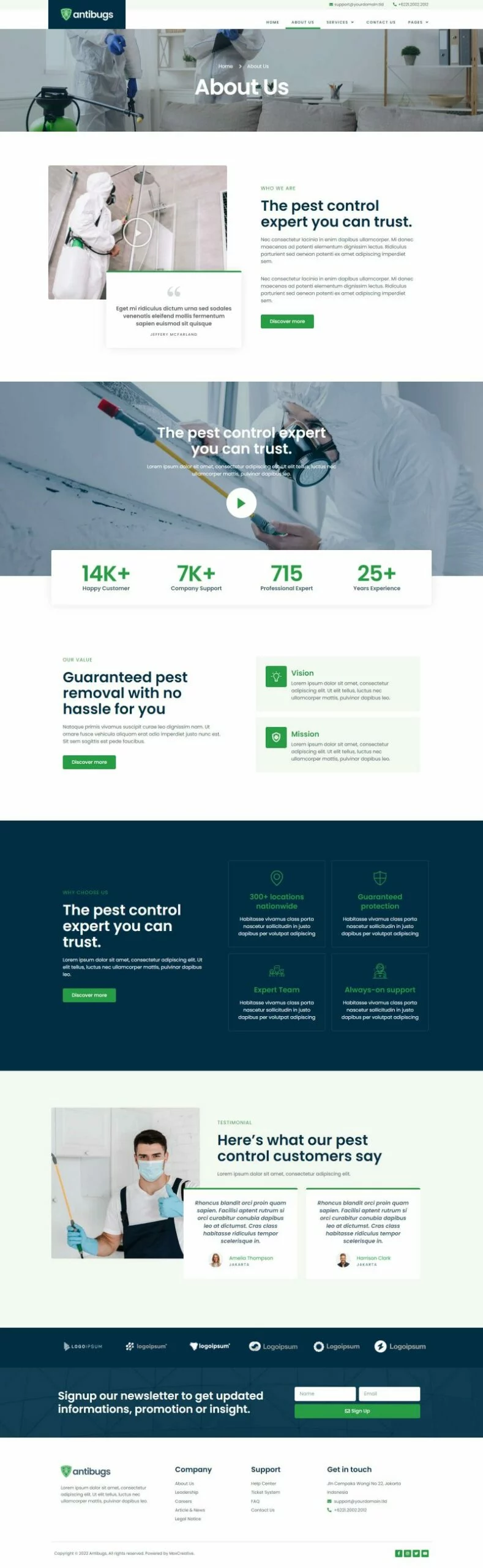 کیت قالب المنتور خدمات کنترل آفات Antibugs به شما کمک میکند تا هر نوع وبسایت مرتبط با خدمات کنترل آفات ایجاد کنید، از جمله کنترل آفات، کنترل پشه، کنترل موش و سوسک، کنترل سوسک خواب و هر خدمات دیگر مرتبط با کنترل آفات. این قالب دارای بیش از 12 قالب آماده با طراحی ساده و استایل مدرن است.