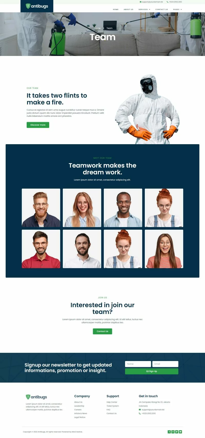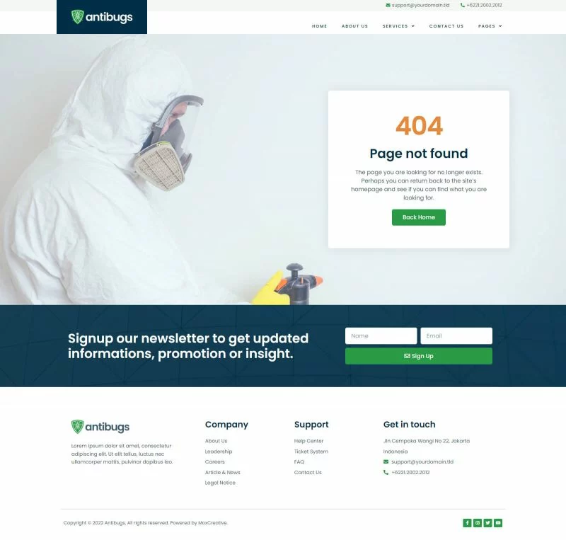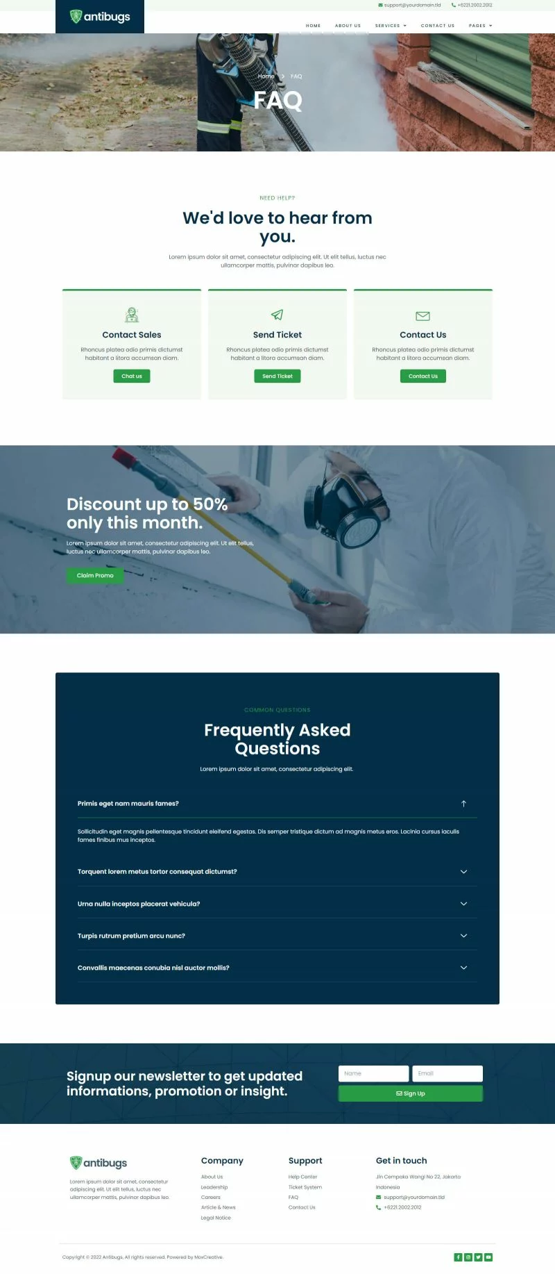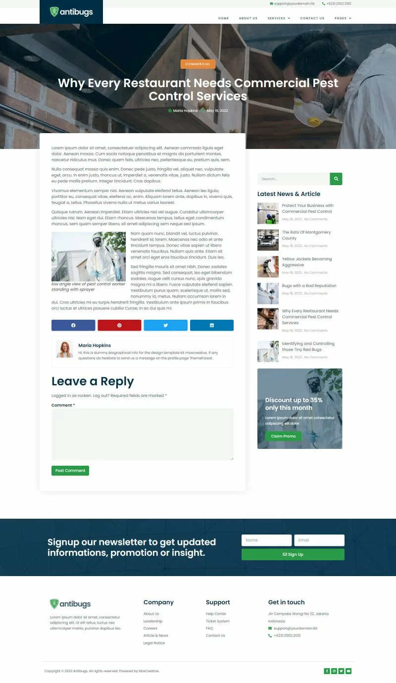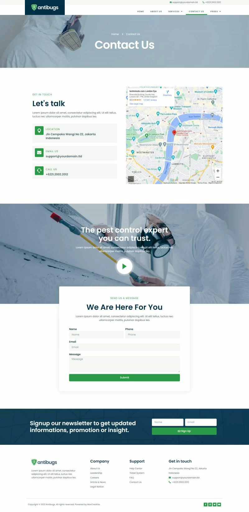 کیت قالب المنتور خدمات کنترل آفات Antibugs به شما کمک میکند تا هر نوع وبسایت مرتبط با خدمات کنترل آفات ایجاد کنید، از جمله کنترل آفات، کنترل پشه، کنترل موش و سوسک، کنترل سوسک خواب و هر خدمات دیگر مرتبط با کنترل آفات. این قالب دارای بیش از 12 قالب آماده با طراحی ساده و استایل مدرن است.