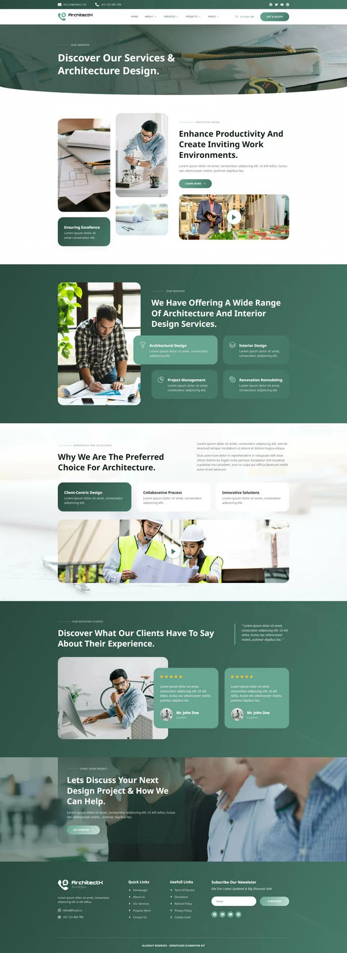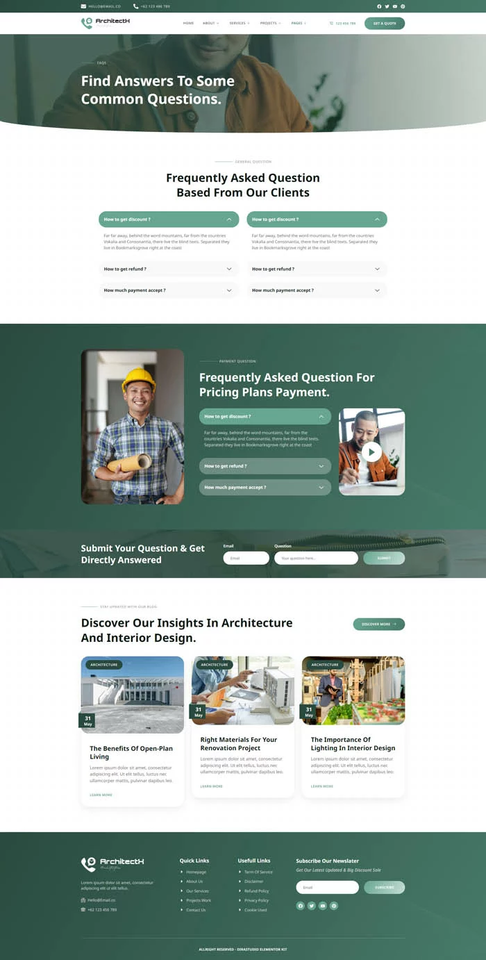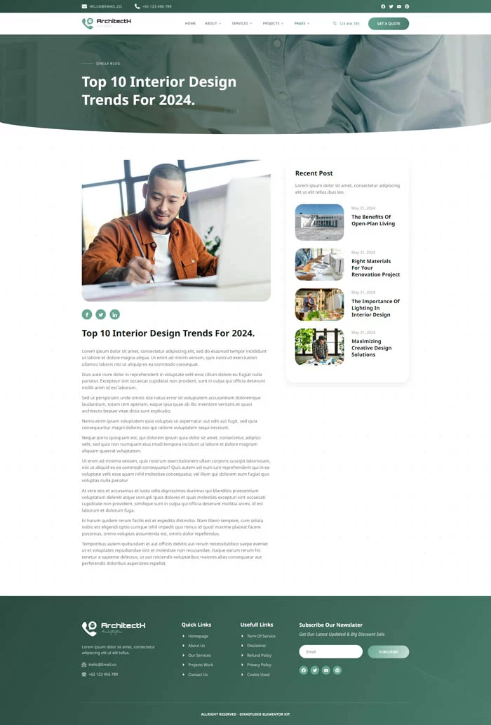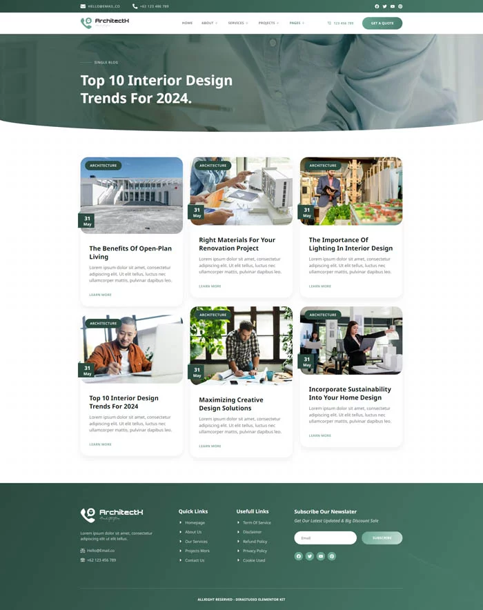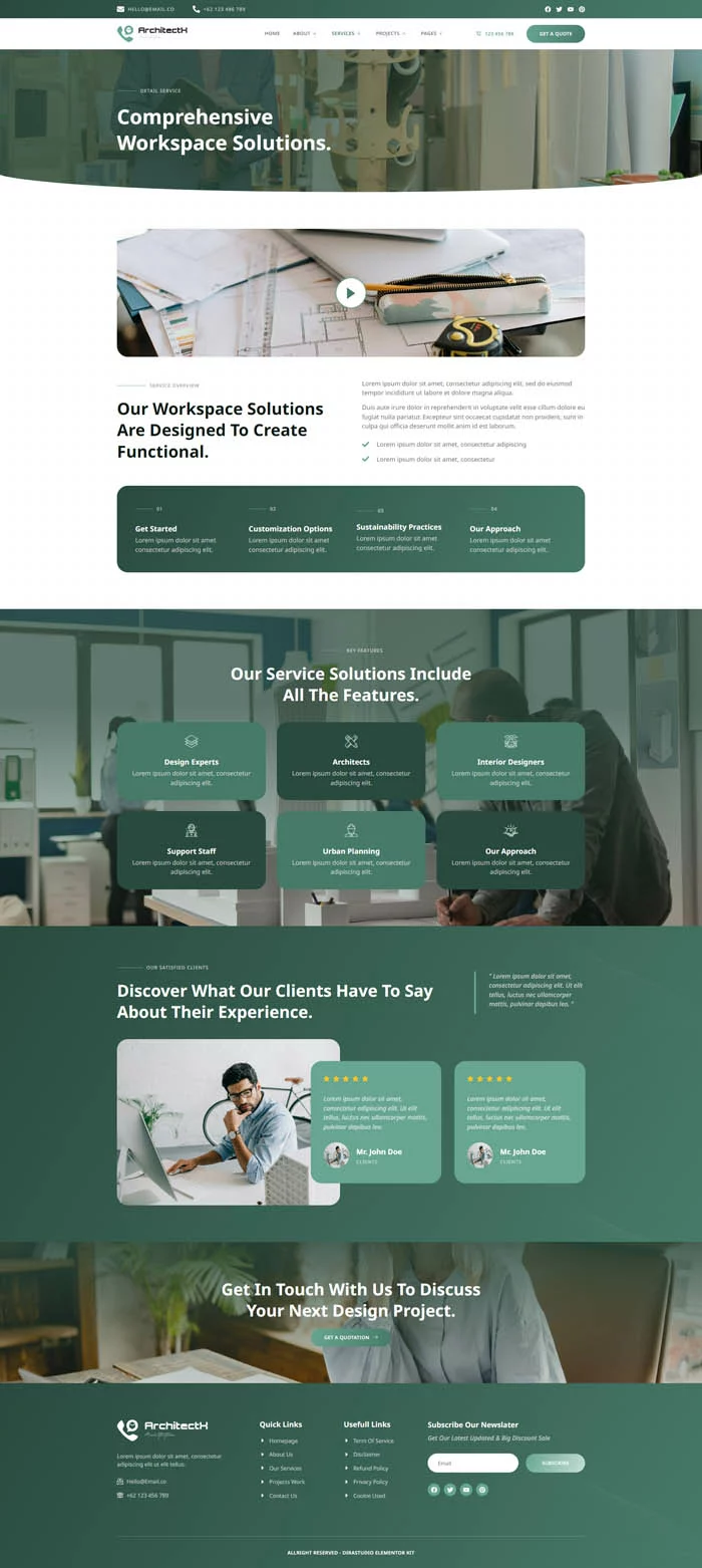 کیت قالب المنتور معماری و طراحی داخلی Architectx برای ساخت سریع و آسان وبسایتهای مربوط به معماری و طراحی داخلی با استفاده از افزونه Elementor Page Builder طراحی شده است. این کیت شامل مجموعهای از صفحات آماده است که بهطور خاص برای نمایش پروژههای معماری و طراحی داخلی، خدمات شما و جذب مشتریان طراحی شدهاند.