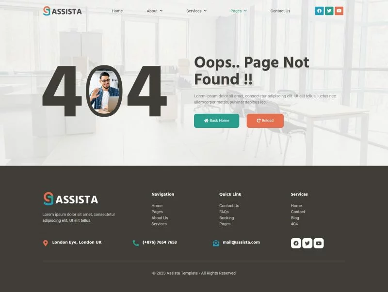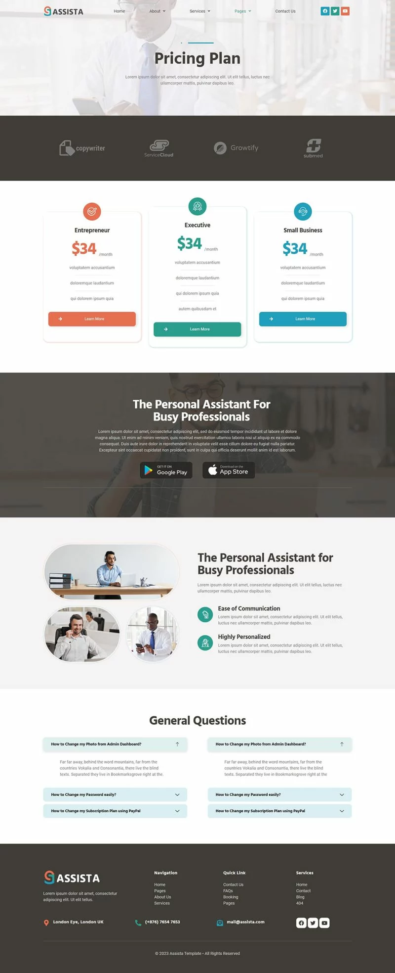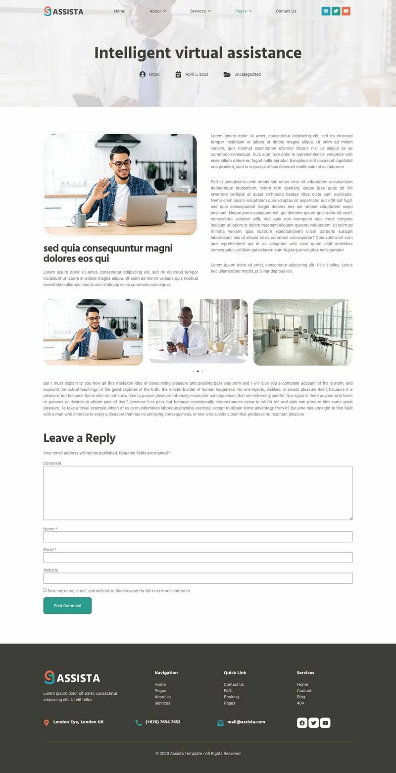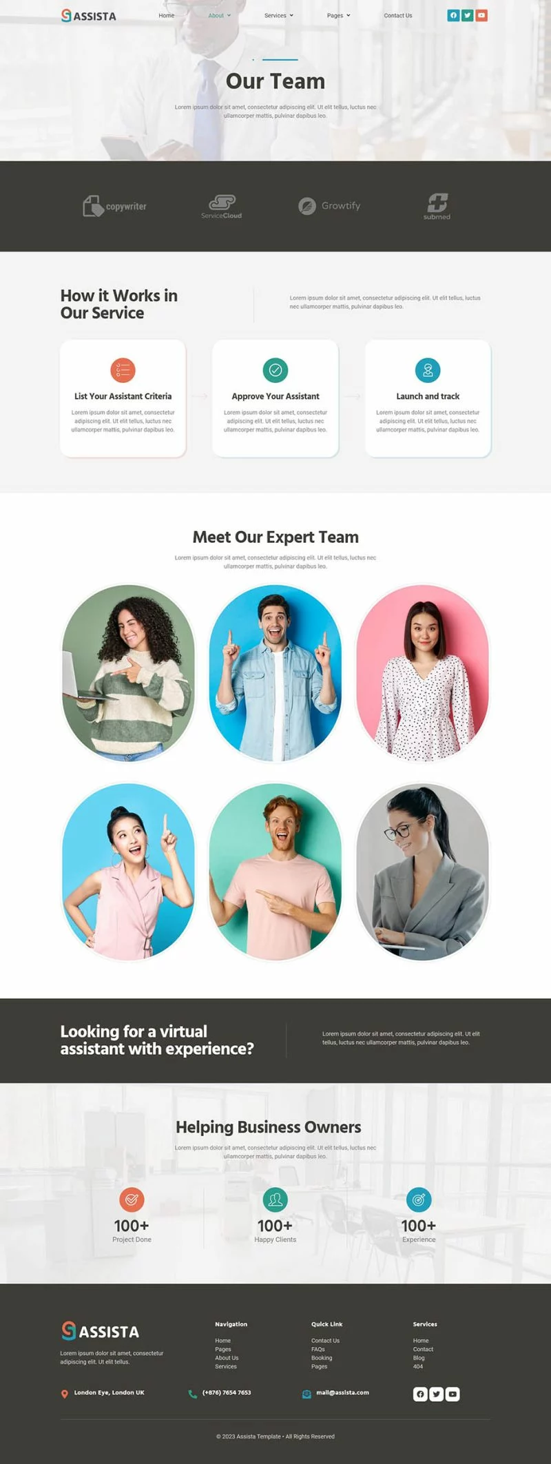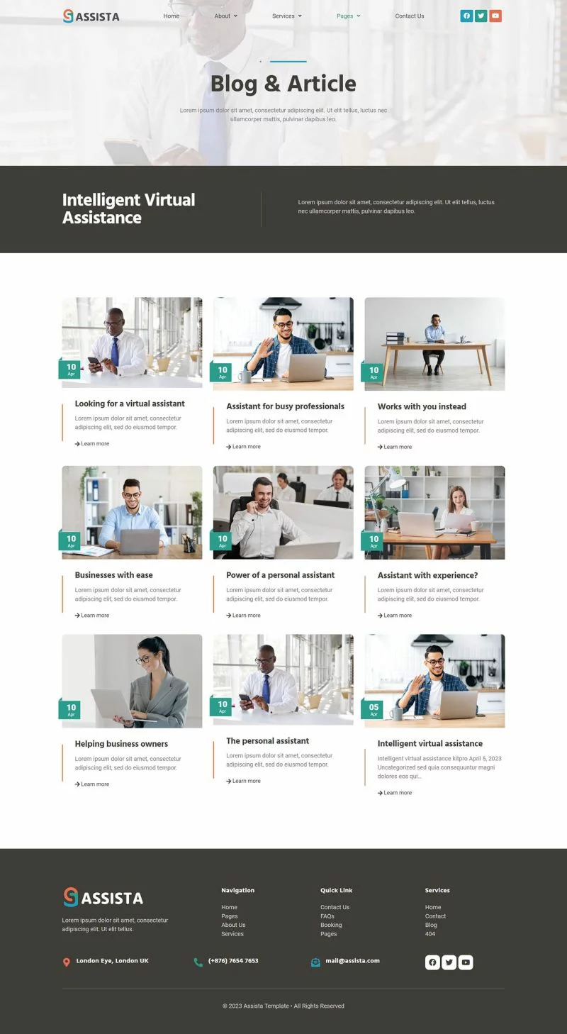 کیت قالب المنتور خدمات دستیار مجازی Assista صفحات مختلفی را ارائه میدهد از جمله صفحه اصلی، درباره ما، تیم، خدمات، خدمات تکی، قیمتگذاری، سوالات متداول، وبلاگ، پست وبلاگ تکی، خطای 404 و تماس با ما.