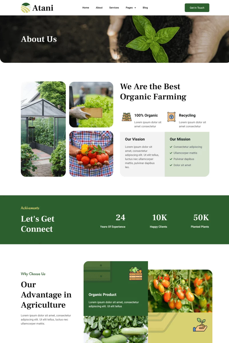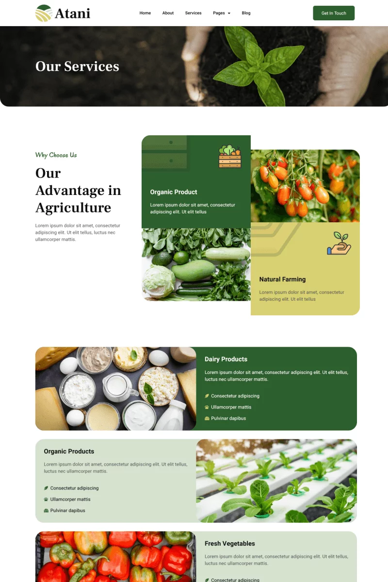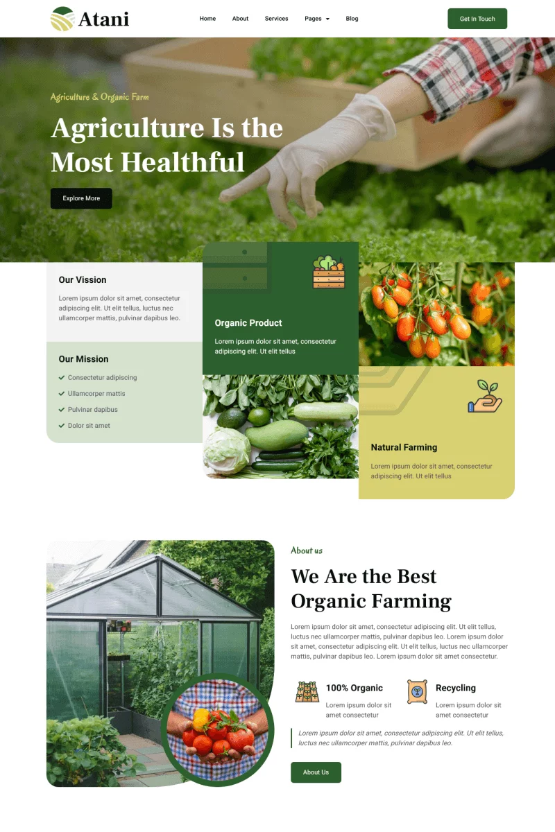 کیت قالب المنتور کشاورزی و مزرعه ارگانیک Atani برای کشاورزی، گلخانهها، باغبانی و موارد دیگر ایدهآل است. با طراحی مدرن و قابلیت سفارشیسازی آسان ساخته شده است. این کیت دارای سیستم طراحی کاملاً سازگار و تصاویر حرفهای و دستچین شده برای شروع پروژه بعدی شما بهصورت پریمیوم و برندینگ شده است. بهینهسازی شده برای استفاده با تم رایگان Hello Elementor، این کیت دقیق، سریعبارگذاری و کاملاً واکنشگرا است.
