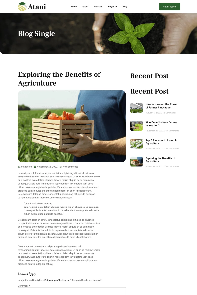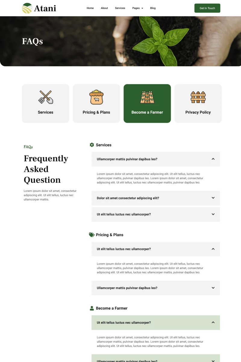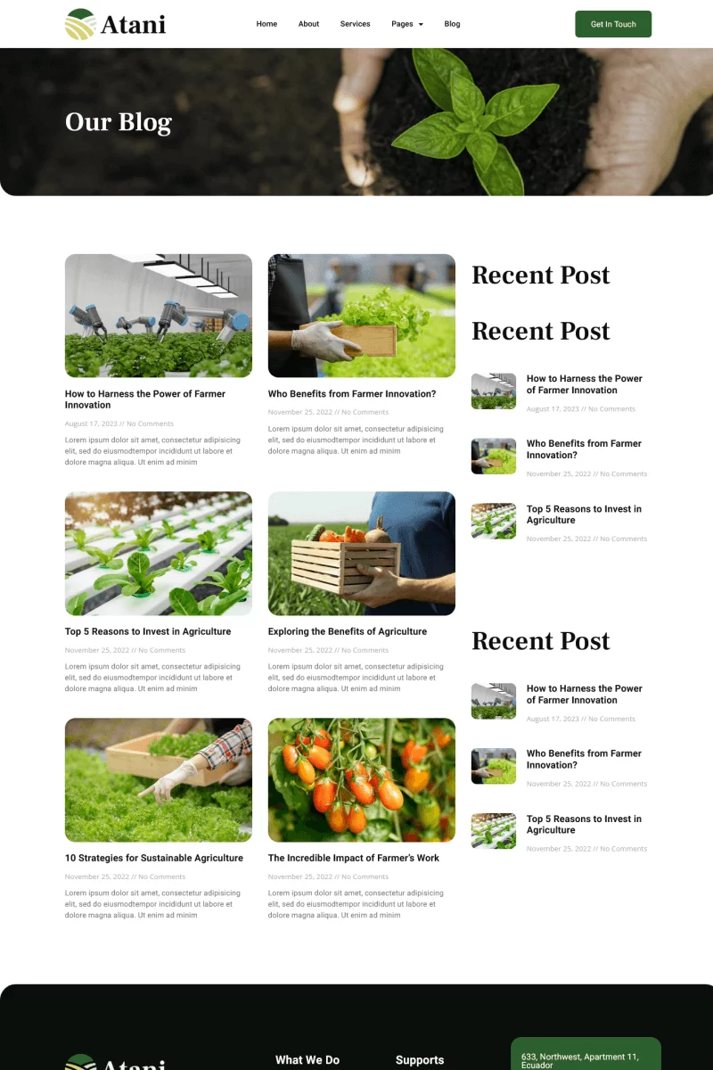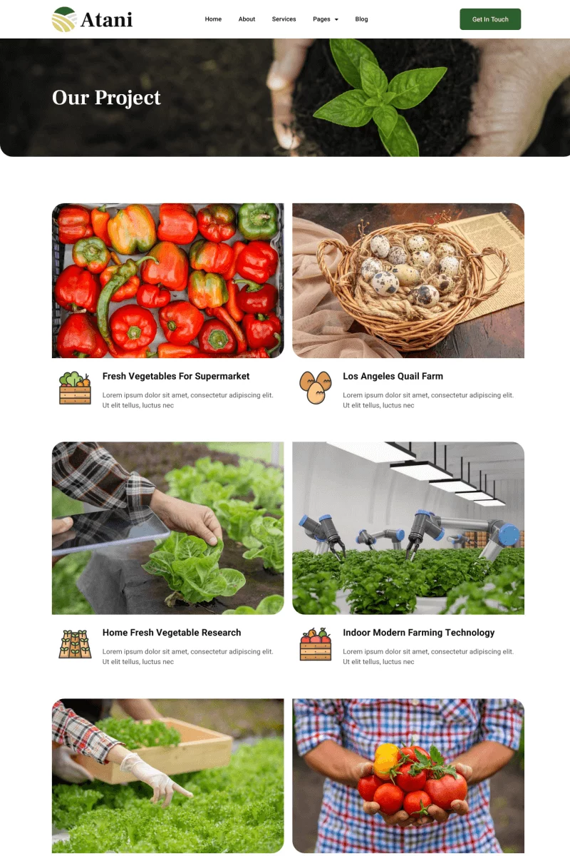 کیت قالب المنتور کشاورزی و مزرعه ارگانیک Atani برای کشاورزی، گلخانهها، باغبانی و موارد دیگر ایدهآل است. با طراحی مدرن و قابلیت سفارشیسازی آسان ساخته شده است. این کیت دارای سیستم طراحی کاملاً سازگار و تصاویر حرفهای و دستچین شده برای شروع پروژه بعدی شما بهصورت پریمیوم و برندینگ شده است. بهینهسازی شده برای استفاده با تم رایگان Hello Elementor، این کیت دقیق، سریعبارگذاری و کاملاً واکنشگرا است.