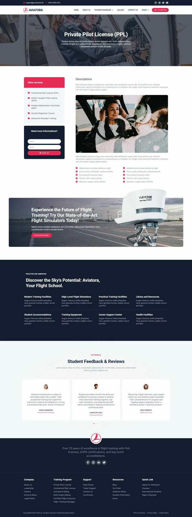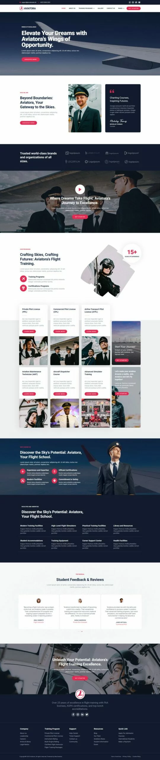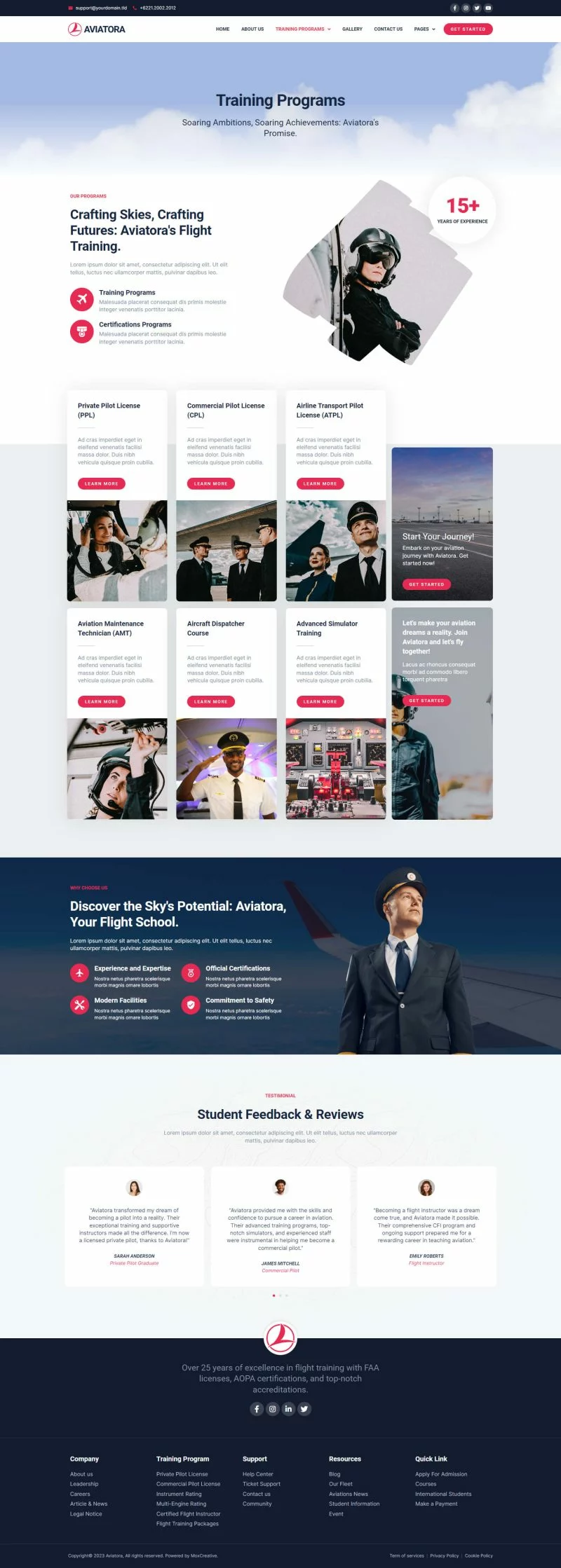 کیت قالب المنتور آموزش خلبانی Aviatora دارای ظاهری تمیز، مدرن و حرفهای است. شما میتوانید به راحتی یک وبسایت مدرن در زمینه هوانوردی، مدرسه خلبانی، آکادمی خلبانی، آموزش خدمه کابین و مهمانداران هواپیما، صنعت هوانوردی یا هر کسب و کار مرتبط دیگری ایجاد کنید.