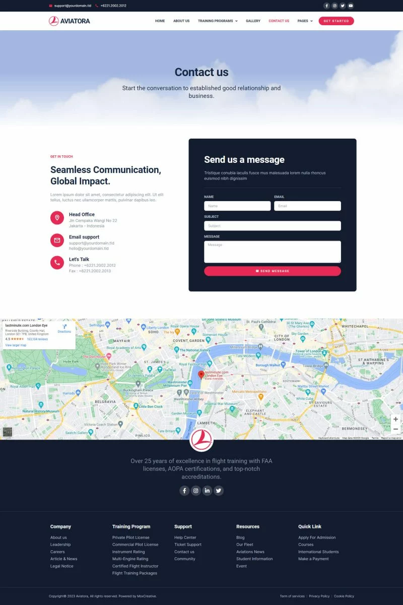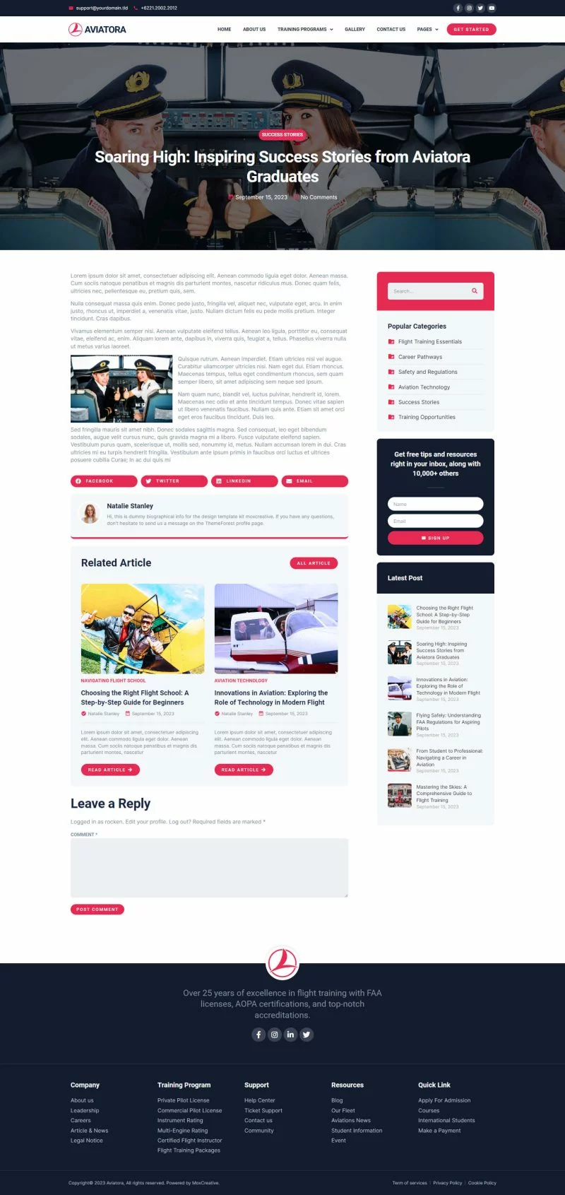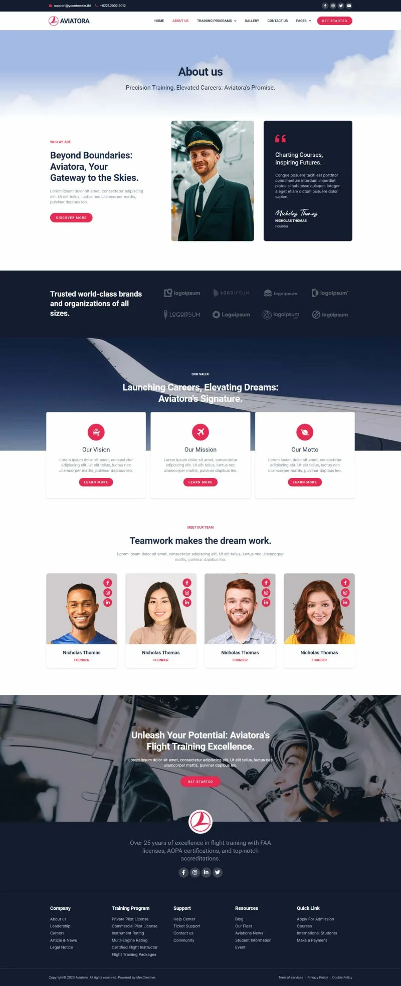 کیت قالب المنتور آموزش خلبانی Aviatora دارای ظاهری تمیز، مدرن و حرفهای است. شما میتوانید به راحتی یک وبسایت مدرن در زمینه هوانوردی، مدرسه خلبانی، آکادمی خلبانی، آموزش خدمه کابین و مهمانداران هواپیما، صنعت هوانوردی یا هر کسب و کار مرتبط دیگری ایجاد کنید.