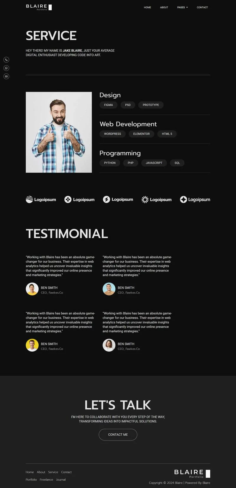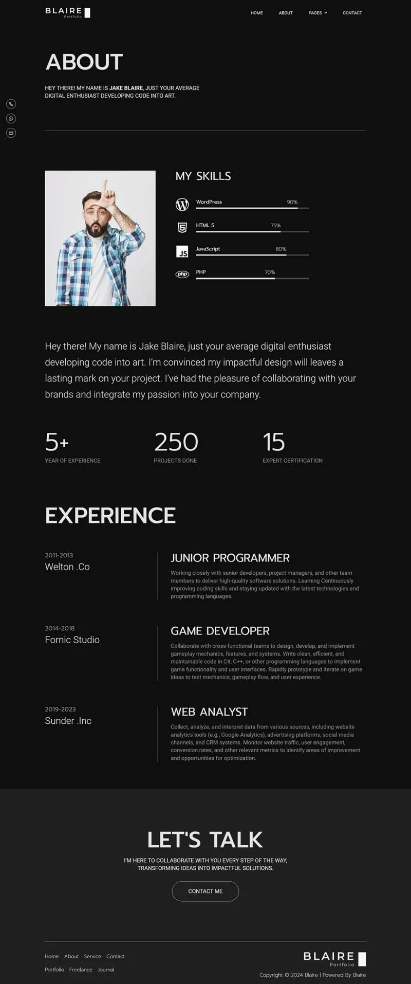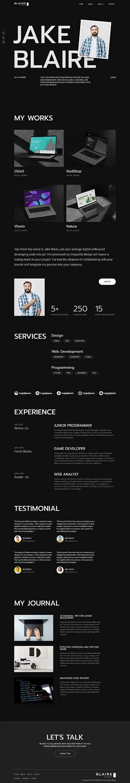 کیت قالب المنتور نمونه کار Blaire برای ایجاد وبسایت نمونه کار شخصی طراحی شده است. این قالب با استفاده از نسخه رایگان المنتور ساخته شده و به راحتی قابل استفاده است.