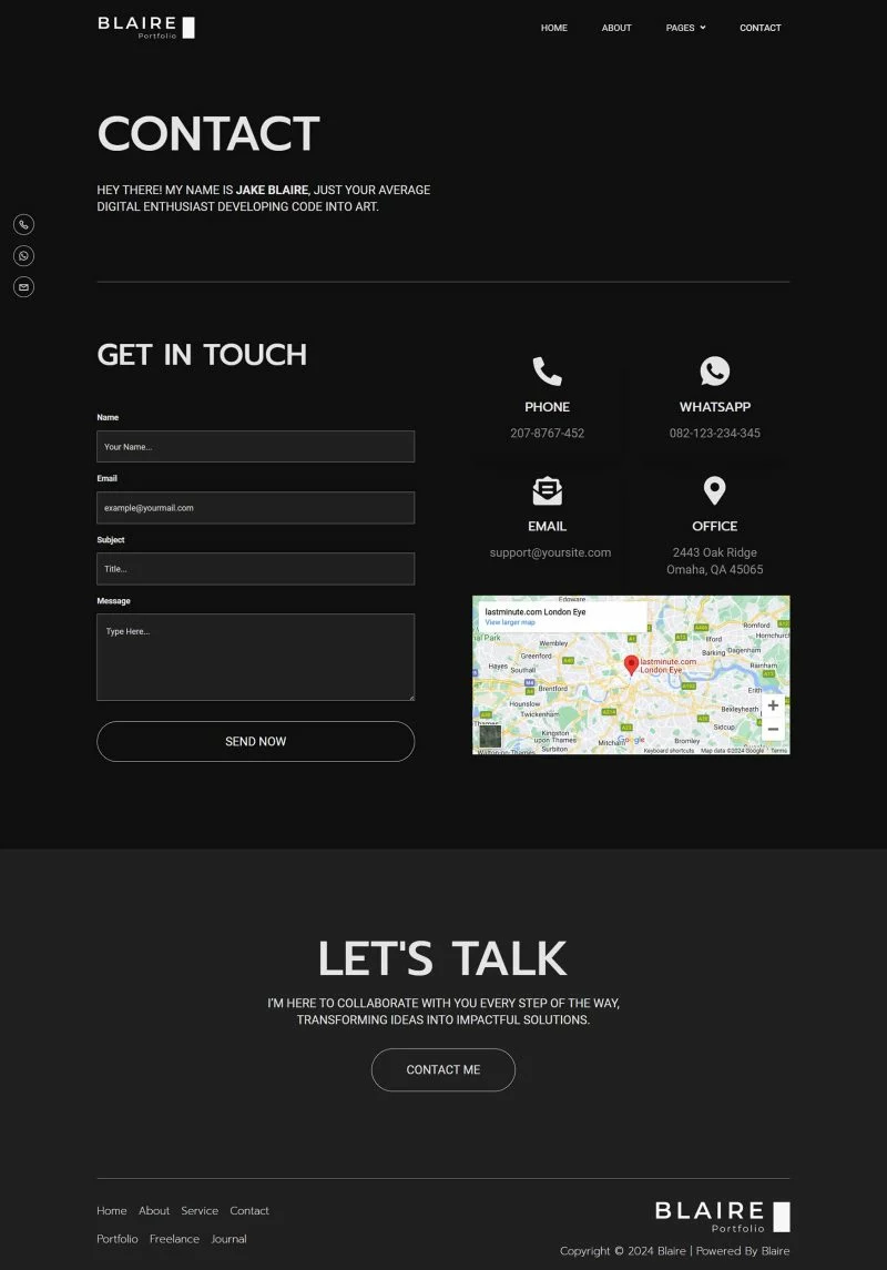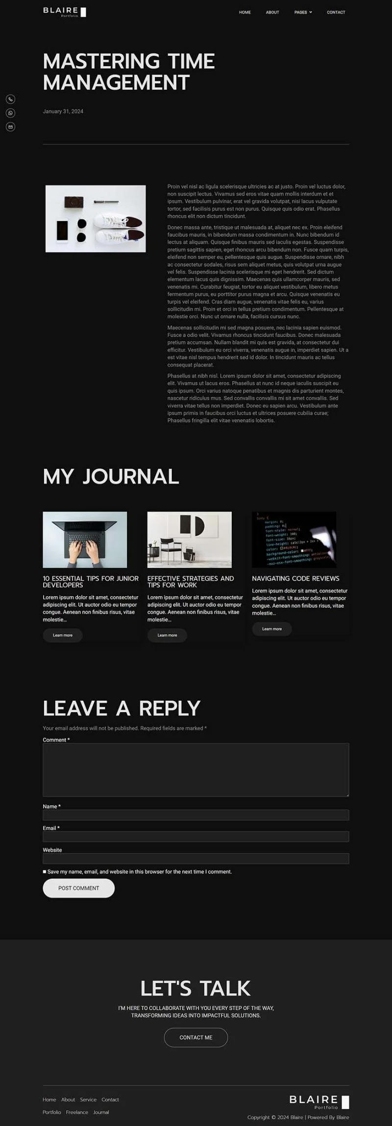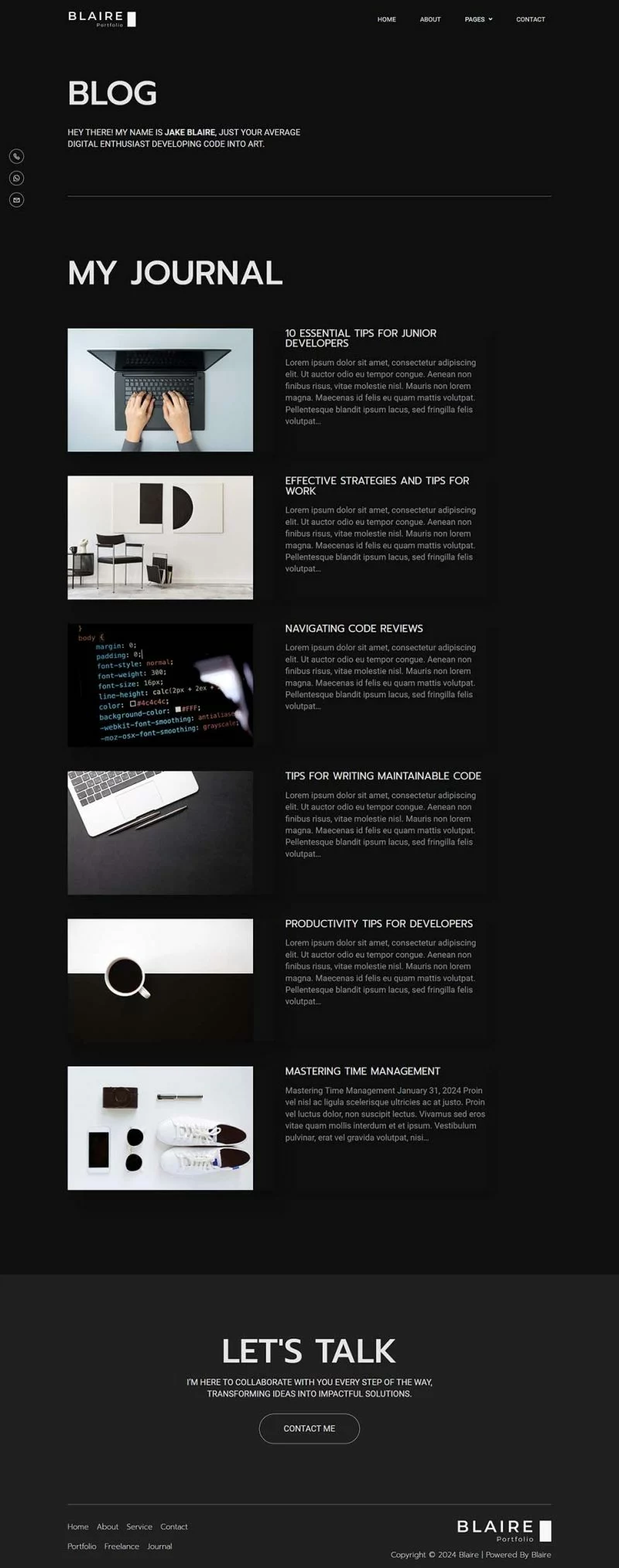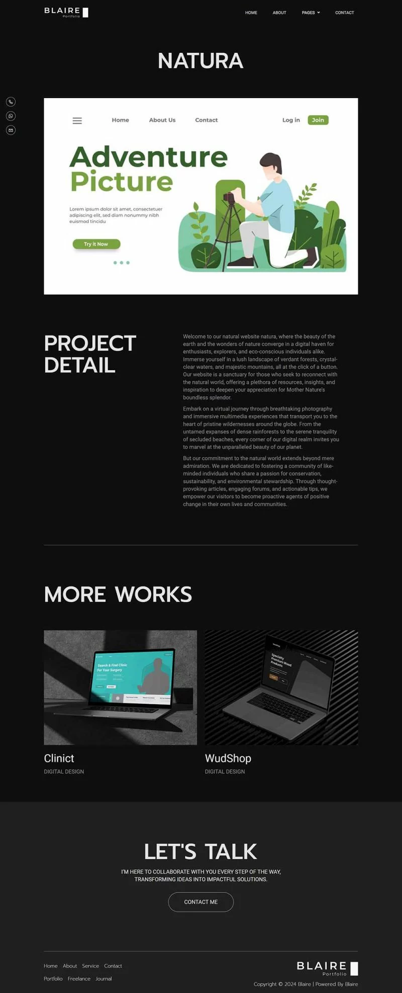 کیت قالب المنتور نمونه کار Blaire برای ایجاد وبسایت نمونه کار شخصی طراحی شده است. این قالب با استفاده از نسخه رایگان المنتور ساخته شده و به راحتی قابل استفاده است.