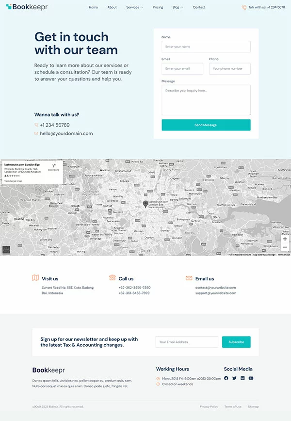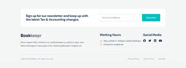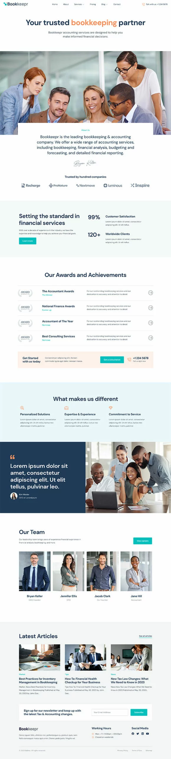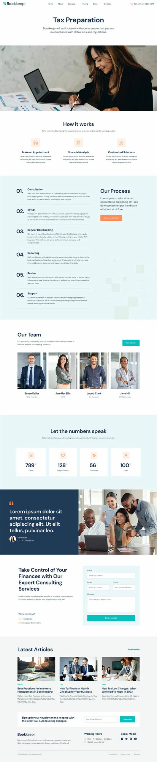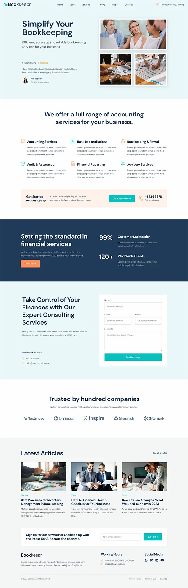 با گزینههای سفارشیسازی آسان BookKeepr و رابط کاربری دوستانه، میتوانید بدون نیاز به دانش کدنویسی، هر جنبهای از وبسایت خود را به راحتی شخصیسازی کنید. برند و خدمات خود را با اطمینان به نمایش بگذارید، خواه یک حرفهای مستقر باشید یا تازه در این زمینه شروع کرده باشید.