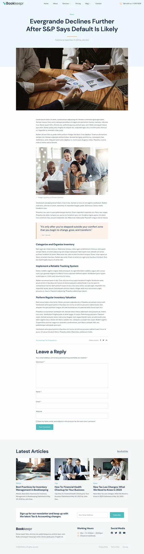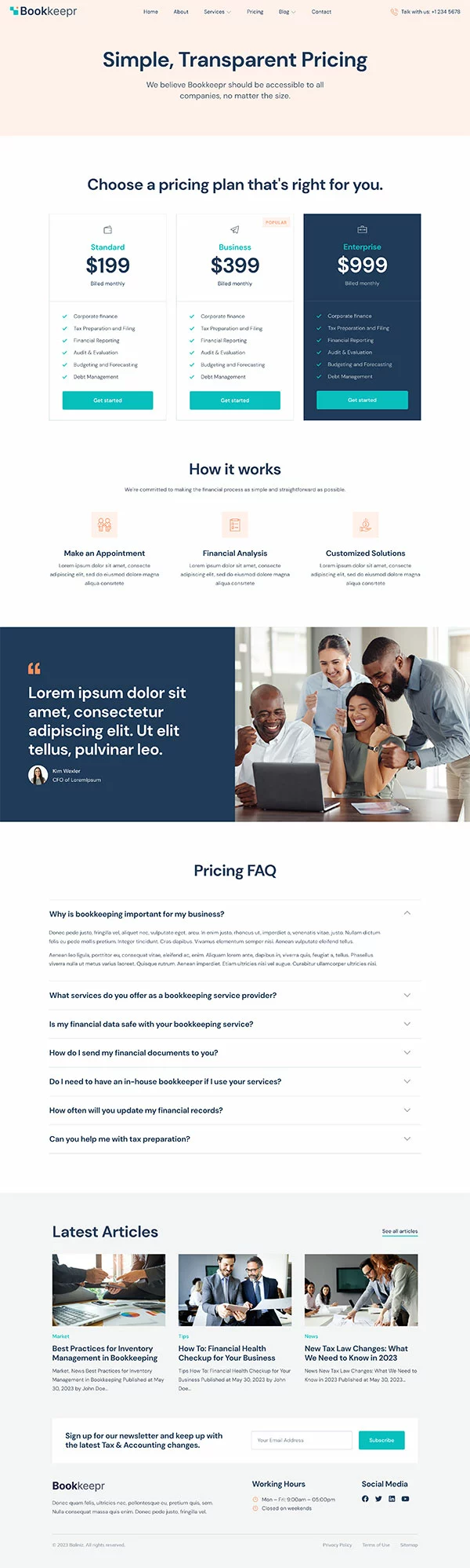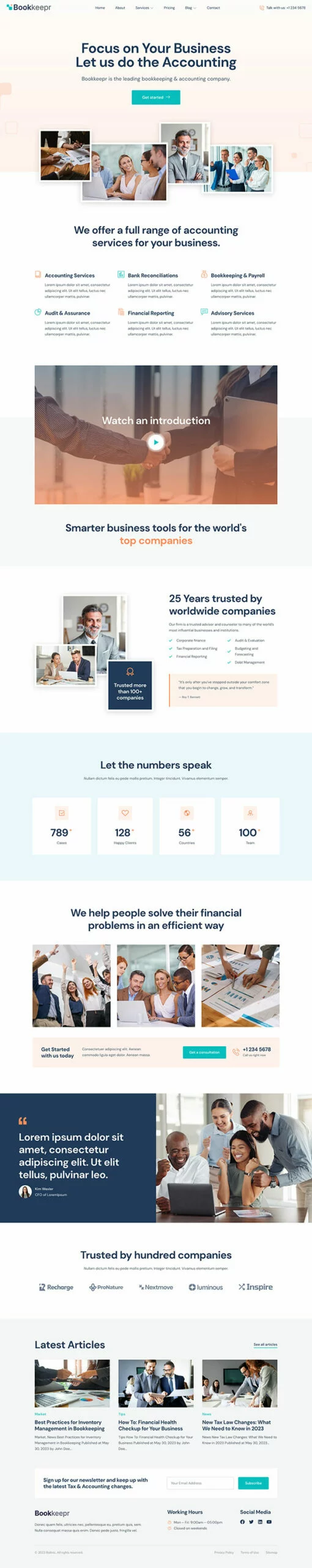 کیت قالب المنتور خدمات حسابداری و دفترداری BookKeepr، یک کیت مدرن و تمیز است که به طور خاص برای شرکتهای خدمات حسابداری و دفترداری، آژانسهای حسابداری، شرکتهای حسابداری، مشاوران مالی، حسابداران، گزارشدهی مالیاتی، مشاوره حسابداری و سایر ارائهدهندگان خدمات حسابداری طراحی شده است. این کیت قالب دارای طراحی حرفهای با یک طرح کاملاً پاسخگو است که اطمینان میدهد وبسایت شما در تمامی دستگاهها بینقص به نظر میرسد. همچنین دارای گرافیک آماده رتینا است که تجربه بصری خیرهکنندهای را ارائه میدهد.