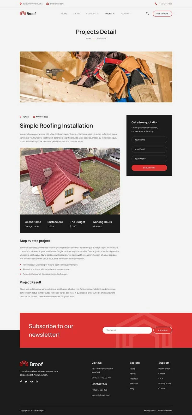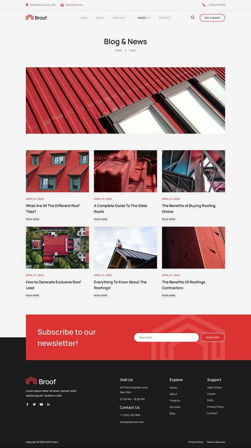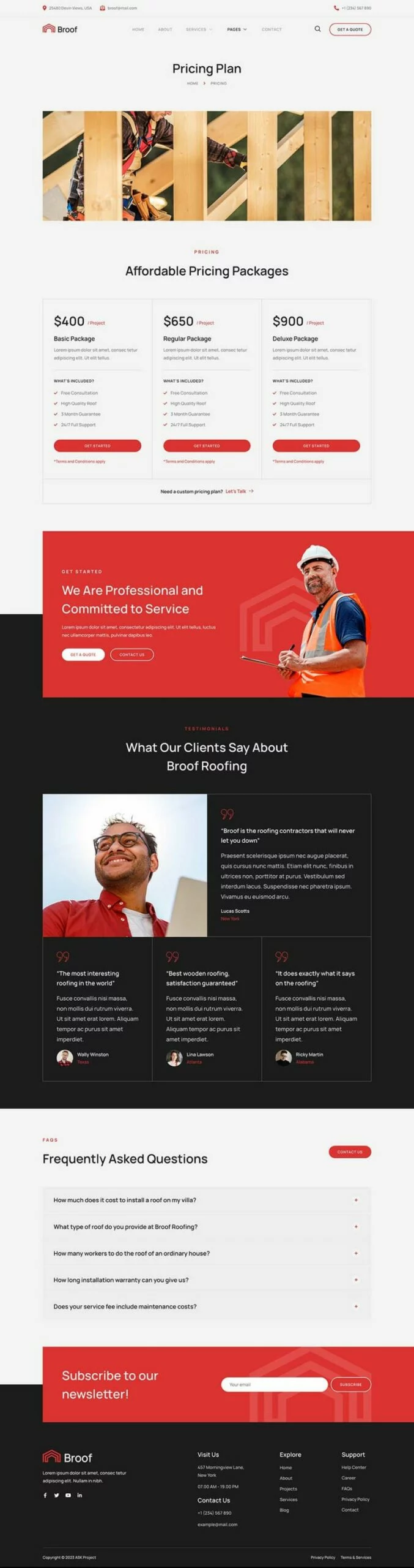 کیت قالب المنتور Broof برای خدمات سقفسازی مانند تعمیر سقف، خدمات سقف، پوشش سقف، بازرسی سقف، نوسازی سقف و غیره طراحی شده است. Broof دارای طراحی ساده، مدرن و تمیز با طرحبندی 100٪ پاسخگو است و بسیار آسان برای سفارشیسازی بوده و میتواند توسط هر کسی بدون نیاز به درک کدنویسی استفاده شود. این کیت قالب شامل 13 صفحه و 19 قالب آماده است که شما میتوانید به راحتی وبسایت حرفهای خود را تنها با چند کلیک ایجاد کنید.