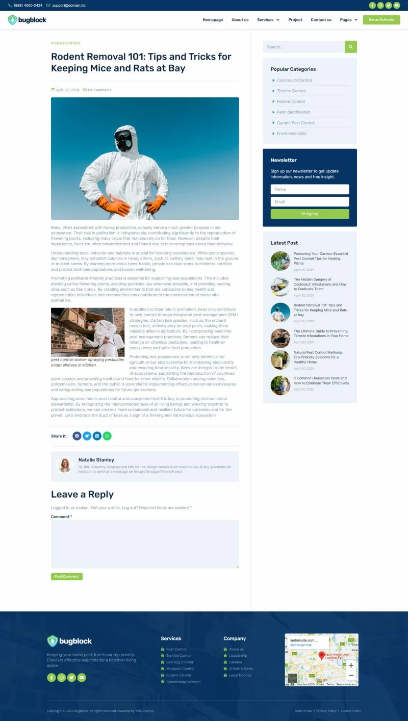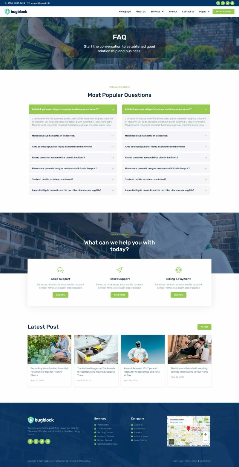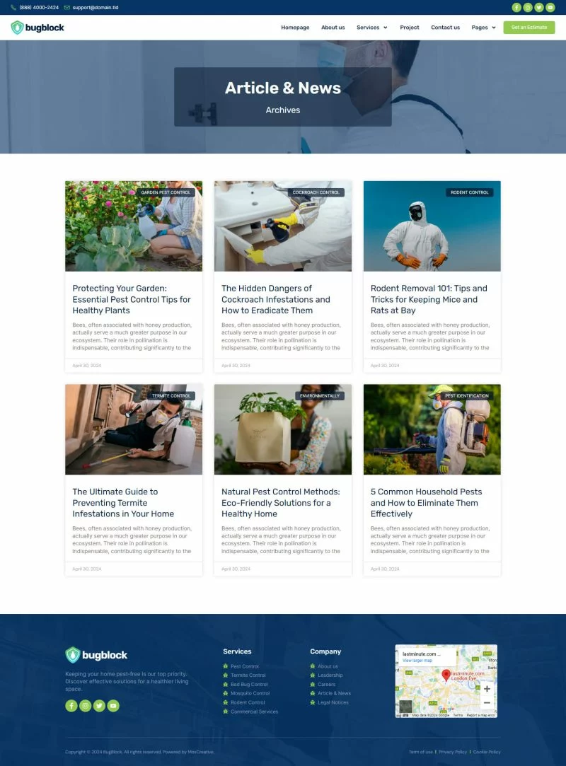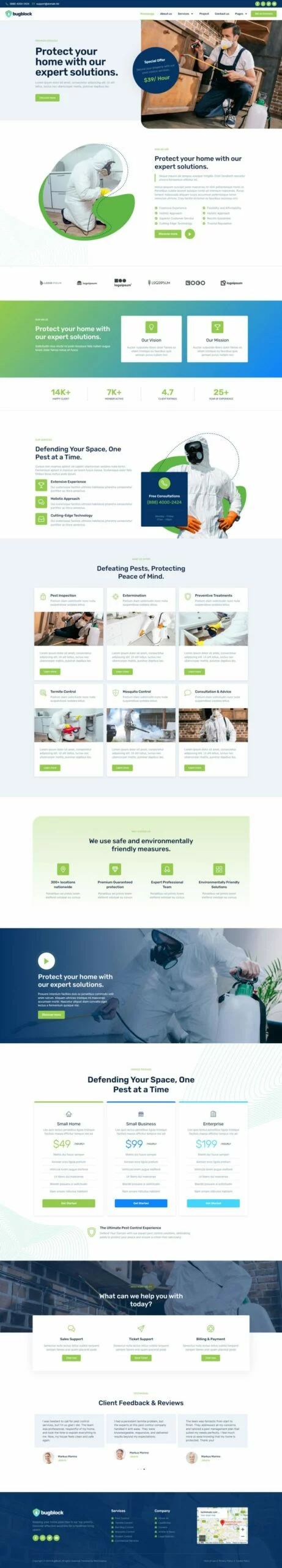 کیت قالب المنتور خدمات کنترل آفات BugBlock به شما کمک میکند تا هر وبسایتی مرتبط با خدمات کنترل آفات، مانند کنترل حشرات، کنترل پشه، کنترل جوندگان، کنترل ساس و هر خدمات مرتبط با کنترل آفات را ایجاد کنید. این کیت قالب دارای بیش از 12 قالب از پیشساخته با طراحی تمیز و سبک مدرن است.