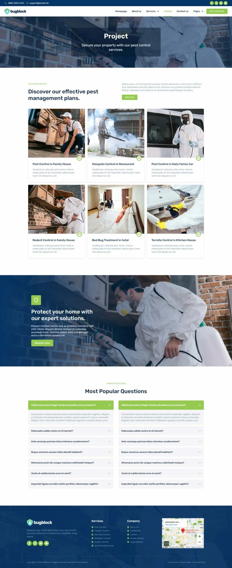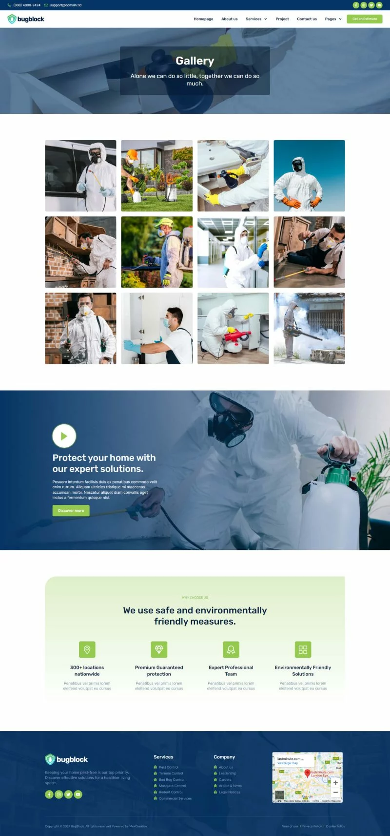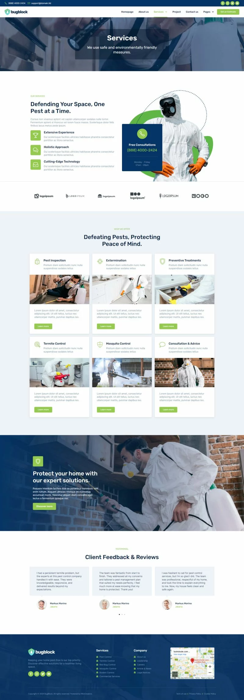 کیت قالب المنتور خدمات کنترل آفات BugBlock به شما کمک میکند تا هر وبسایتی مرتبط با خدمات کنترل آفات، مانند کنترل حشرات، کنترل پشه، کنترل جوندگان، کنترل ساس و هر خدمات مرتبط با کنترل آفات را ایجاد کنید. این کیت قالب دارای بیش از 12 قالب از پیشساخته با طراحی تمیز و سبک مدرن است.