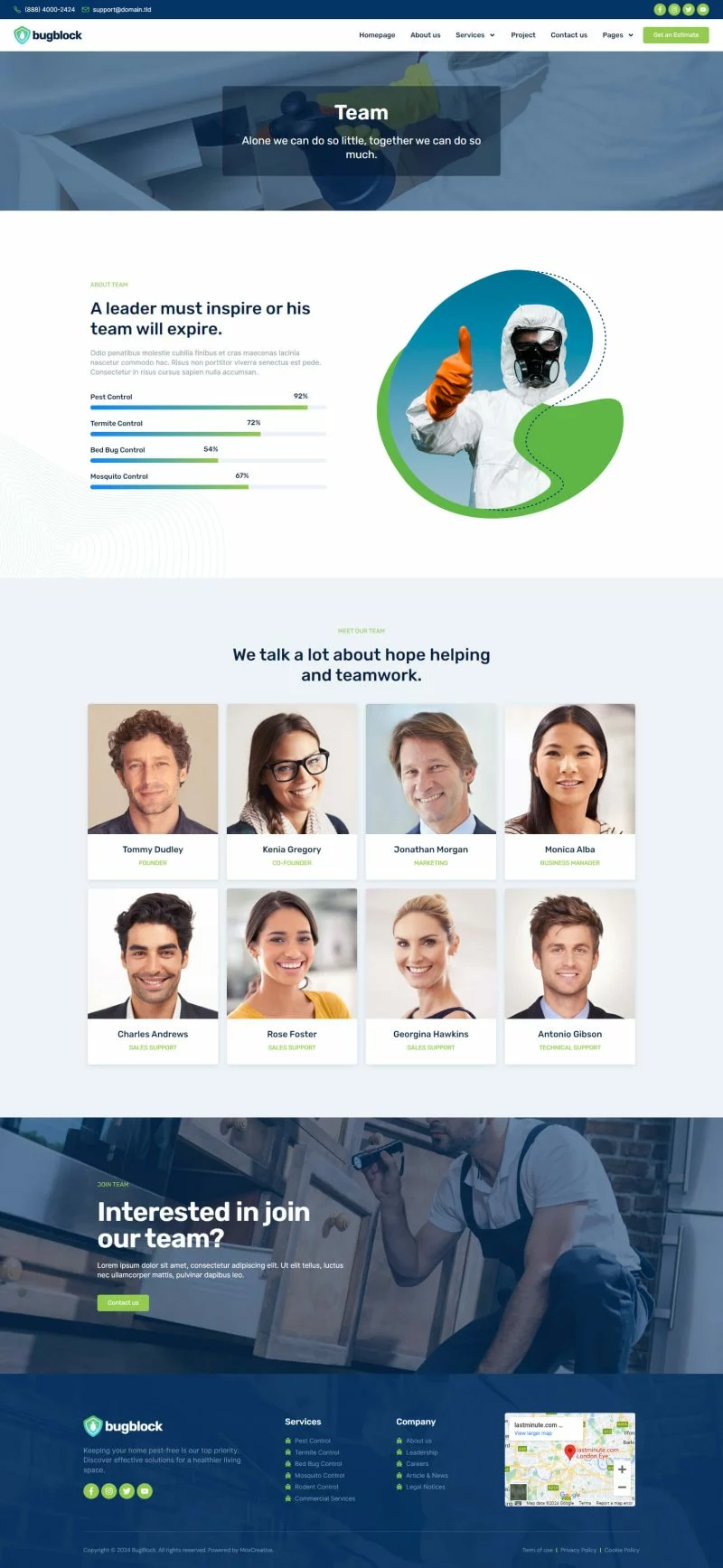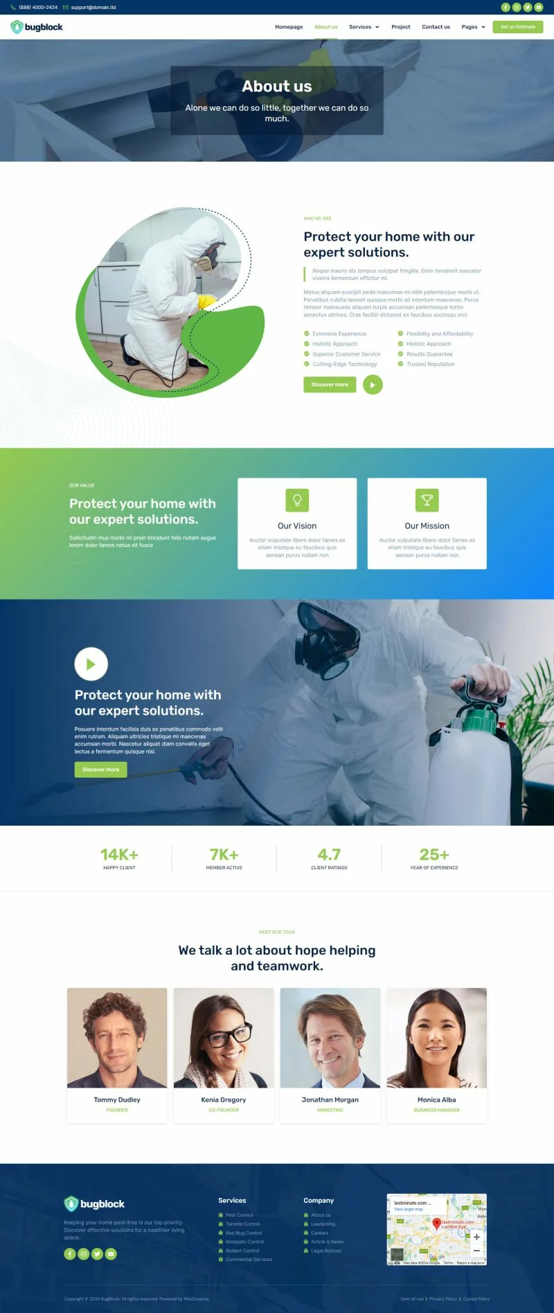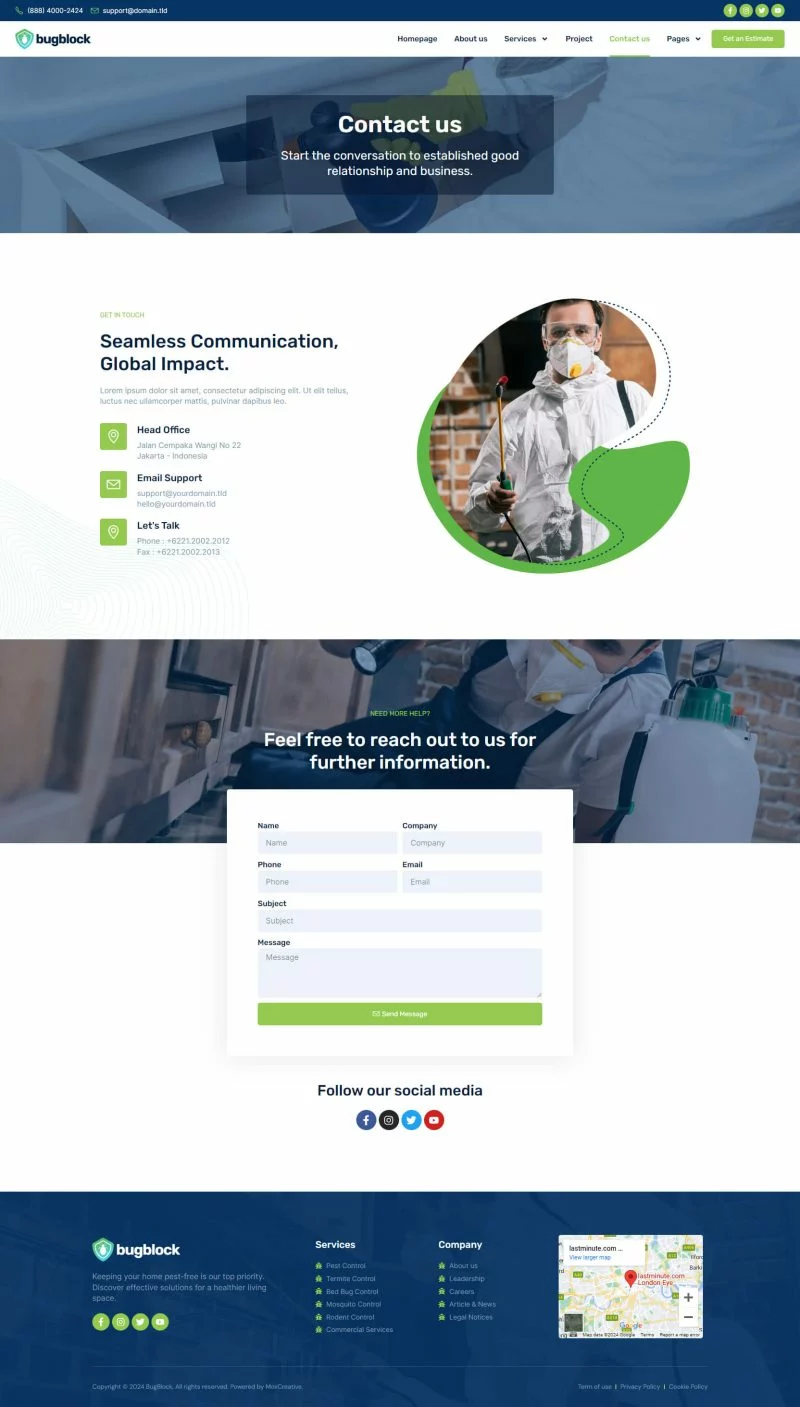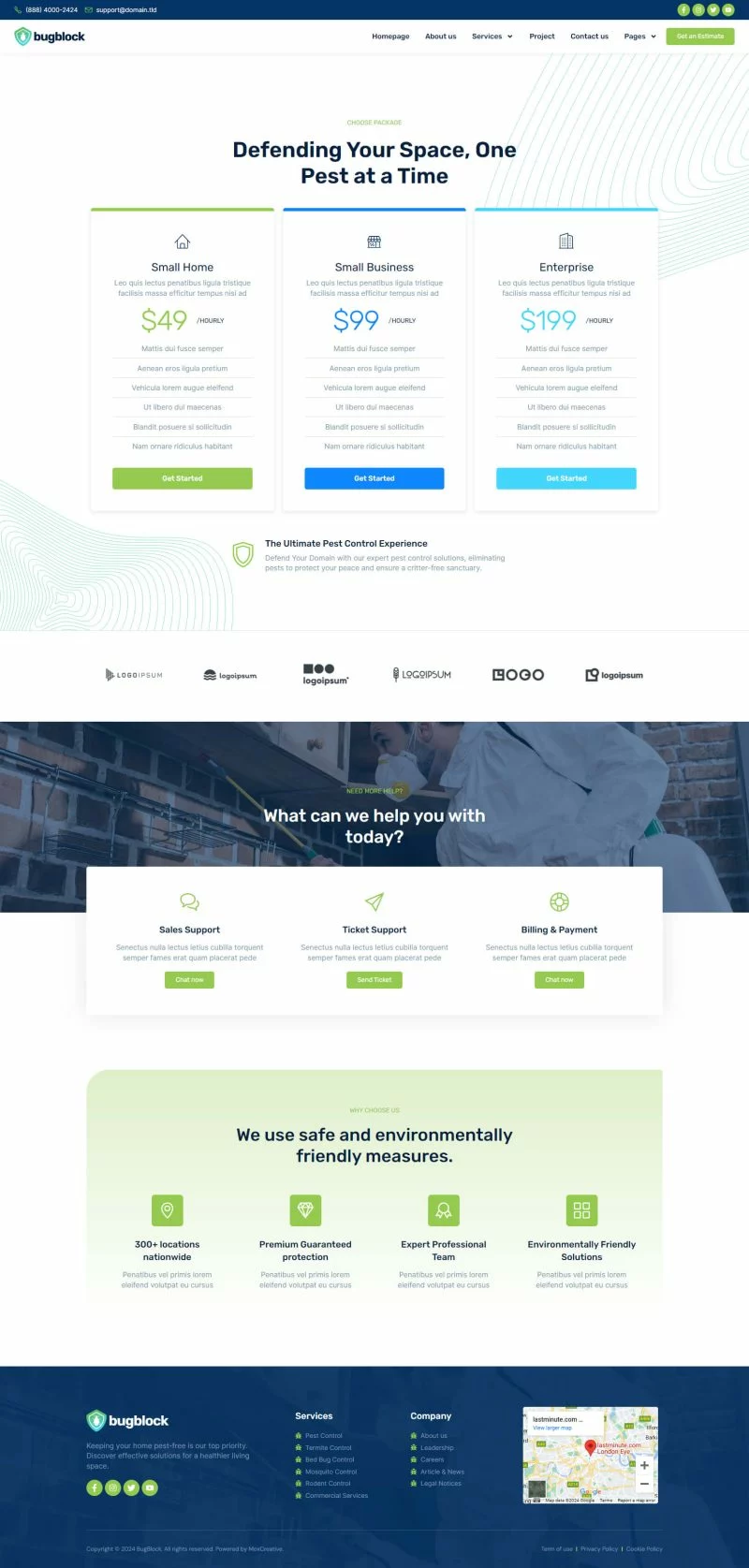 کیت قالب المنتور خدمات کنترل آفات BugBlock به شما کمک میکند تا هر وبسایتی مرتبط با خدمات کنترل آفات، مانند کنترل حشرات، کنترل پشه، کنترل جوندگان، کنترل ساس و هر خدمات مرتبط با کنترل آفات را ایجاد کنید. این کیت قالب دارای بیش از 12 قالب از پیشساخته با طراحی تمیز و سبک مدرن است.