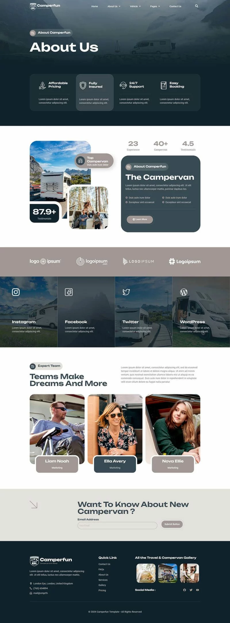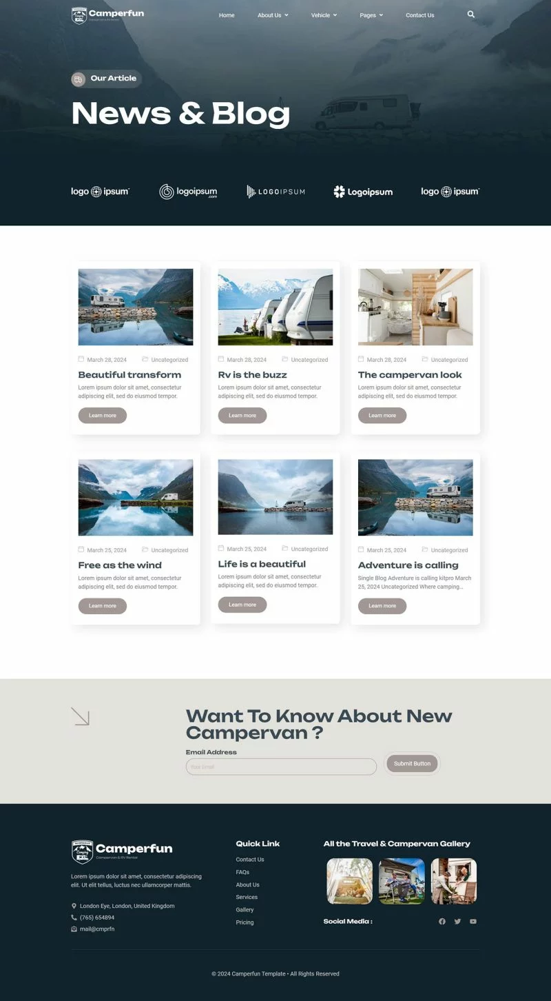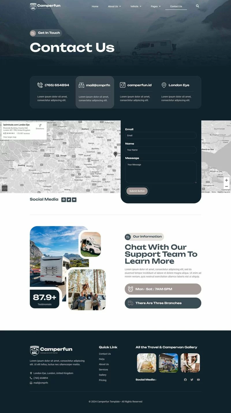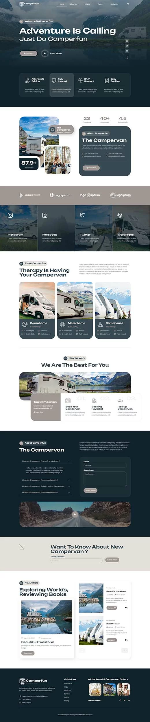 کیت قالب المنتور کمپینگ و اجاره Camperfun به شما این امکان را میدهد که به سرعت و بهراحتی وبسایتی برای کسبوکار کمپینگ و اجاره وسایل نقلیه خود ایجاد کنید. با استفاده از قابلیت کشیدن و رها کردن المنتور، نیازی به کدنویسی نیست و شما میتوانید به سادگی فونتها و رنگها را در یک مکان سفارشیسازی کنید یا بر روی عناصر جداگانه تنظیمات دقیقتری انجام دهید. طراحی مدرن و حرفهای این کیت، همراه با زمان بارگذاری سریع، تجربه کاربری بینظیری را فراهم میکند. این کیت با اکثر قالبهای المنتور سازگار است و به شما اجازه میدهد وبسایتی زیبا و کارآمد بسازید که مشتریان شما را جذب کند.