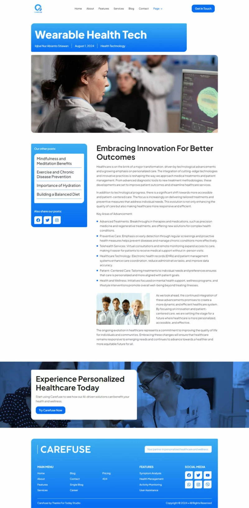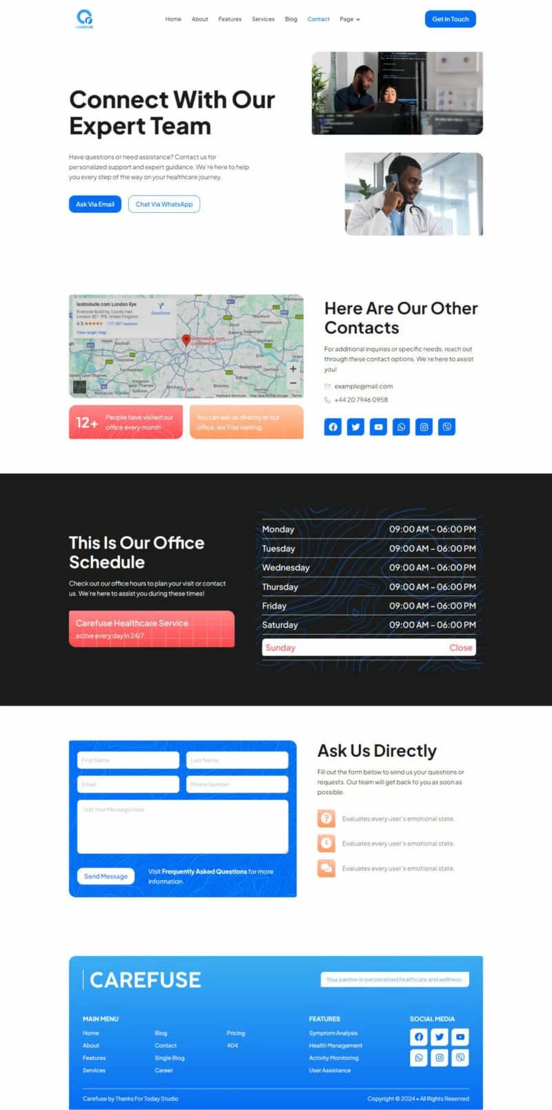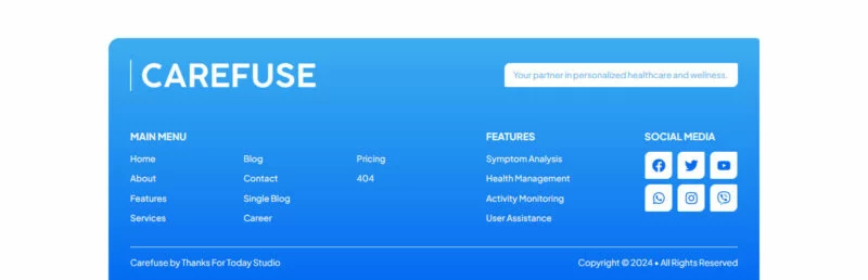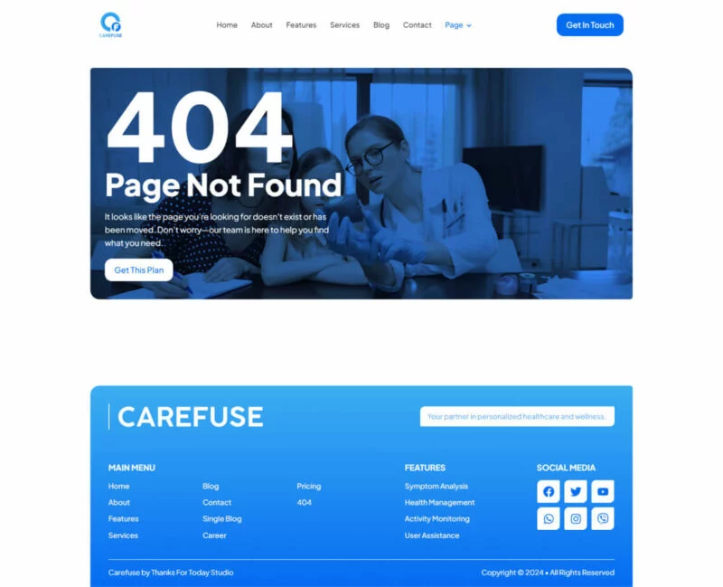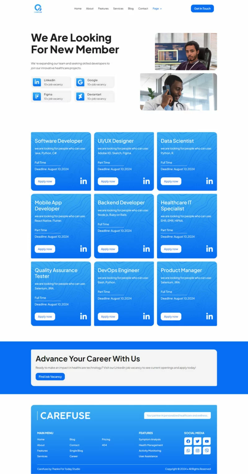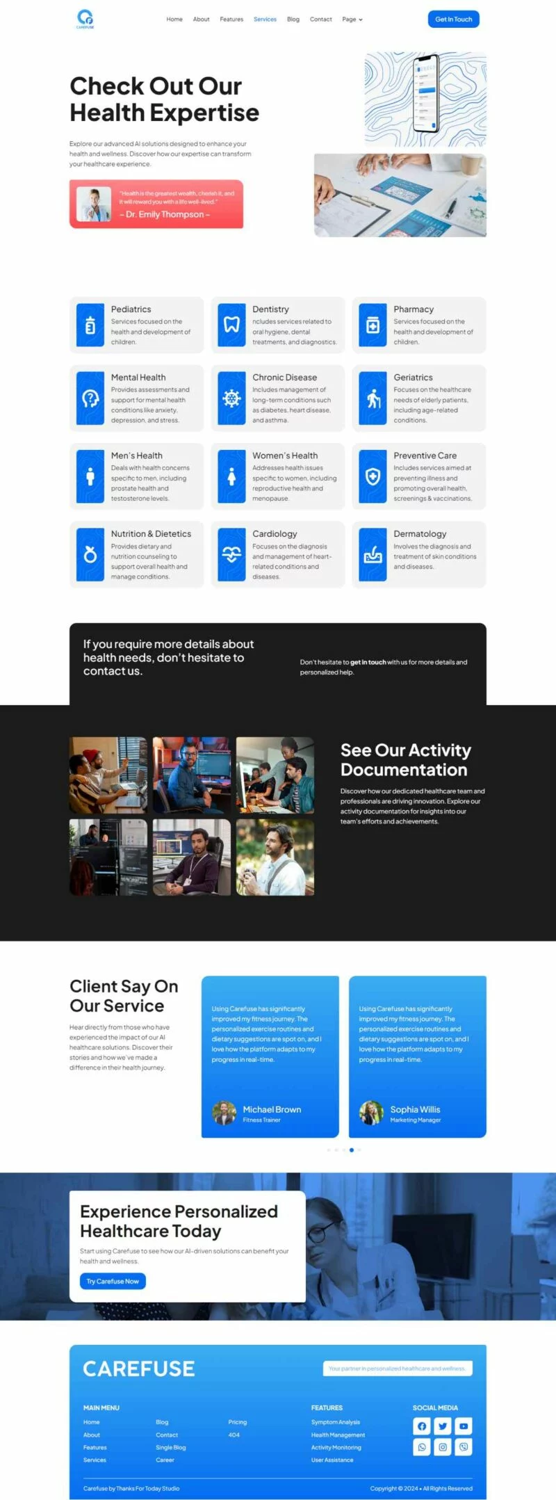 یکی از ویژگیهای برجسته Carefuse، وجود صفحات از پیش ساخته شده مانند ویژگیها، خدمات و فرصتهای شغلی است که به شما امکان میدهد تمامی اطلاعات ضروری را به شکلی حرفهای به نمایش بگذارید. این قالب همچنین با فونتهای مدرن و آیکونهای Material Icons طراحی شده تا تجربه کاربری بهتری را برای بازدیدکنندگان فراهم کند.