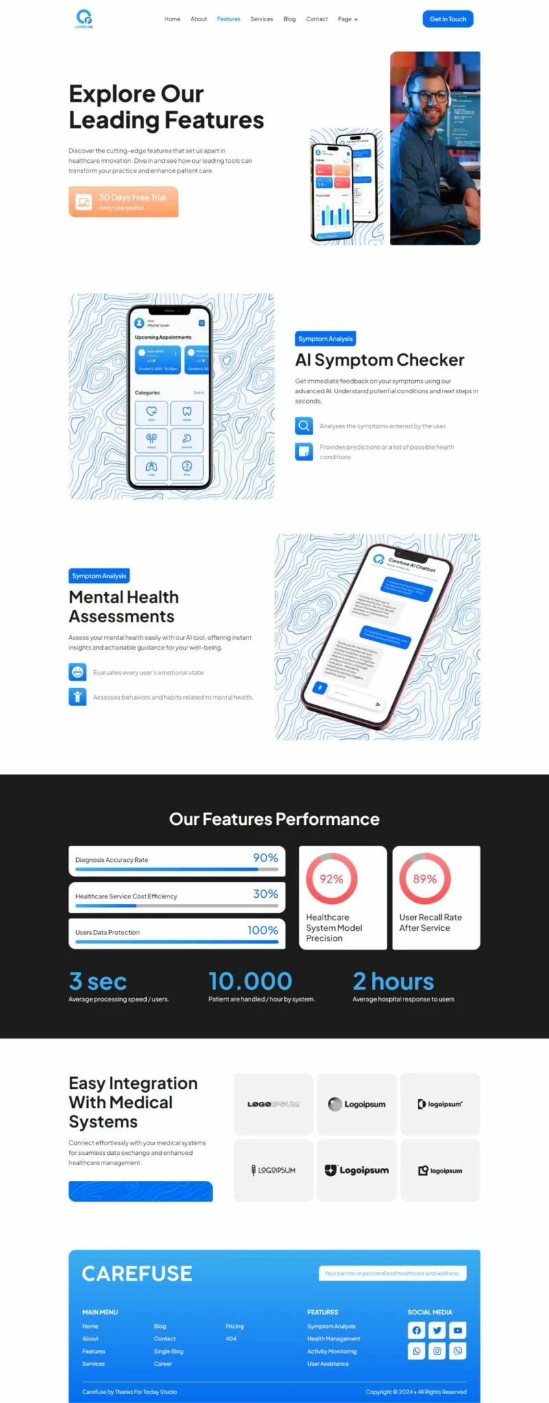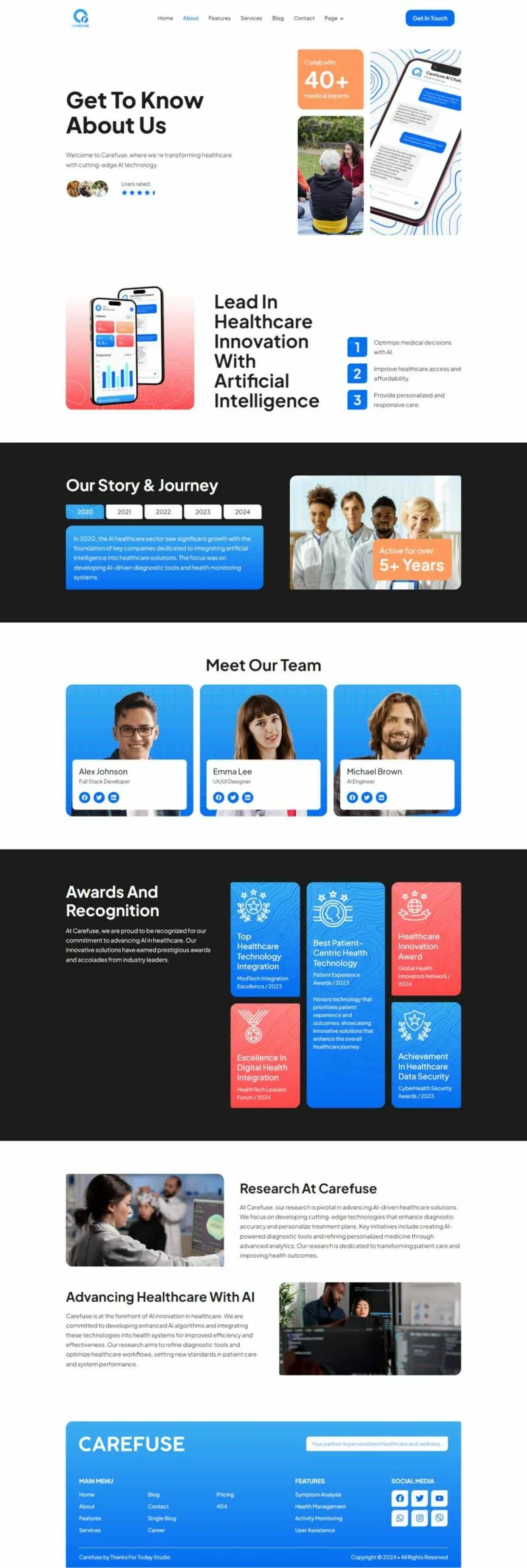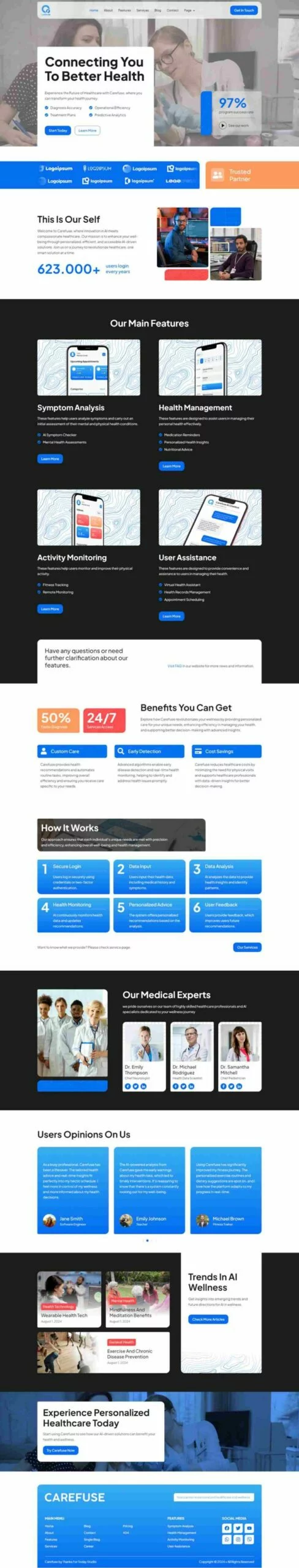 Carefuse یک کیت قالب جامع برای پروژههای مرتبط با سلامت و هوش مصنوعی است که بهطور خاص برای کسبوکارهای حوزه سلامت طراحی شده است. این کیت قالب با هدف ایجاد یک زیرساخت قوی برای وبسایتهای مرتبط با نظارت بر سلامت، ابزارهای تشخیصی مبتنی بر هوش مصنوعی، یا پلتفرمهای بهبود وضعیت جسمی و روانی طراحی شده است. با استفاده از کیت قالب المنتور برنامه سلامت هوش مصنوعی Carefuse، میتوانید به راحتی یک وبسایت حرفهای برای معرفی پروژههای هوش مصنوعی در حوزه سلامت ایجاد کنید.