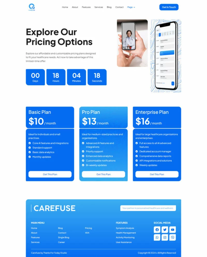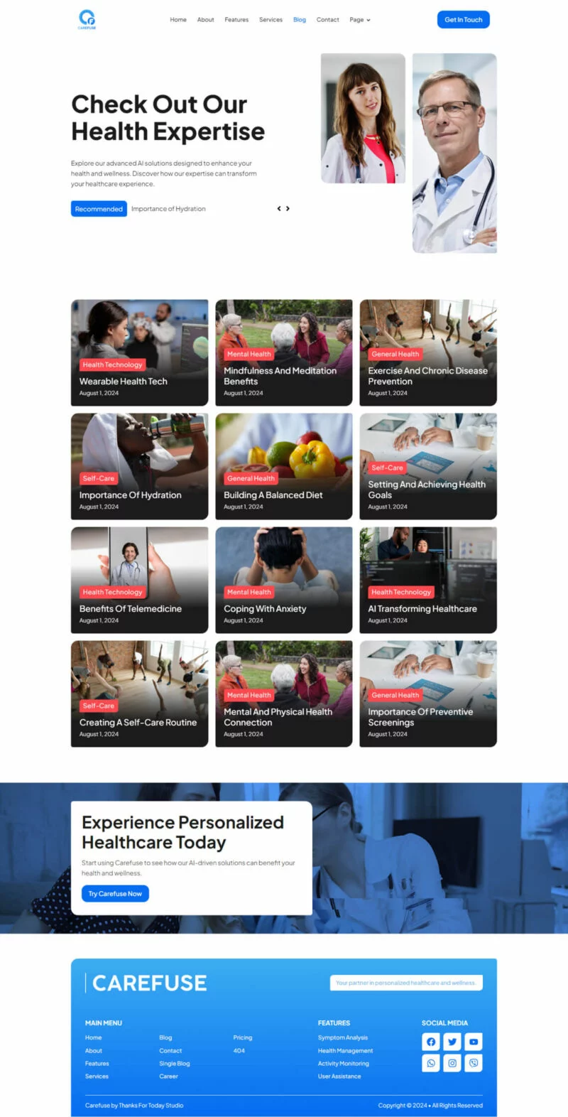 کیت قالب المنتور برنامه سلامت هوش مصنوعی Carefuse با استفاده از افزونههای رایگان مانند Jeg Elementor Kit و ElementsKit Lite به شما کمک میکند تا وبسایت خود را با تمام قابلیتها و امکانات مورد نیاز راهاندازی کنید.