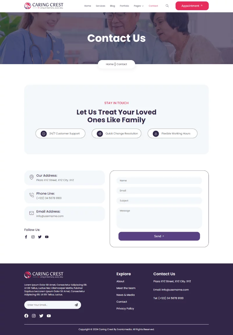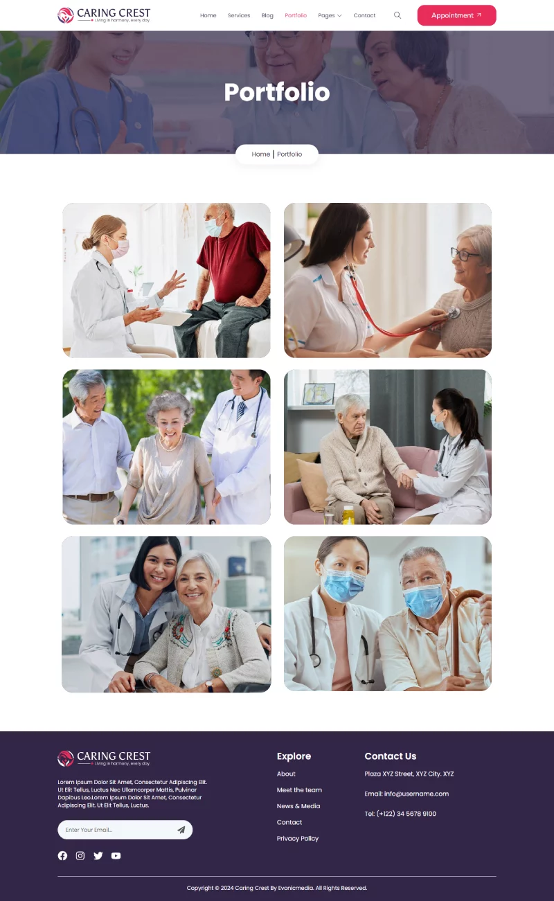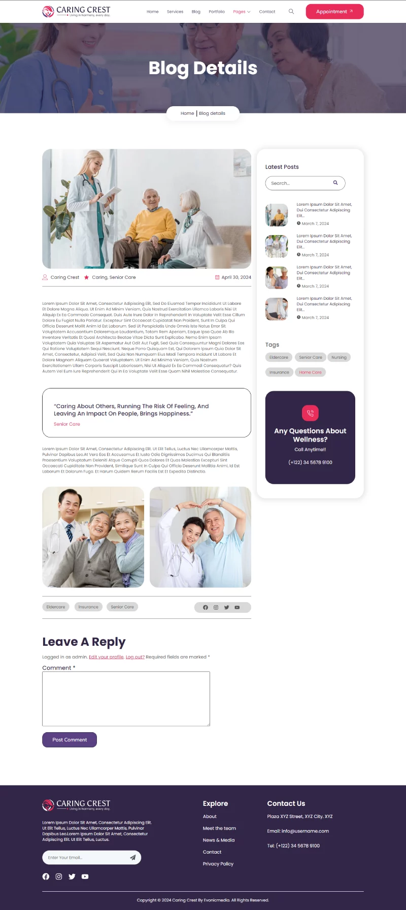 کیت قالب المنتور خدمات مراقبت سالمندان Caring Crest با توجه به نیازهای خاص خدمات مراقبت از سالمندان طراحیشده است. این کیت با استفاده از طراحی مدرن و قابلیتهای سفارشیسازی، به شما امکان میدهد تا وبسایتی حرفهای و دلنشین ایجاد کنید که تجربهای آرام و دوستانه را برای کاربران فراهم کند. این قالب شامل بخشها و صفحات متنوعی است که به شما کمک میکند تا خدمات، تیم و تجربیات خود را به نمایش بگذارید و به راحتی با بازدیدکنندگان وبسایت خود ارتباط برقرار کنید.