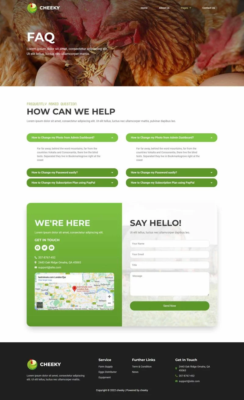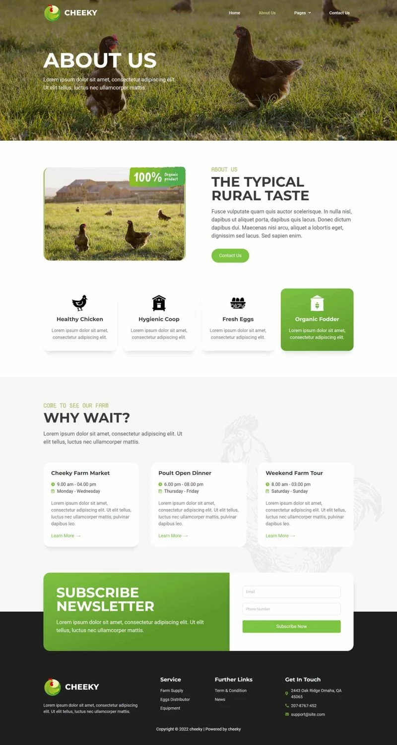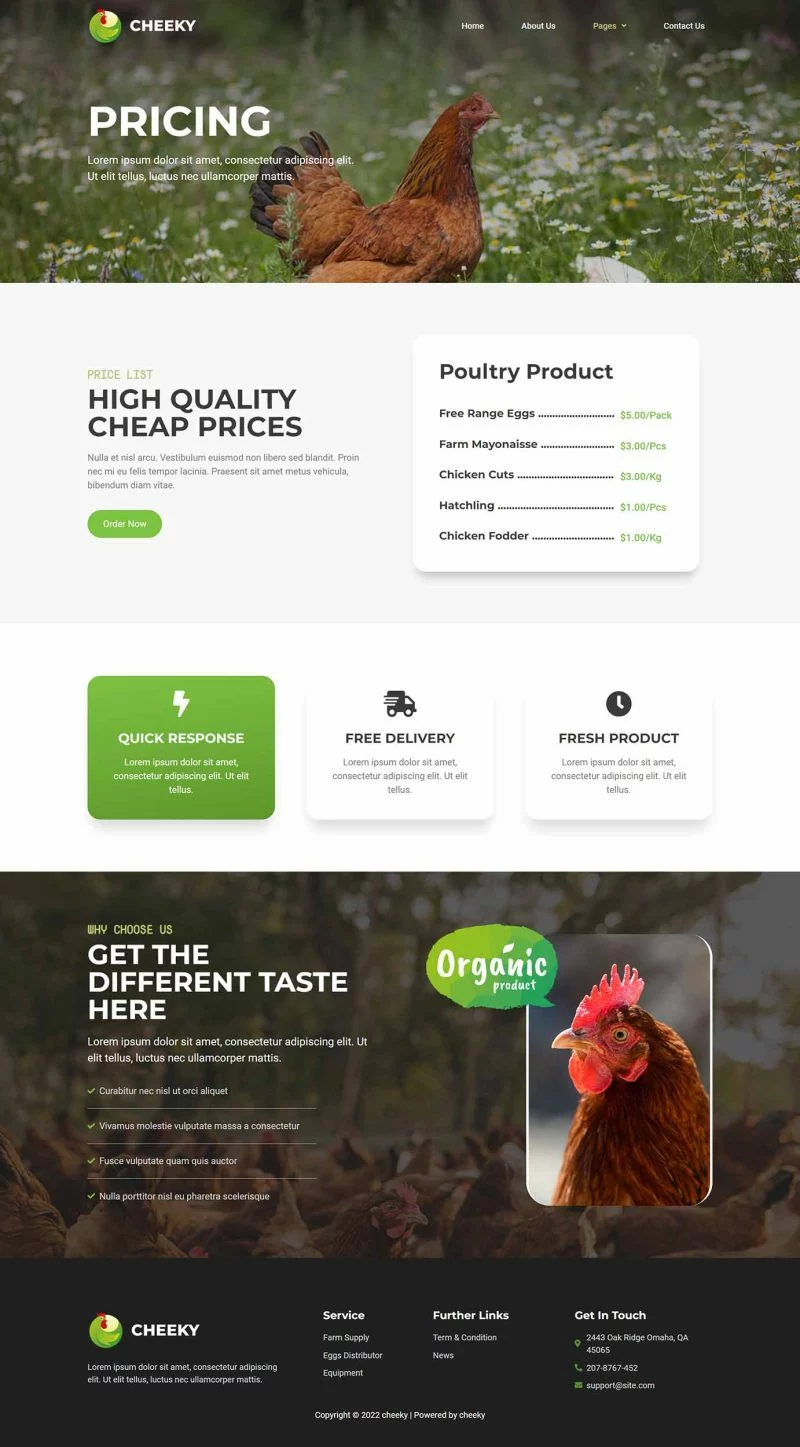 کیت قالب المنتور مزرعه طیور Cheeky به شما امکان میدهد به سرعت و به سادگی وبسایتهای مربوط به کسبوکار مزرعه طیور خود را با استفاده از افزونه صفحهساز Elementor برای وردپرس ایجاد کنید. این یک قالب وردپرس نیست. کیتهای قالب شامل محتوای صفحه برای صفحهساز المنتور هستند. این کیت برای استفاده با قالب رایگان Hello Elementor بهینهسازی شده است اما میتواند با بیشتر قالبهایی که از المنتور پشتیبانی میکنند استفاده شود.