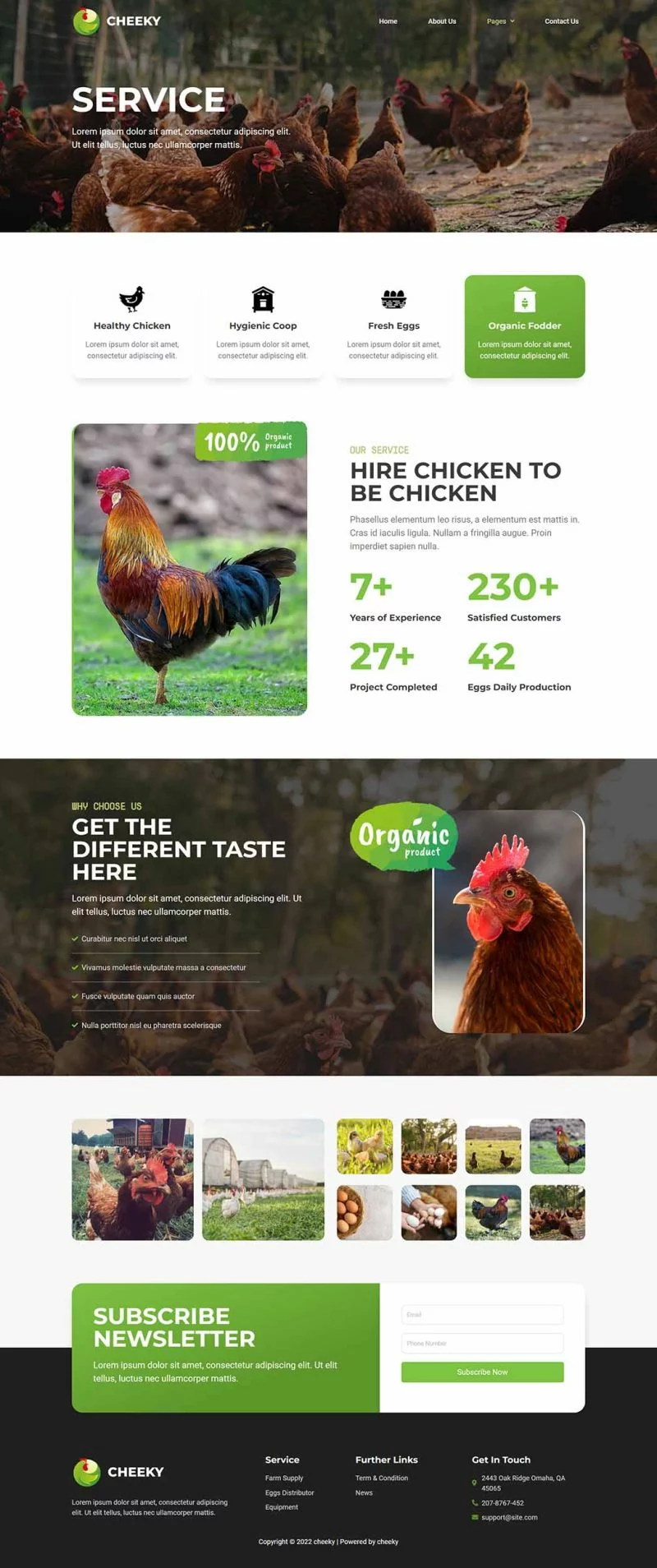 کیت قالب المنتور مزرعه طیور Cheeky دارای طراحی مدرن و حرفهای است که به شما این امکان را میدهد تا یک وبسایت زیبا و جذاب برای مزرعه طیور خود ایجاد کنید. این طراحیها به گونهای طراحی شدهاند که تمام نیازهای شما را برای نمایش خدمات و محصولات مختلف پوشش دهند.