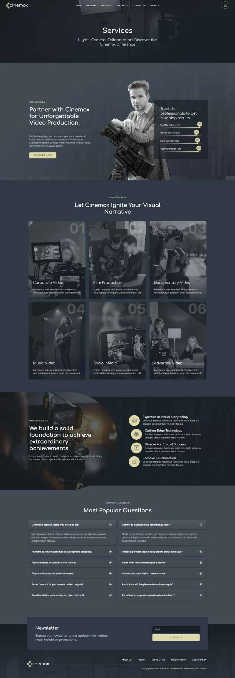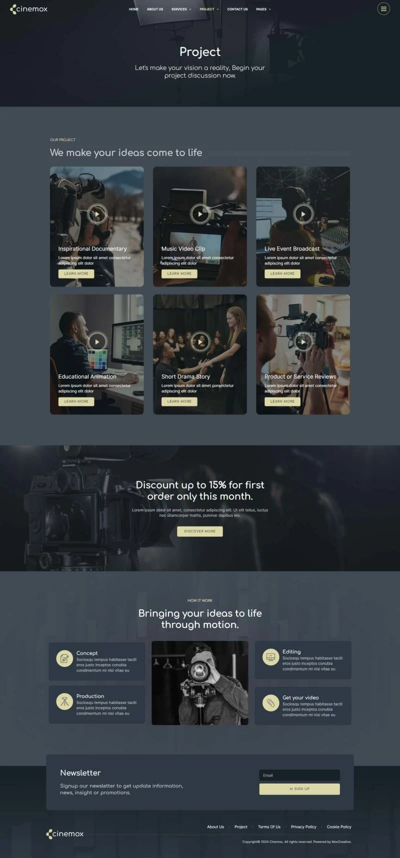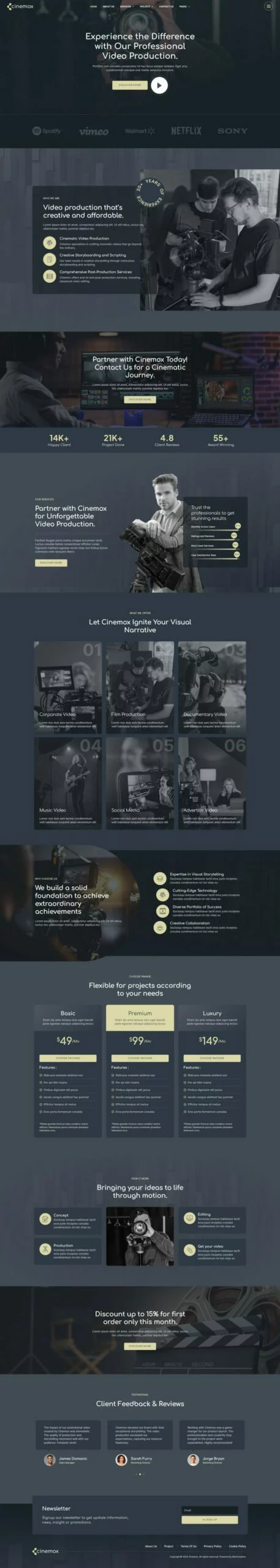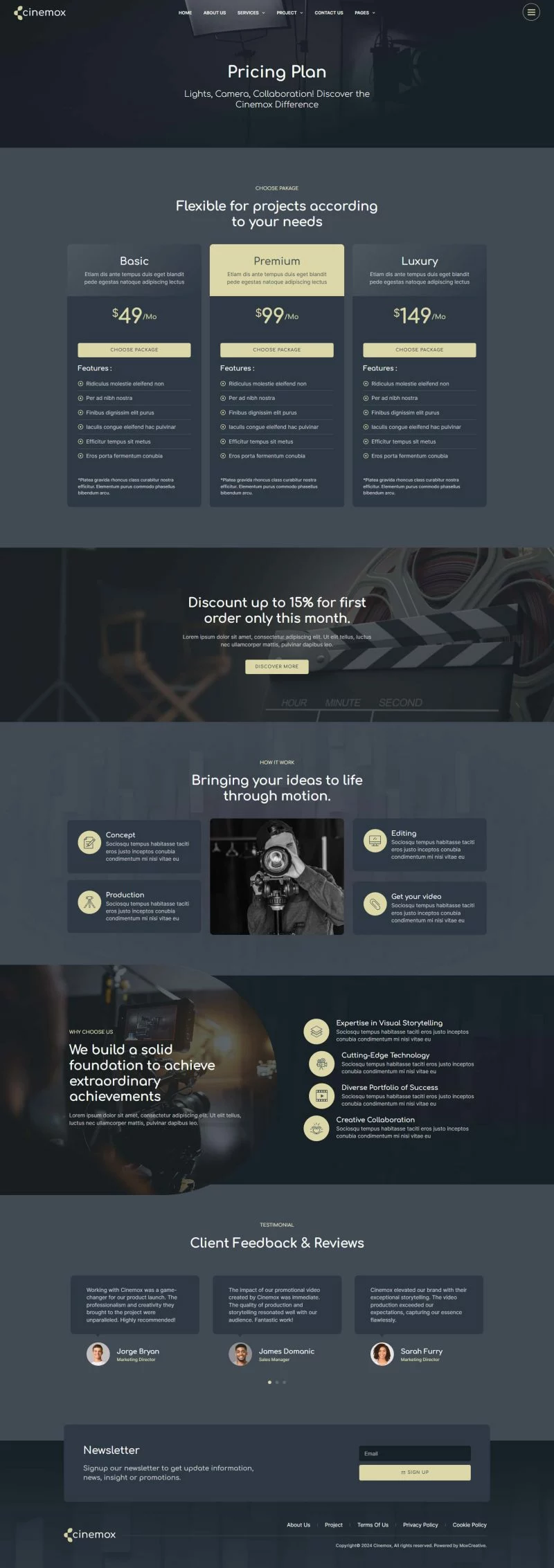 کیت قالب المنتور شرکت تولید ویدئو Cinemox دارای طراحی مدرن، تمیز و حرفهای است. با استفاده از این کیت، میتوانید به راحتی وبسایتی شگفتانگیز برای خدمات تولید ویدئو و خدمات مرتبط با آن مانند فیلم، ویدئوهای کوتاه، فریلنسری، تئاتر، فیلمسازی، ویدئوهای بازی، ولاگ، ویدئوهای مستند، تبلیغات و انواع تولیدات ویدئویی ایجاد کنید.