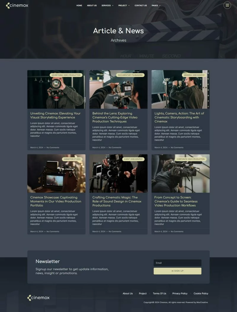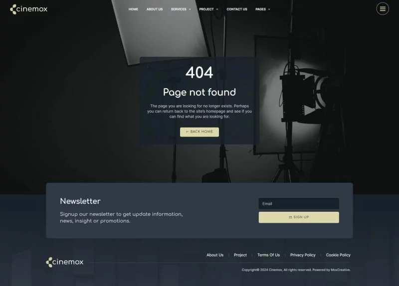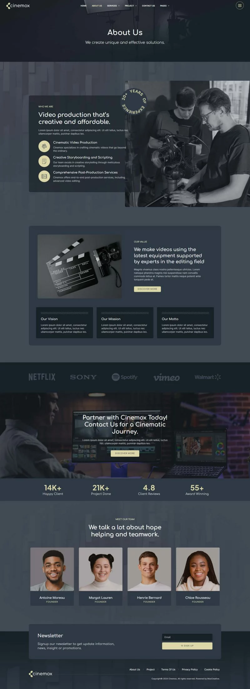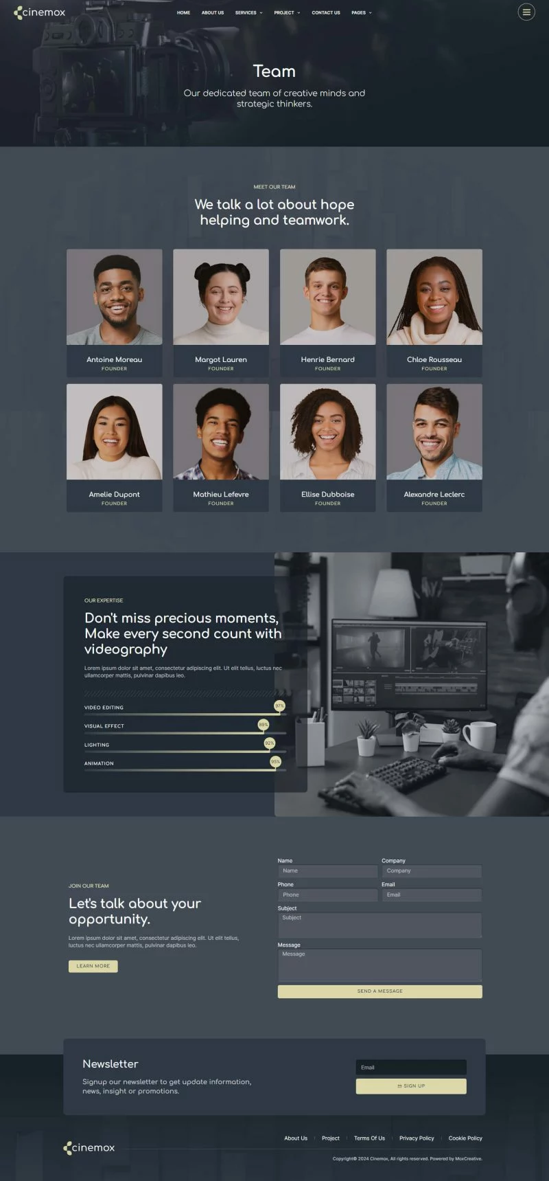 کیت قالب المنتور شرکت تولید ویدئو Cinemox دارای طراحی مدرن، تمیز و حرفهای است. با استفاده از این کیت، میتوانید به راحتی وبسایتی شگفتانگیز برای خدمات تولید ویدئو و خدمات مرتبط با آن مانند فیلم، ویدئوهای کوتاه، فریلنسری، تئاتر، فیلمسازی، ویدئوهای بازی، ولاگ، ویدئوهای مستند، تبلیغات و انواع تولیدات ویدئویی ایجاد کنید.