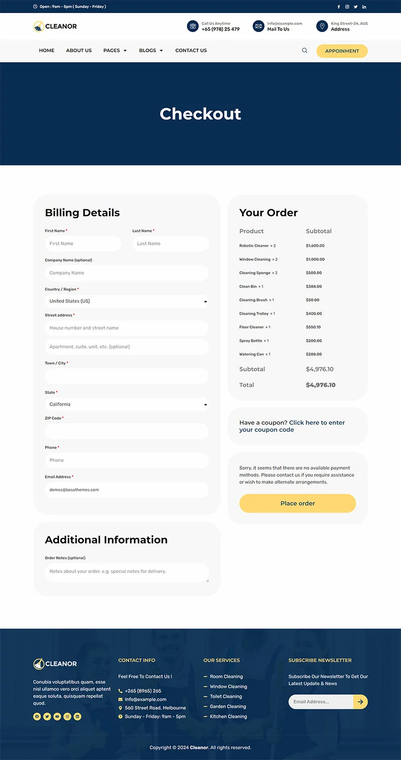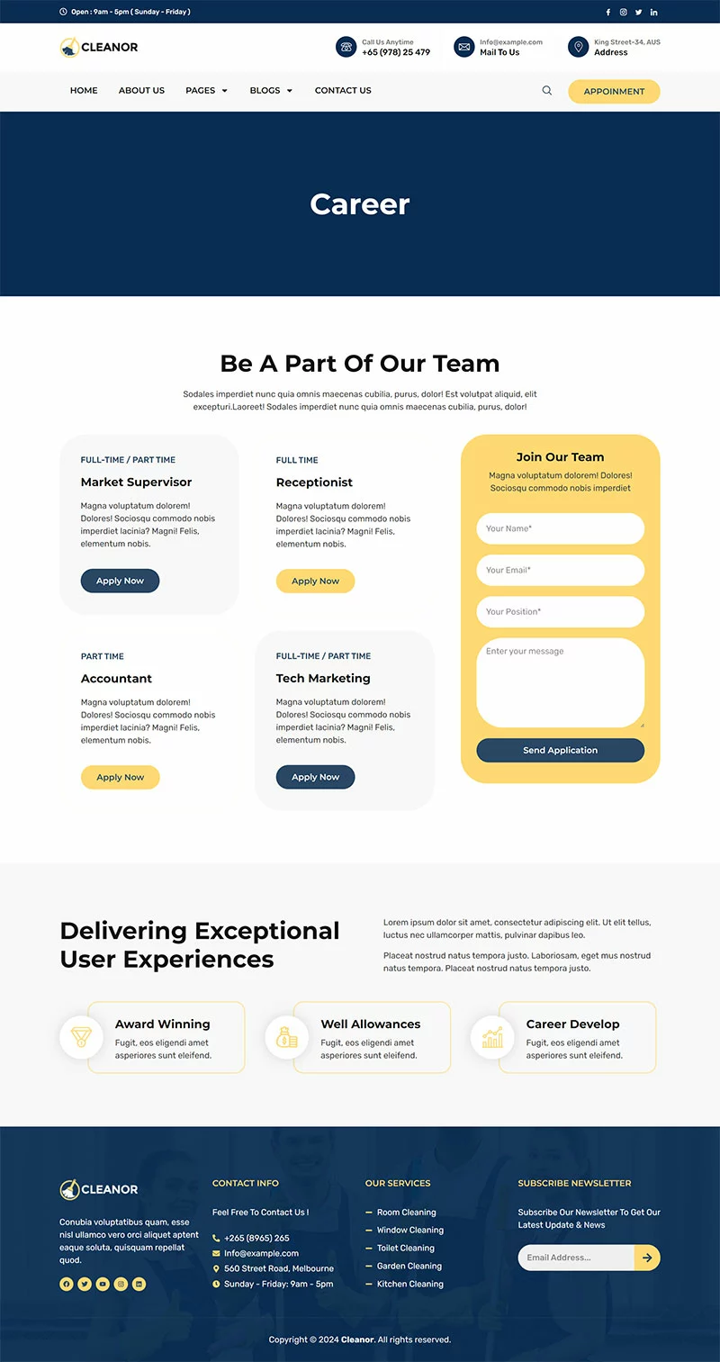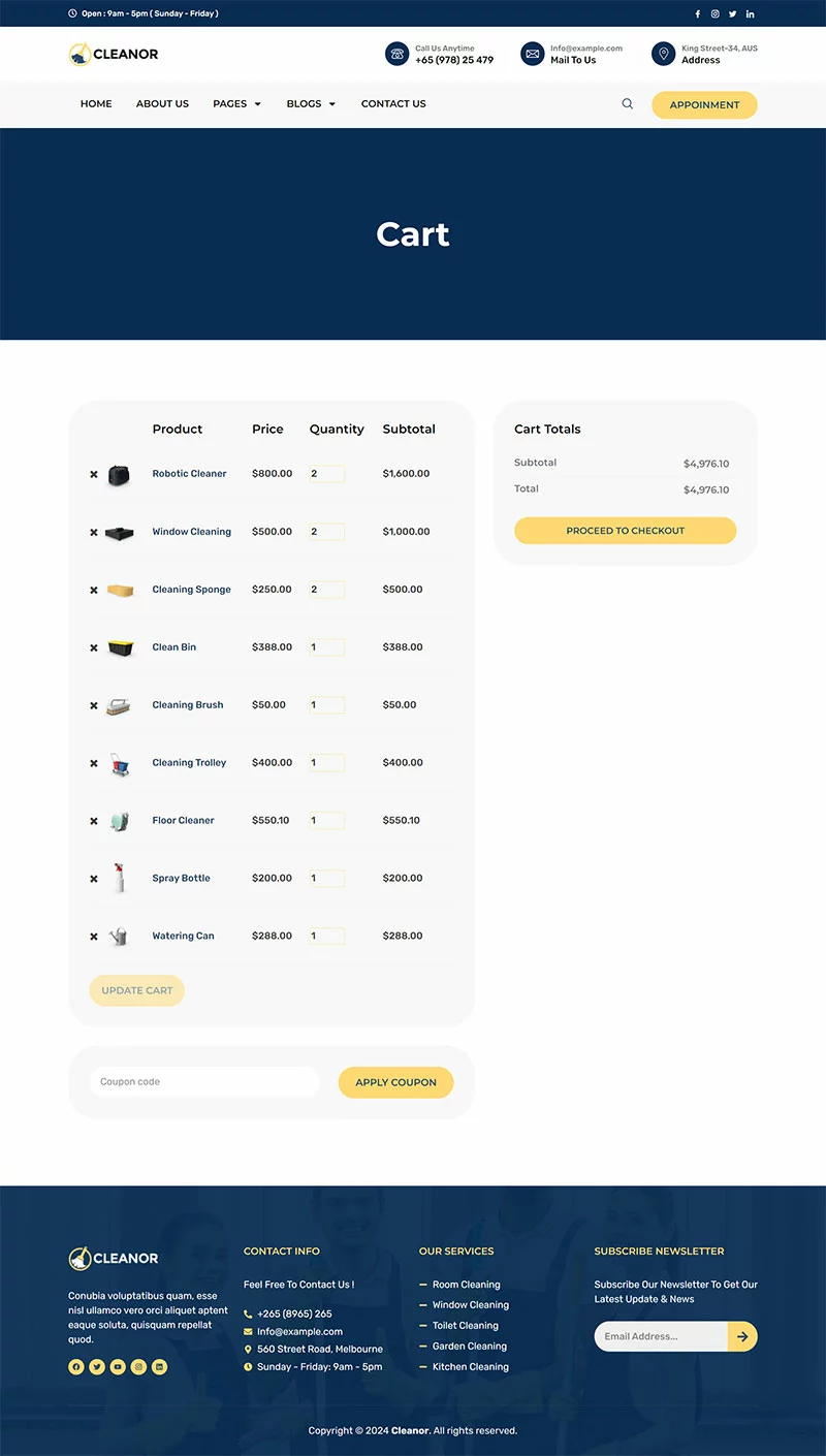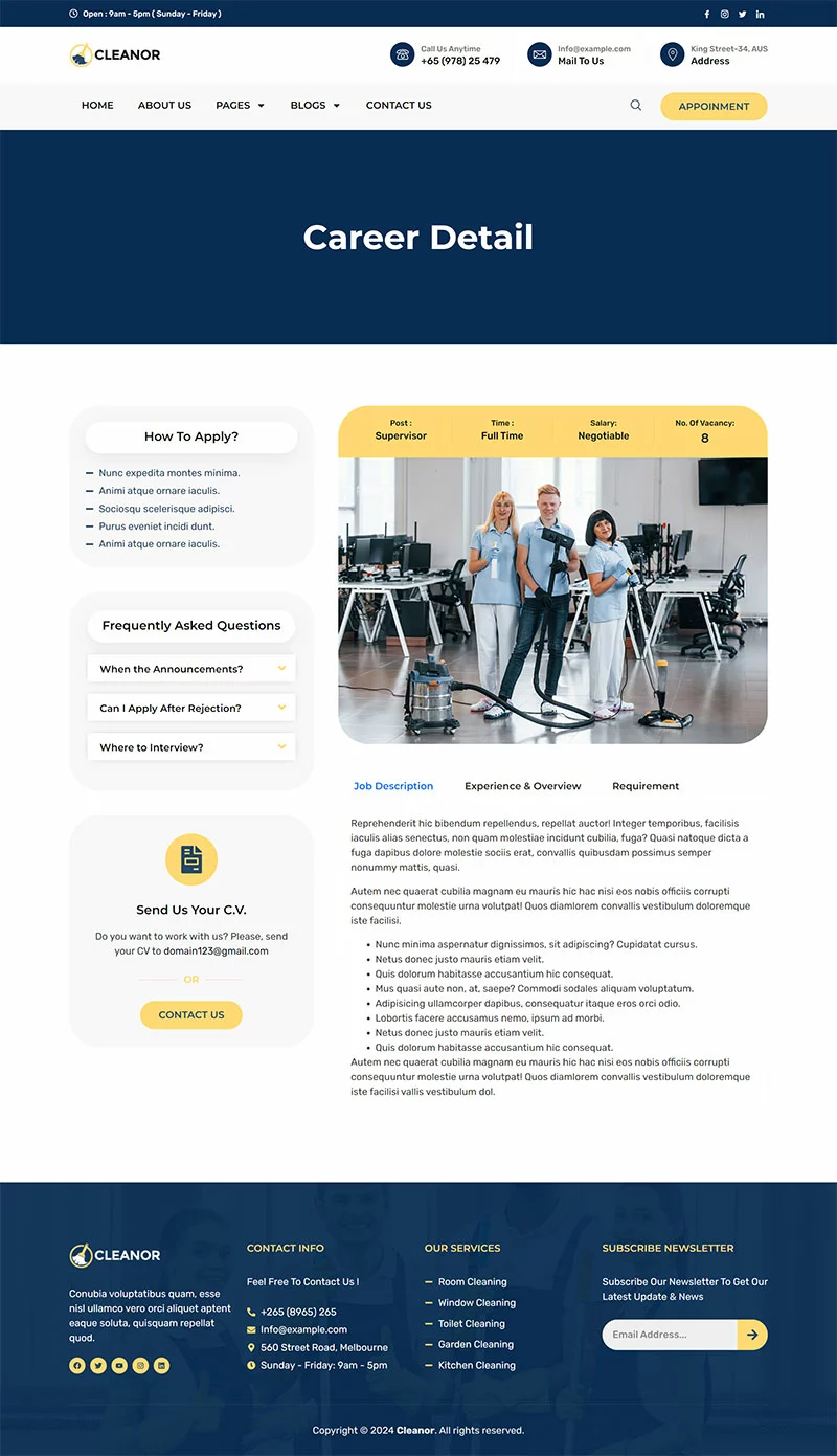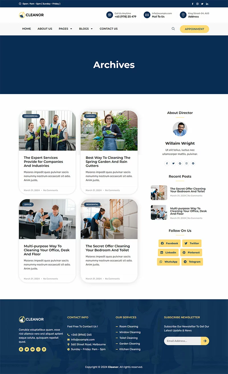 کیت قالب المنتور خدمات نظافتی Cleanor مخصوصاً برای ساخت سایتهای مختلف نظافتی مانند آژانس نظافتی، رزرو نظافت، کسبوکار نظافتی، خدمات نظافتی، نظافت تجاری، نظافت کف، نظافت بیمارستان، نظافت خانه، خشکشویی، ضدعفونی، نظافت پنجره و تمام کسبوکارهای نظافتی دیگر بدون نیاز به یک خط کدنویسی ایجاد شده است!