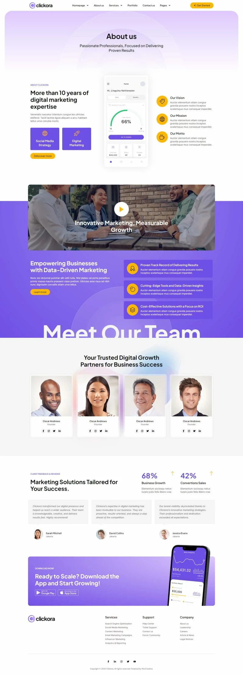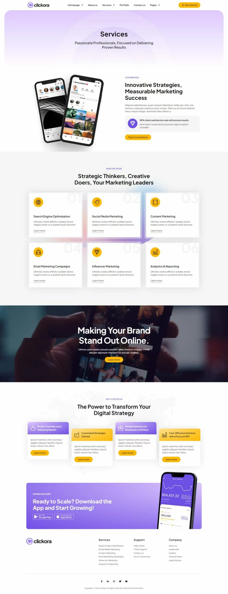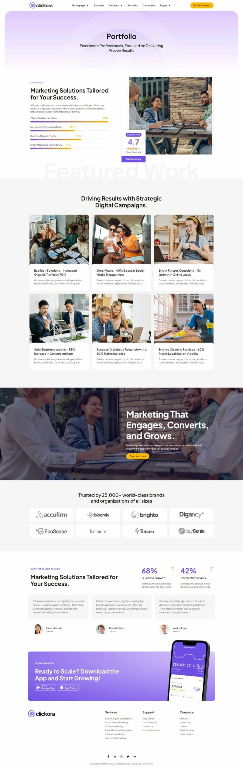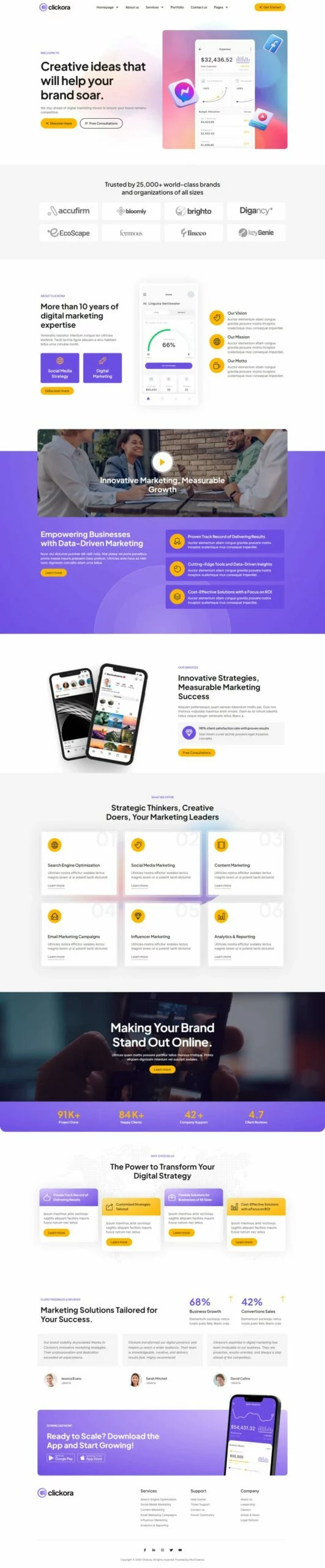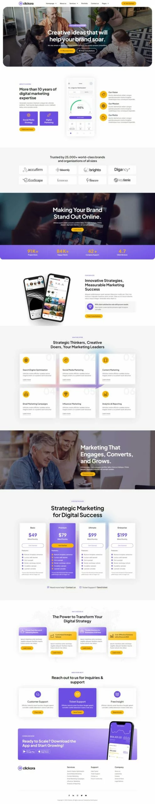Clickora یک کیت قالب المنتور حرفهای است که بهطور ویژه برای وبسایتهای آژانسهای خلاق و دیجیتال مارکتینگ طراحی شده است. این کیت شامل بیش از 12 قالب از پیشساختهشده با طراحی جذاب و مدرن است و مناسب برای انواع کسبوکارها و خدمات مانند بازاریابی شبکههای اجتماعی، خدمات سئو، تحلیل وبسایت، طراحی گرافیک، توسعه وب و بسیاری دیگر میباشد. با استفاده از این کیت قالب، میتوانید در کمترین زمان و بدون نیاز به دانش کدنویسی، وبسایتی کامل و حرفهای راهاندازی کنید.