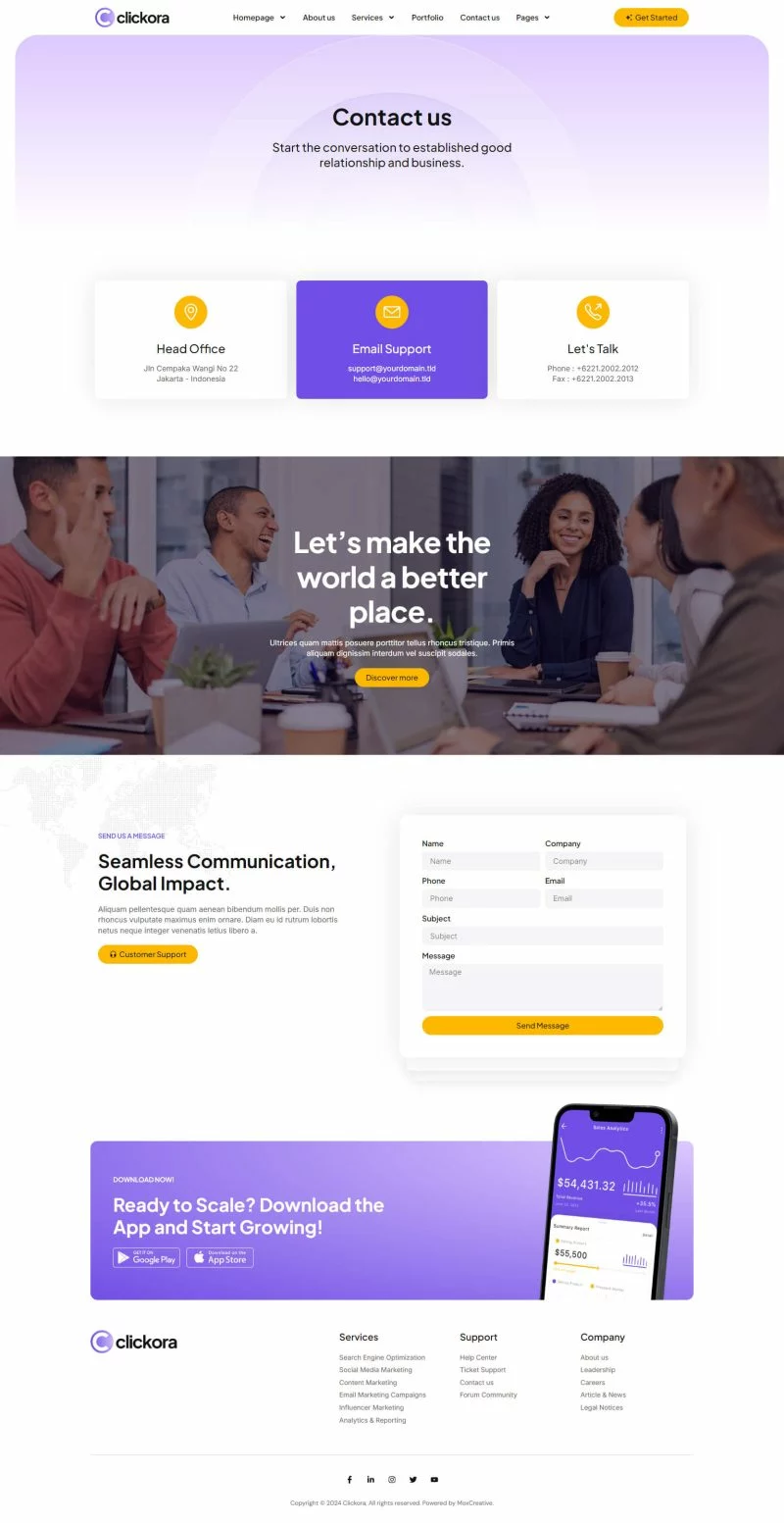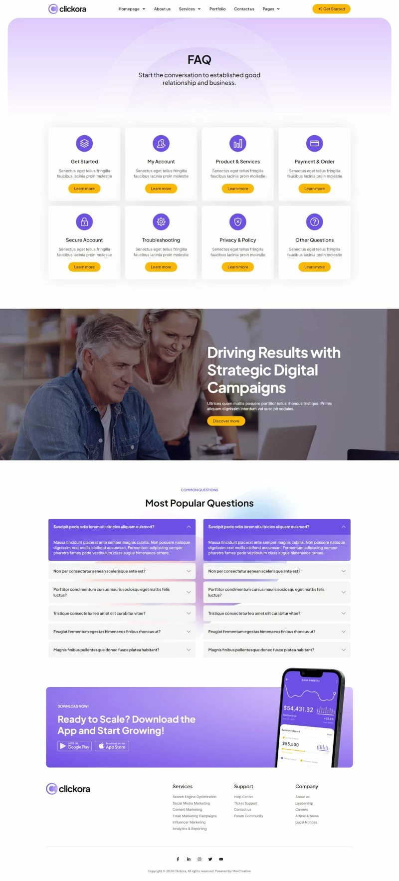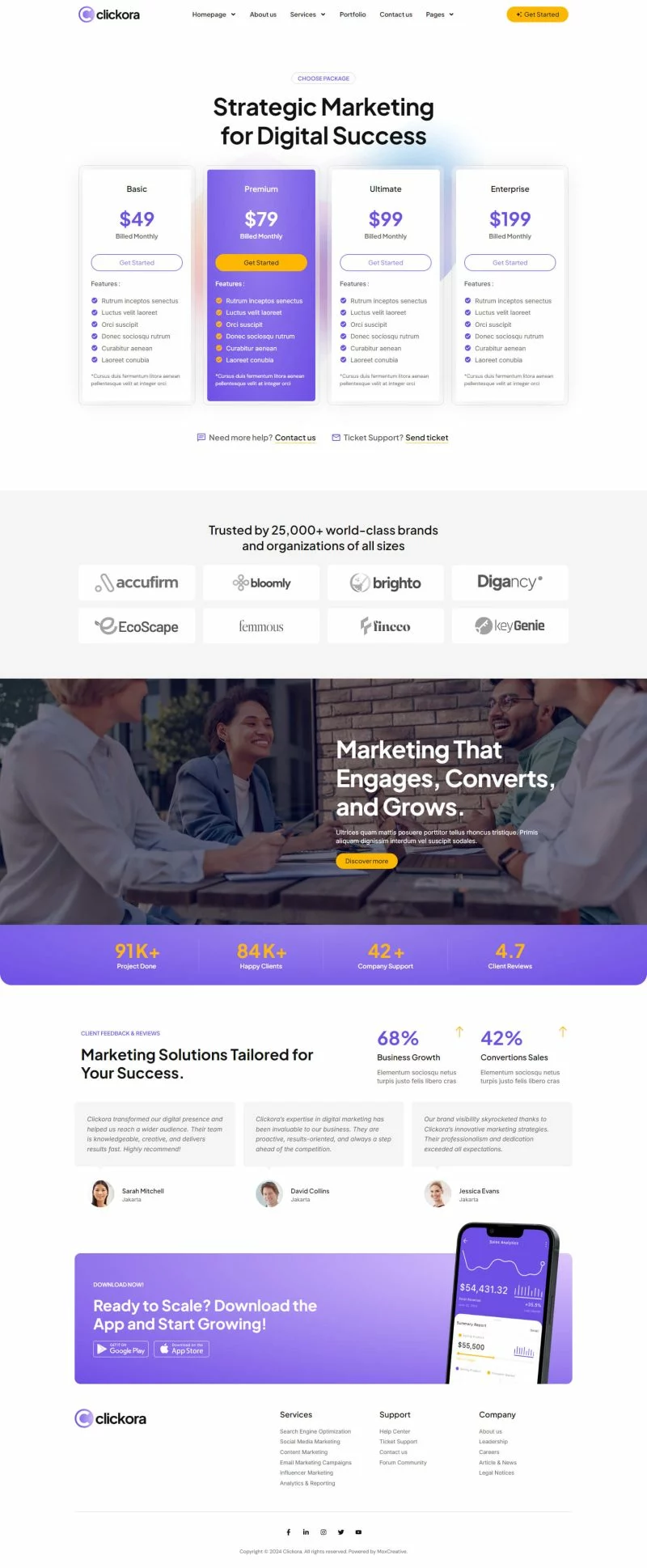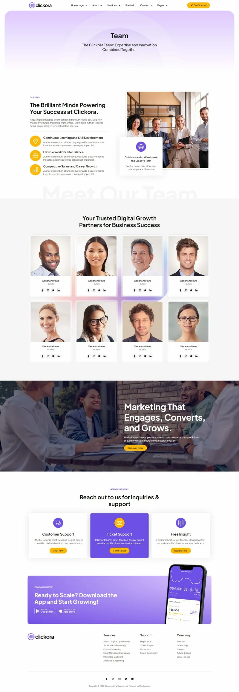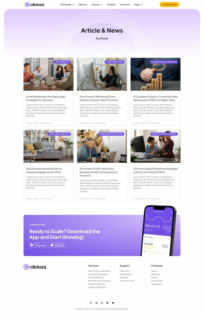 Clickora یک کیت قالب المنتور حرفهای است که بهطور ویژه برای وبسایتهای آژانسهای خلاق و دیجیتال مارکتینگ طراحی شده است. این کیت شامل بیش از 12 قالب از پیشساختهشده با طراحی جذاب و مدرن است و مناسب برای انواع کسبوکارها و خدمات مانند بازاریابی شبکههای اجتماعی، خدمات سئو، تحلیل وبسایت، طراحی گرافیک، توسعه وب و بسیاری دیگر میباشد. با استفاده از این کیت قالب، میتوانید در کمترین زمان و بدون نیاز به دانش کدنویسی، وبسایتی کامل و حرفهای راهاندازی کنید.