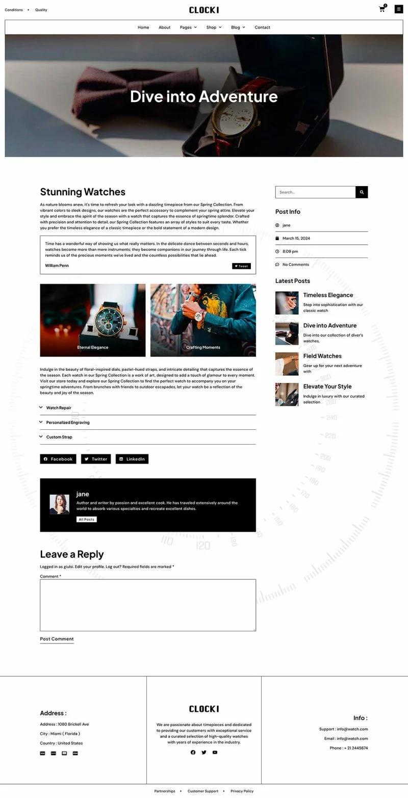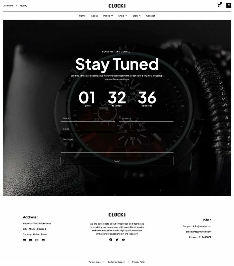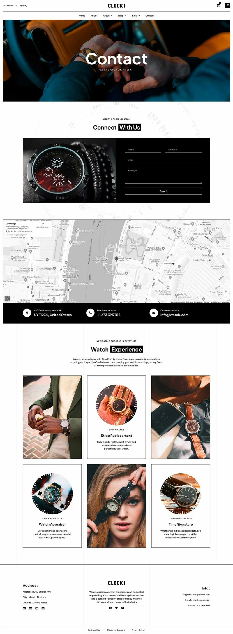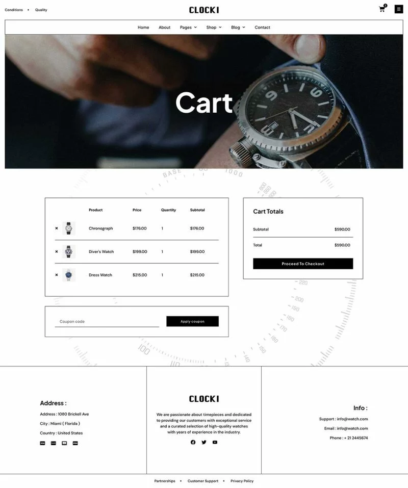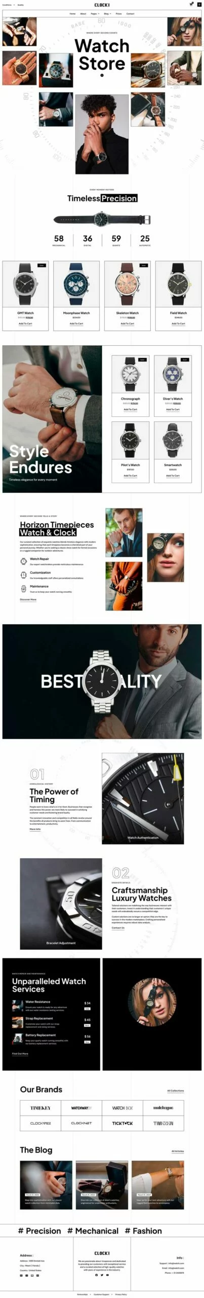 کیت قالب المنتور فروشگاه ساعت Clocki برای ایجاد سریع و آسان وبسایتهای کسبوکاری شما با استفاده از افزونه صفحهساز المنتور برای وردپرس است. این یک تم وردپرس نیست. کیتهای قالب شامل محتوای صفحه برای صفحهساز المنتور هستند. این کیت برای استفاده با تم رایگان Hello Elementor بهینه شده است، اما ممکن است با بیشتر تمهای سازگار با المنتور استفاده شود.