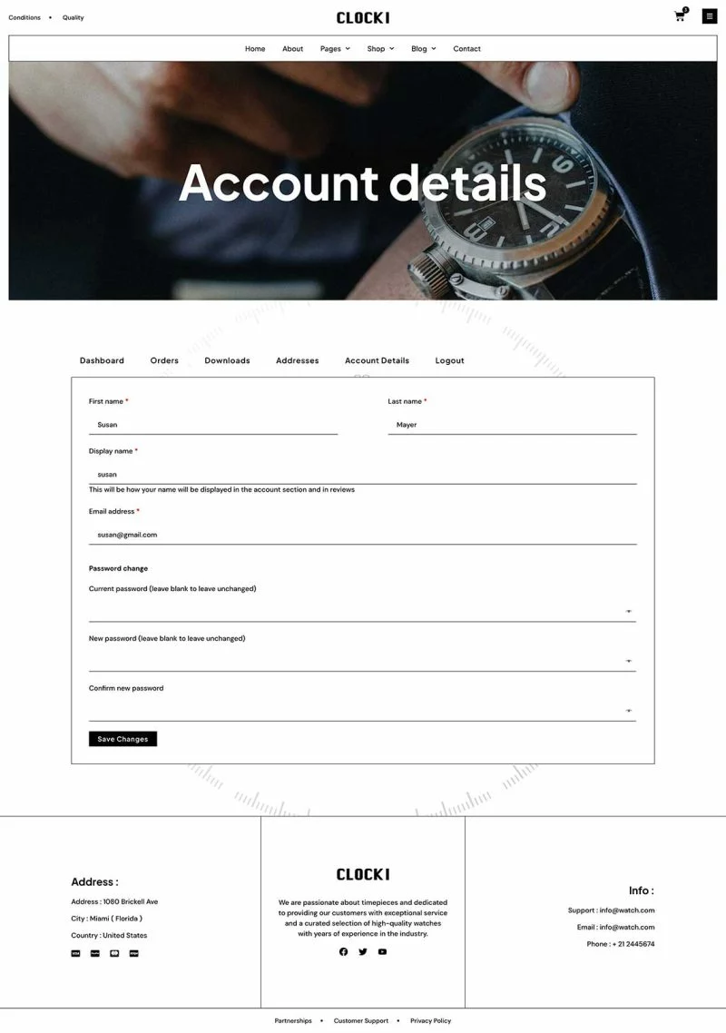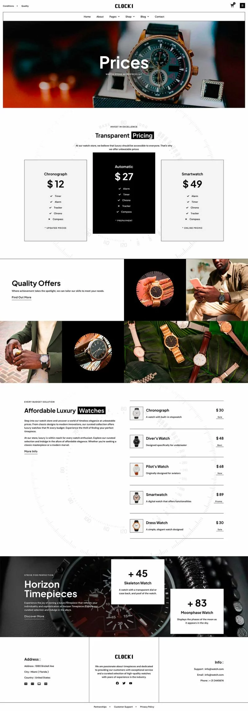 کیت قالب المنتور فروشگاه ساعت Clocki به شما این امکان را میدهد که بدون نیاز به دانش کدنویسی، وبسایتی حرفهای و جذاب برای فروشگاه ساعت خود ایجاد کنید. این کیت با طراحی مدرن و امکانات سفارشیسازی فراوان، تجربه کاربری بهتری را برای مشتریان شما فراهم میکند. همچنین با افزونه ووکامرس سازگار است که به شما اجازه میدهد تا به راحتی قابلیت فروشگاه آنلاین را به وبسایت خود اضافه کنید.