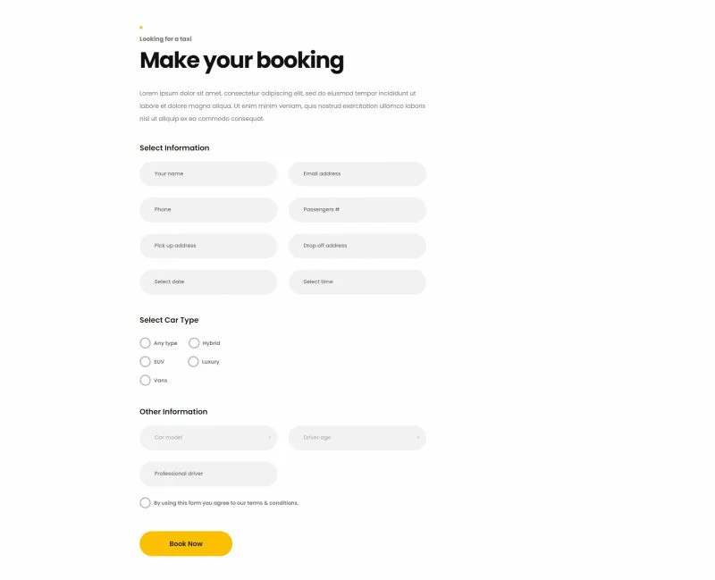 با استفاده از کیت قالب المنتور سرویس رزرو تاکسی آنلاین Conexi، شما میتوانید یک وبسایت حرفهای و جذاب برای سرویس رزرو تاکسی آنلاین، خدمات تاکسی، اجاره خودرو و سایر خدمات مرتبط ایجاد کنید. این کیت قالب به شما امکان میدهد تا با استفاده از صفحهساز المنتور، بهراحتی و بدون نیاز به کدنویسی، وبسایت خود را سفارشیسازی کنید. طراحی واکنشگرا و مدرن Conexi تضمین میکند که وبسایت شما در تمامی دستگاهها و مرورگرها بهخوبی نمایش داده شود.