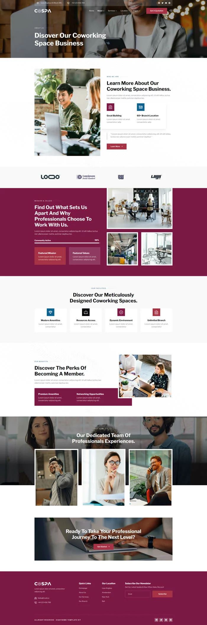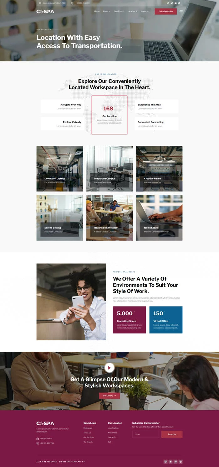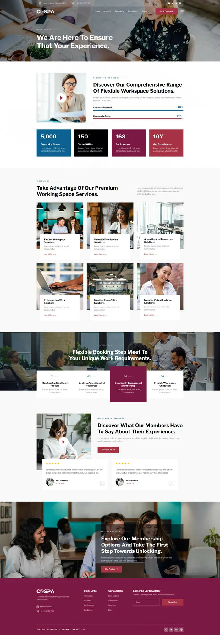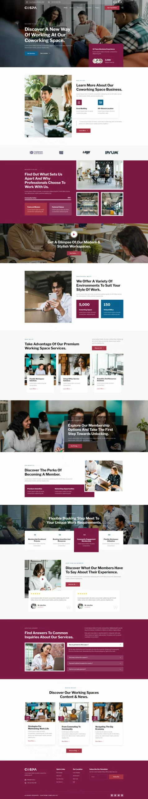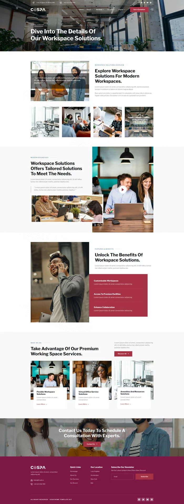 با استفاده از کیت قالب المنتور فضای کار مشترک و دفتر مجازی Cospa، فضای کاری خود را به سطح بالاتری ببرید.این کیت به شما این امکان را میدهد تا امکانات خود را نمایش دهید، گزینههای عضویت را برجسته کنید و مشتریان بالقوه را جذب کنید.