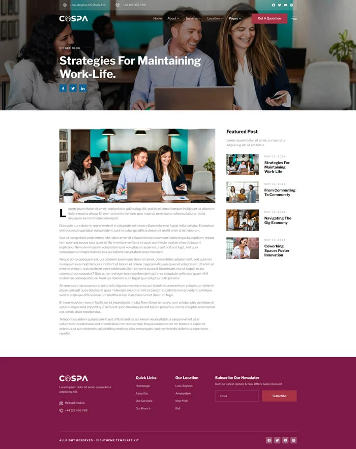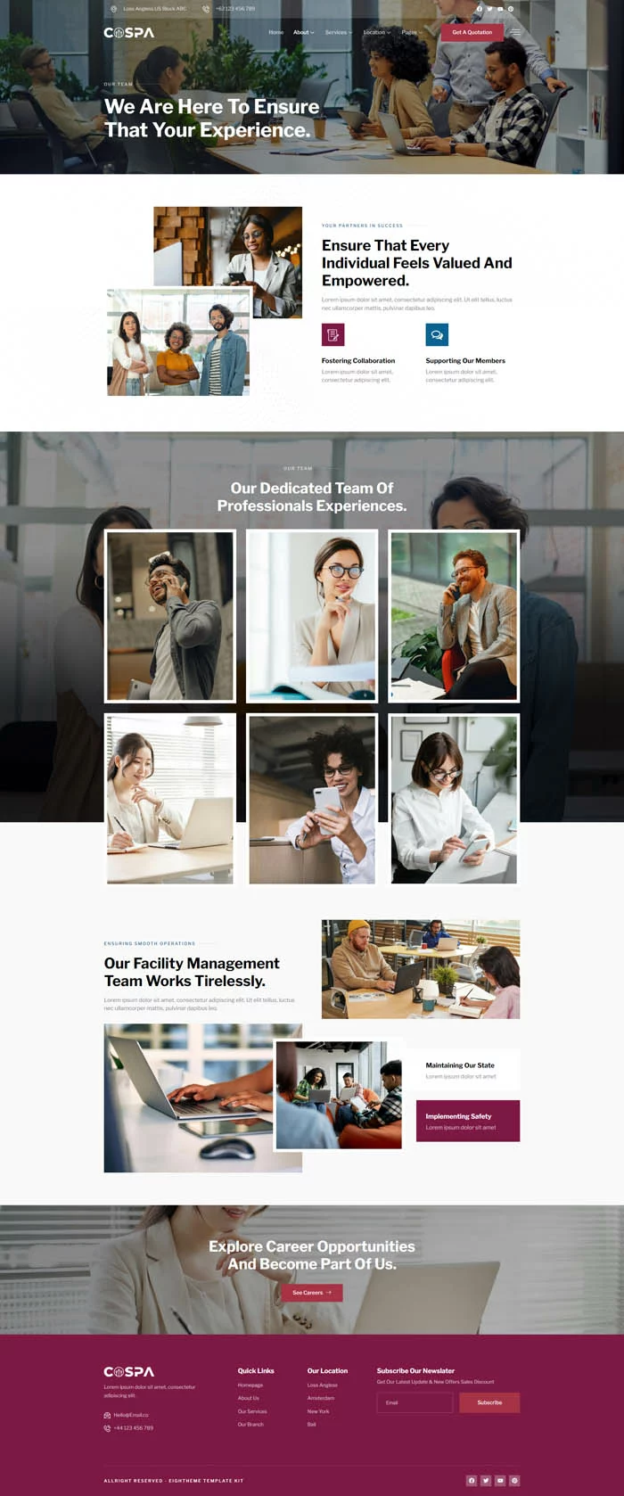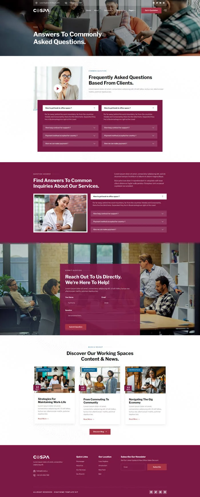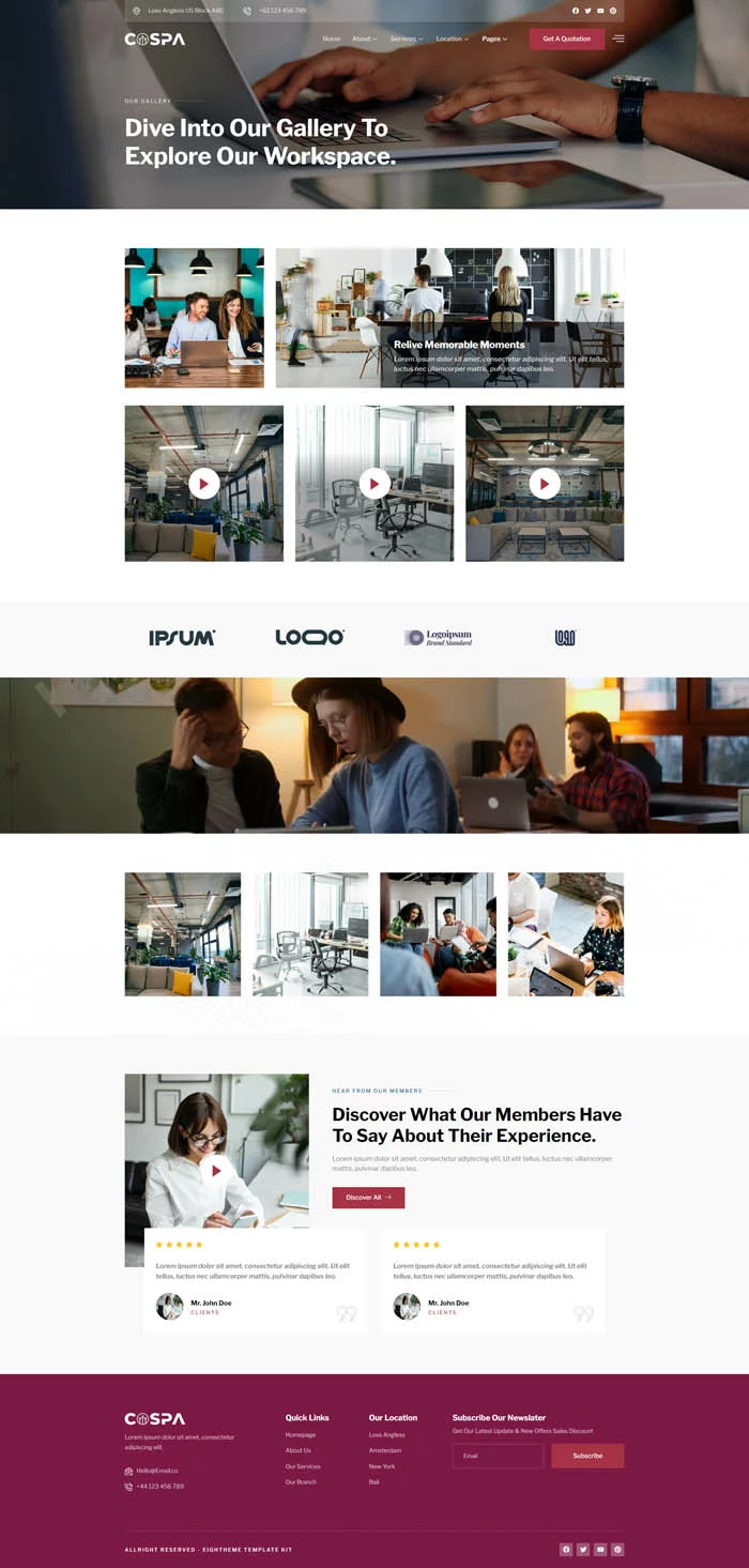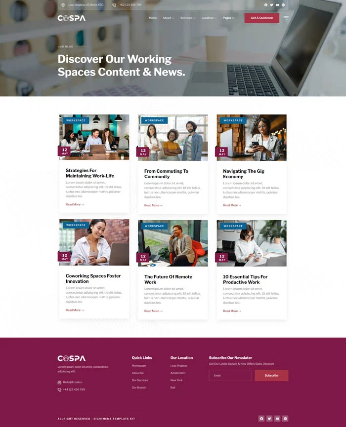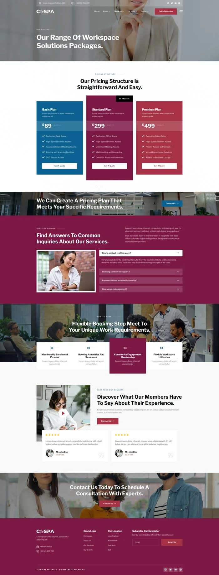 با استفاده از کیت قالب المنتور فضای کار مشترک و دفتر مجازی Cospa، فضای کاری خود را به سطح بالاتری ببرید.این کیت به شما این امکان را میدهد تا امکانات خود را نمایش دهید، گزینههای عضویت را برجسته کنید و مشتریان بالقوه را جذب کنید.
