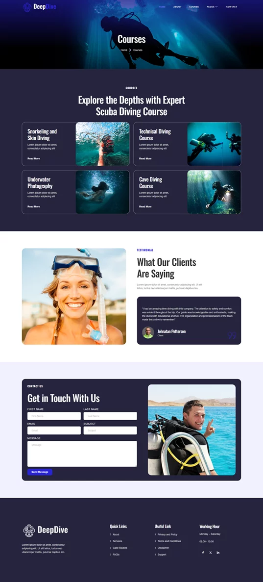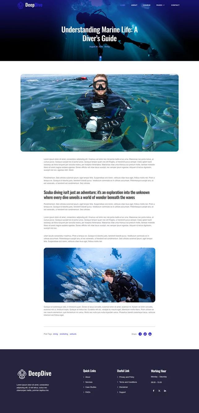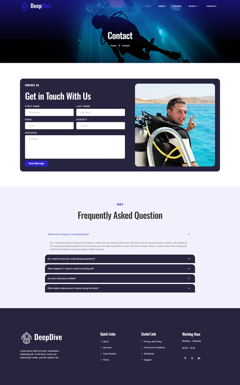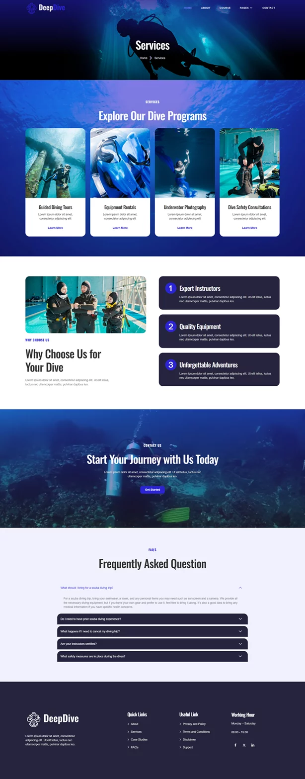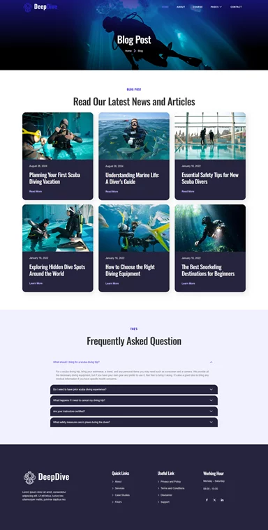 کیت قالب المنتور Deepdive یک انتخاب حرفهای و کاربردی برای سایتهای غواصی و ورزش های آبی است که به صورت اختصاصی برای وردپرس طراحی شده است. این قالب با استفاده از افزونههای رایگان، طراحی زیبا و مدرنی را فراهم میکند و به متخصصان این حوزه این امکان را میدهد تا بدون نیاز به مهارتهای پیچیده برنامهنویسی، یک سایت حرفهای و جذاب داشته باشند. Deepdive بهطور ویژه برای مدارس غواصی، مراکز فعالیتهای دریایی و ارائهدهندگان ورزشهای ماجراجویانه طراحی شده و تمام نیازهای این حوزه را پوشش میدهد.