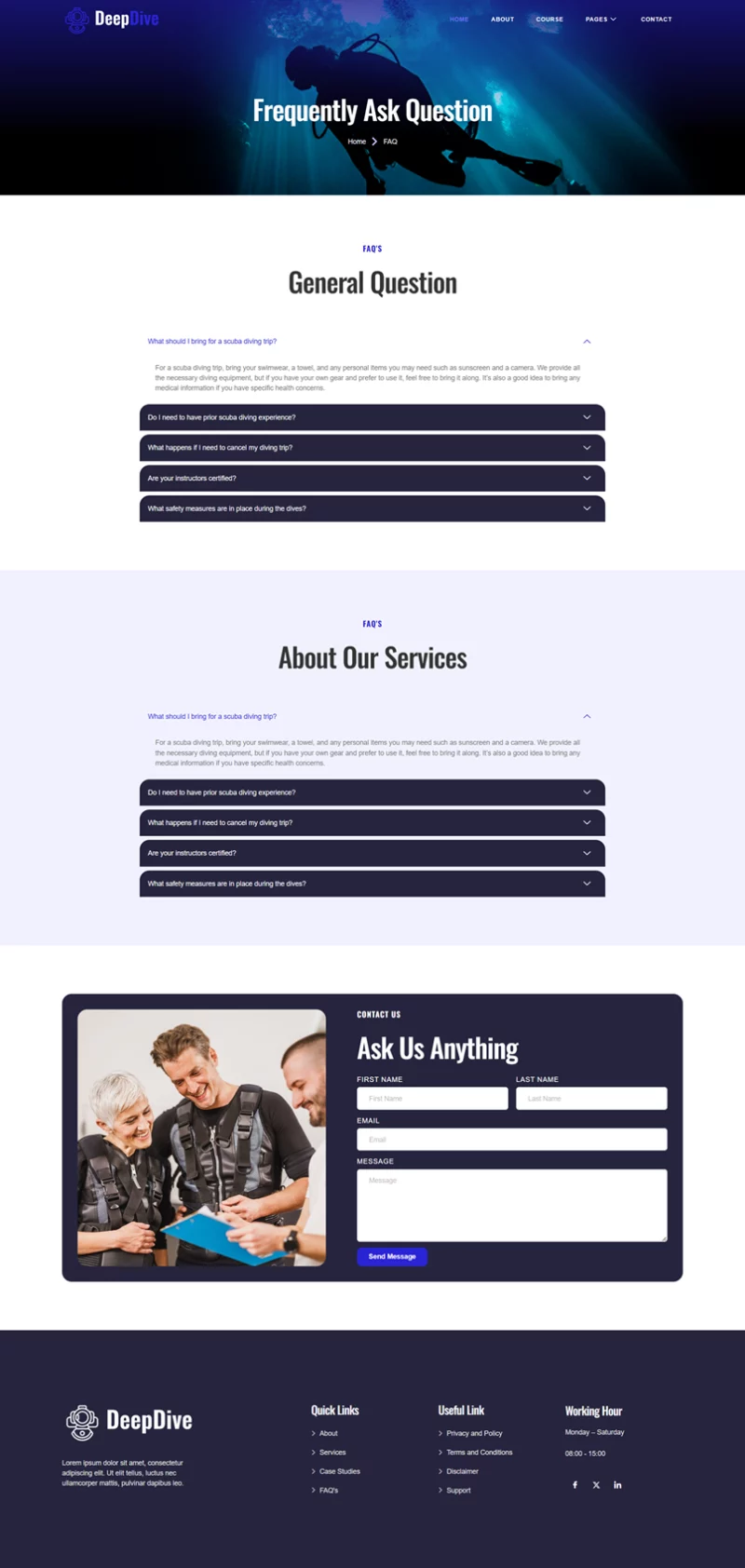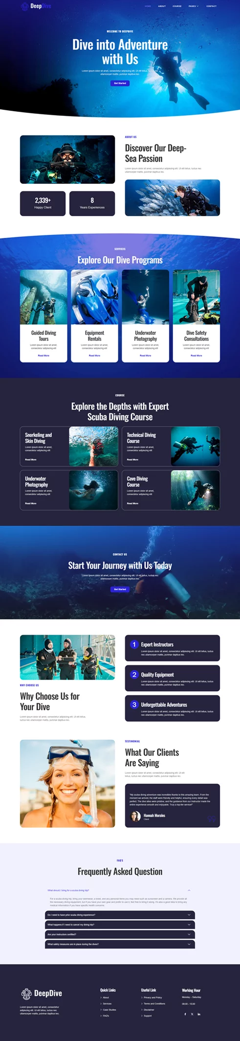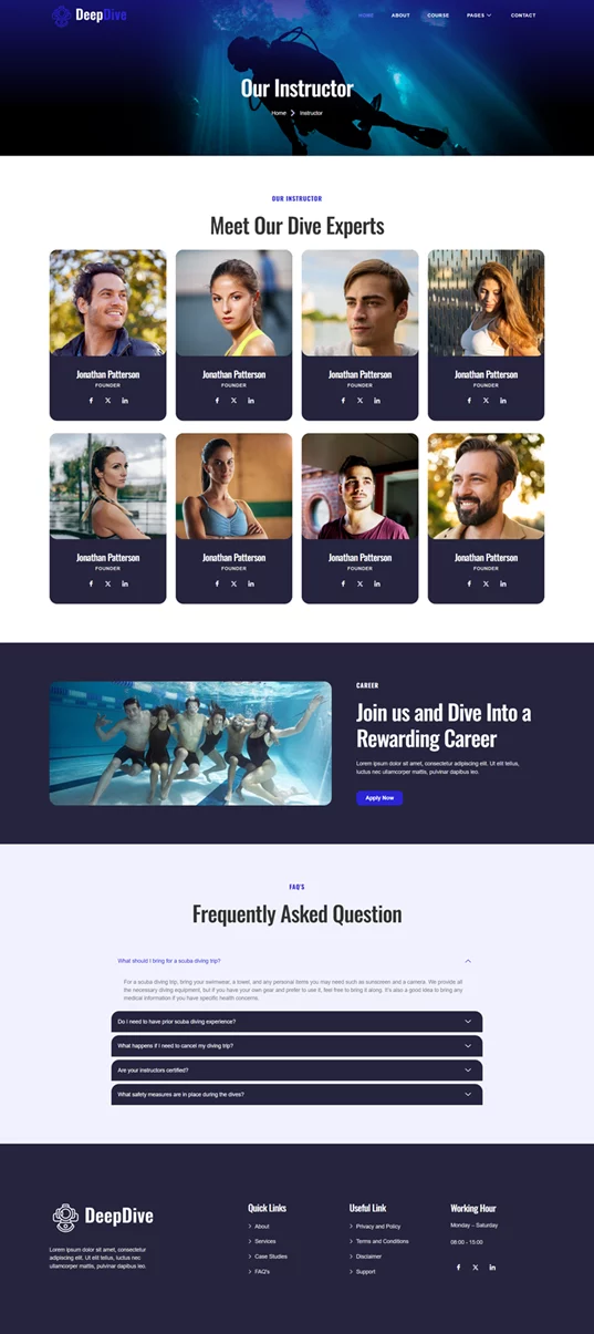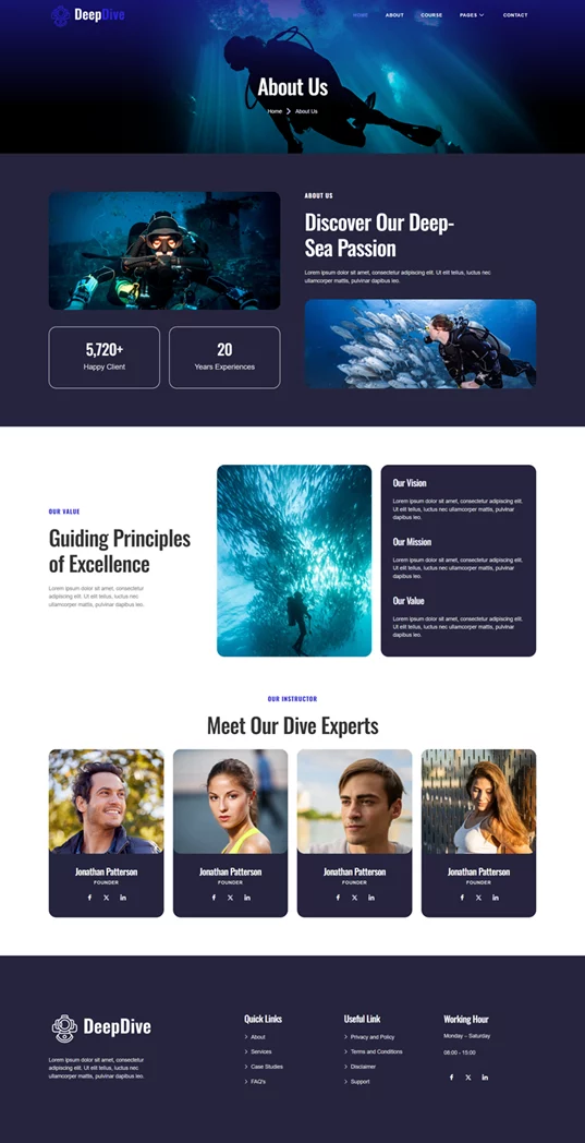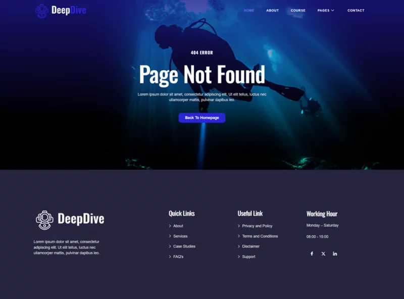 کیت قالب المنتور Deepdive یک انتخاب حرفهای و کاربردی برای سایتهای غواصی و ورزش های آبی است که به صورت اختصاصی برای وردپرس طراحی شده است. این قالب با استفاده از افزونههای رایگان، طراحی زیبا و مدرنی را فراهم میکند و به متخصصان این حوزه این امکان را میدهد تا بدون نیاز به مهارتهای پیچیده برنامهنویسی، یک سایت حرفهای و جذاب داشته باشند. Deepdive بهطور ویژه برای مدارس غواصی، مراکز فعالیتهای دریایی و ارائهدهندگان ورزشهای ماجراجویانه طراحی شده و تمام نیازهای این حوزه را پوشش میدهد.