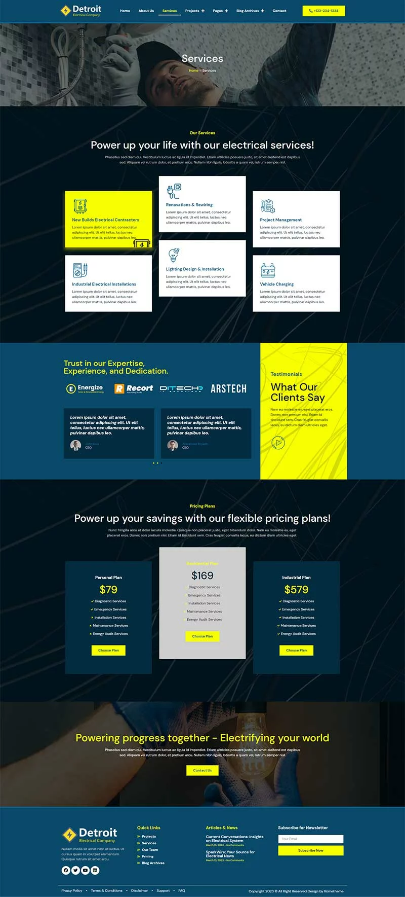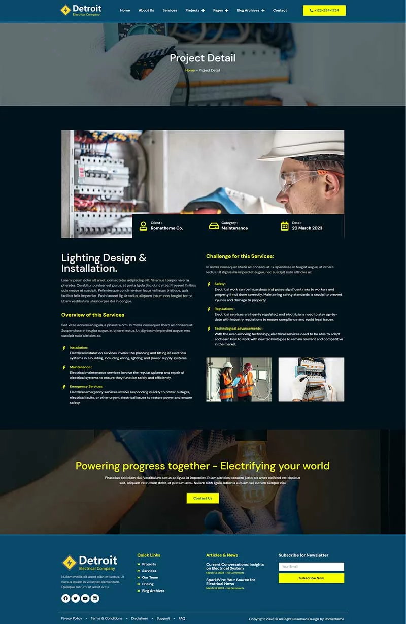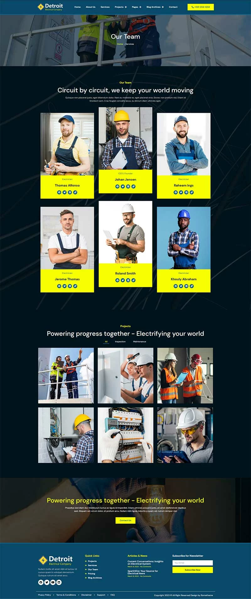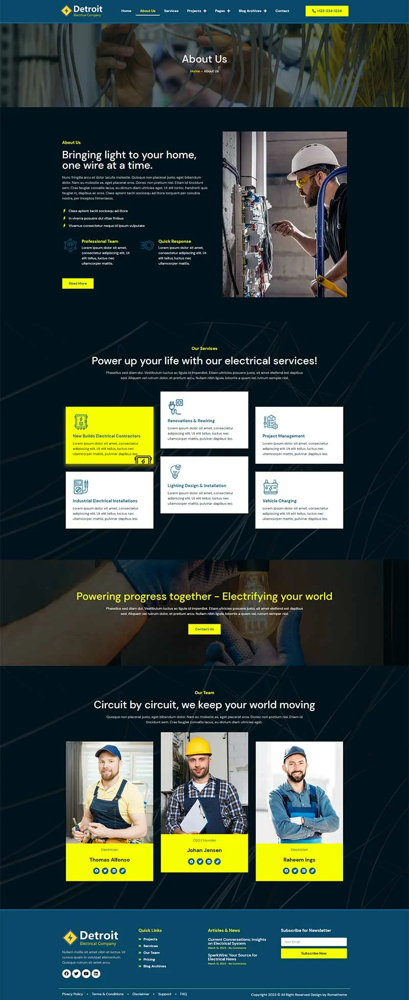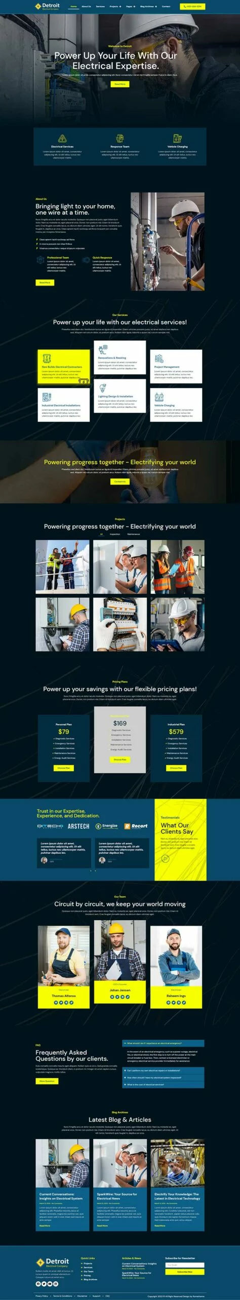 با استفاده از کیت قالب المنتور شرکت خدمات برق Detroit، میتوانید به سرعت و آسانی یک وبسایت حرفهای برای خود ایجاد کنید. این کیت تمامی ابزارهای لازم برای نمایش خدمات، پروژهها، تیم ما و ارتباط با ما را در اختیار شما قرار میدهد. با قابلیت سفارشیسازی آسان و بدون نیاز به کدنویسی، Detroit انتخابی عالی برای ایجاد یک حضور آنلاین برجسته و حرفهای برای کسبوکار شما است.