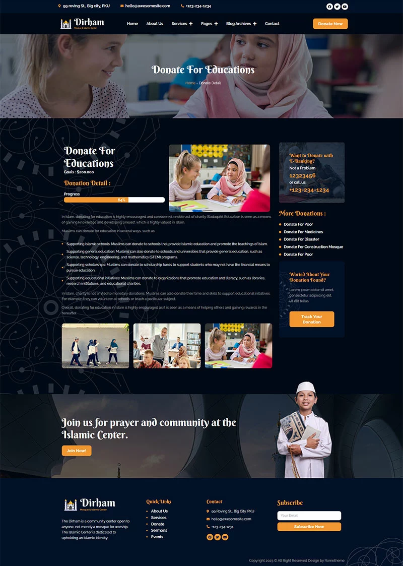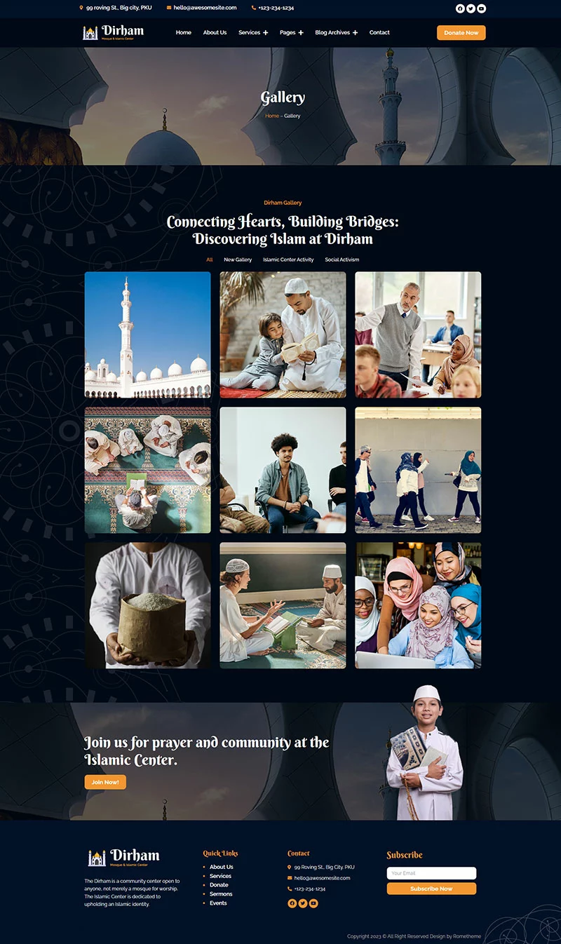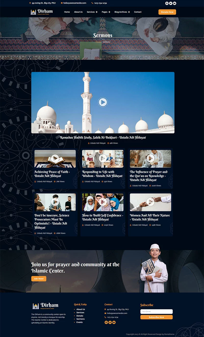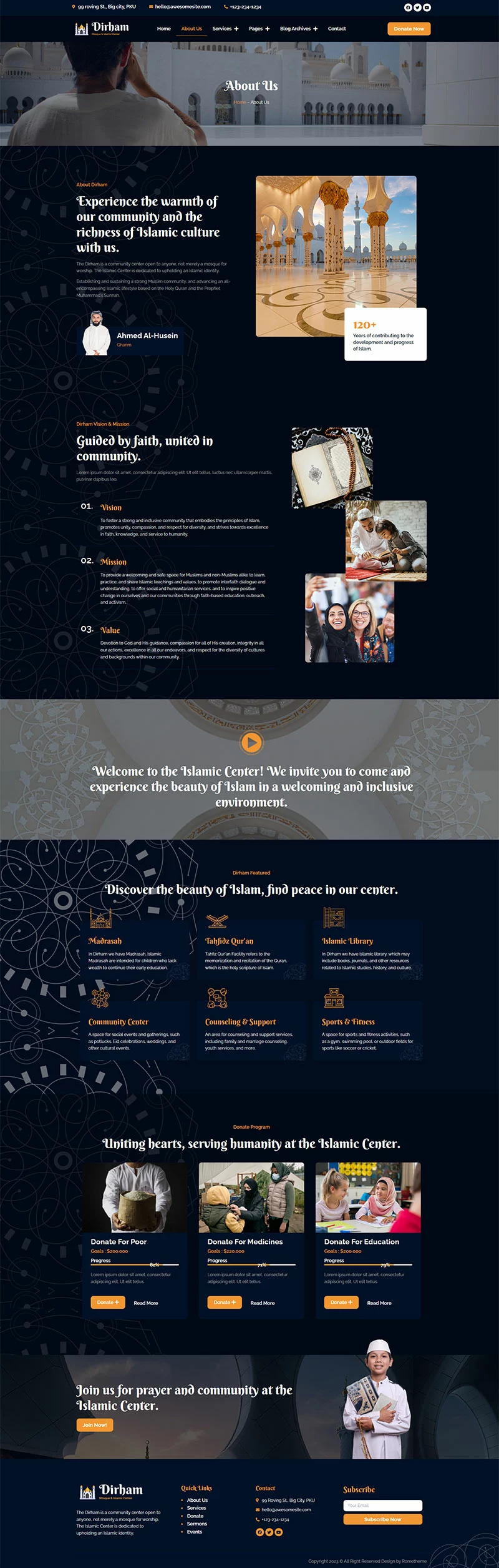 کیت قالب المنتور مسجد و مرکز اسلامی Dirham دارای طراحی حرفهای و مدرن است که فرهنگ و ارزشهای اسلامی را منعکس میکند. با رابط کاربری دوستانه و بهینهشده برای دستگاههای دسکتاپ و موبایل، استفاده از این قالب بسیار آسان است.