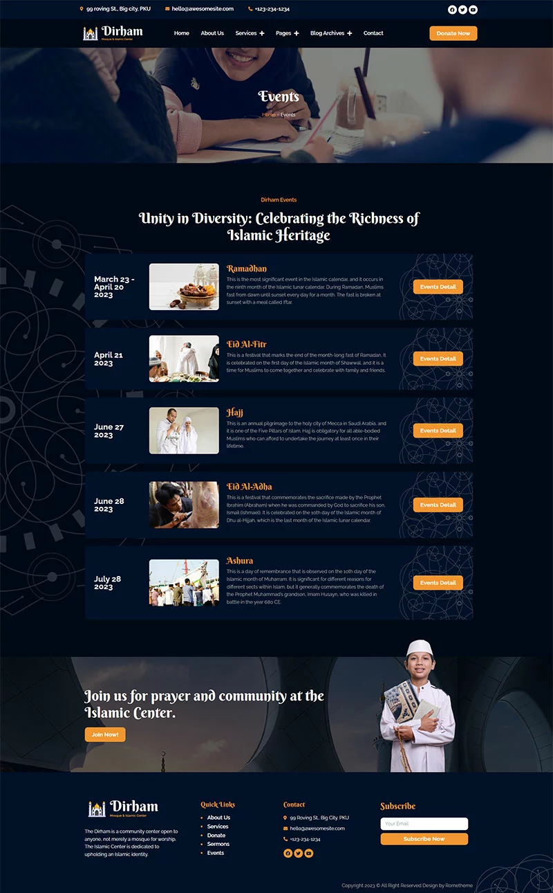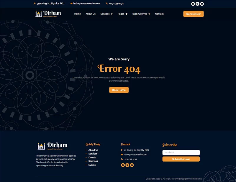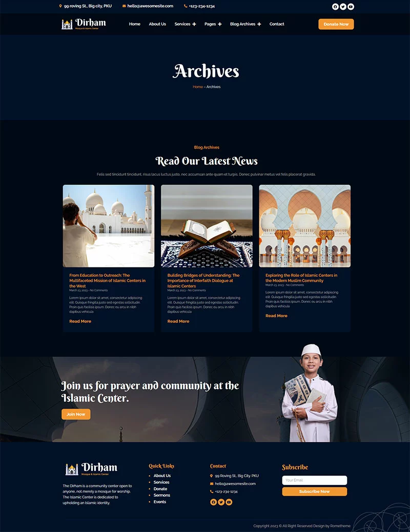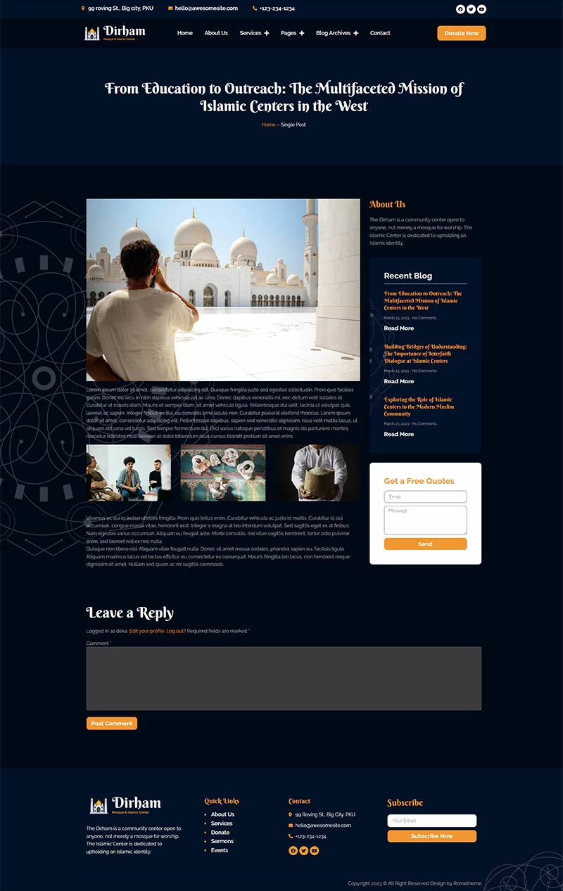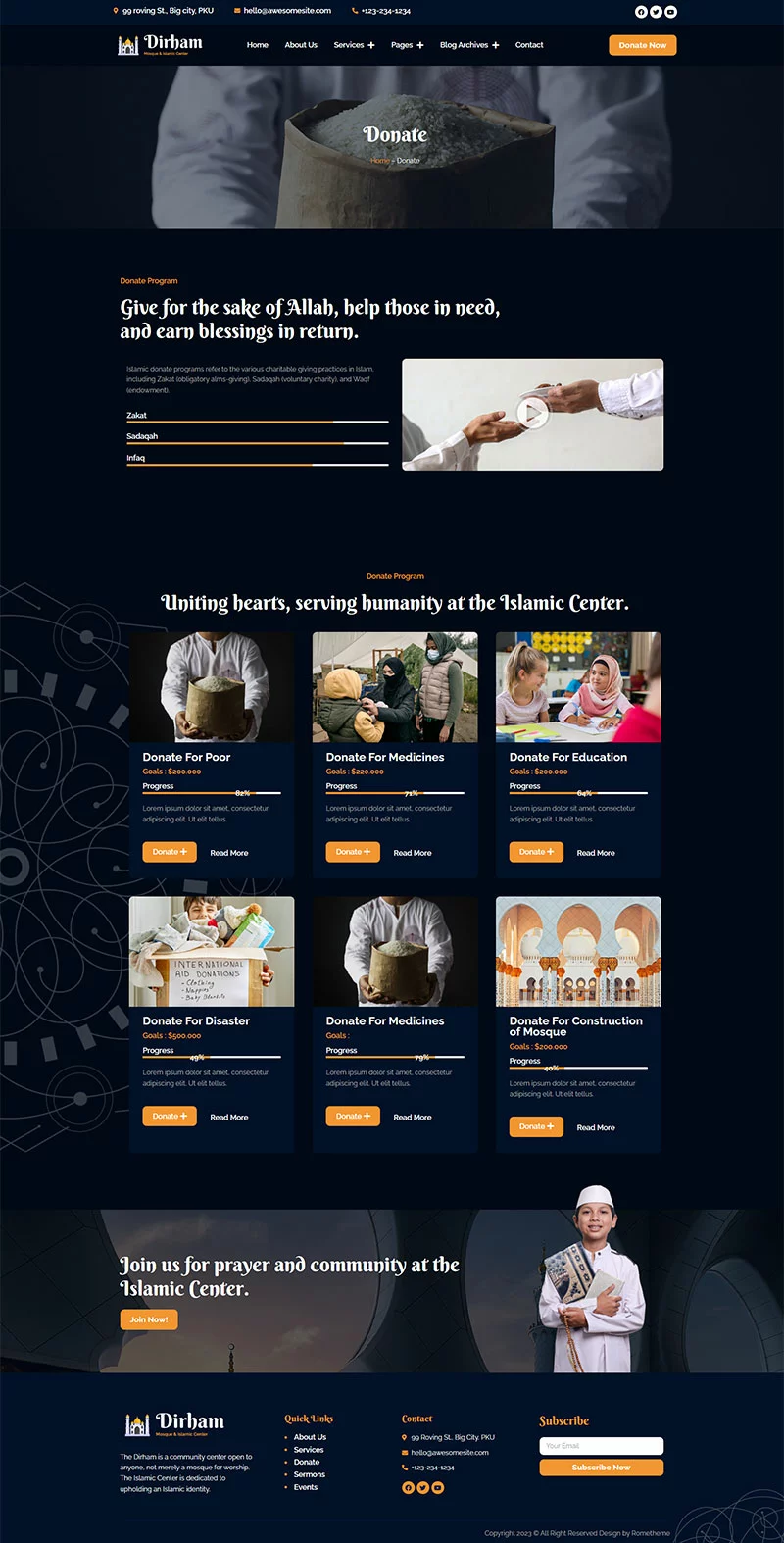 کیت قالب المنتور مسجد و مرکز اسلامی Dirham دارای طراحی حرفهای و مدرن است که فرهنگ و ارزشهای اسلامی را منعکس میکند. با رابط کاربری دوستانه و بهینهشده برای دستگاههای دسکتاپ و موبایل، استفاده از این قالب بسیار آسان است.