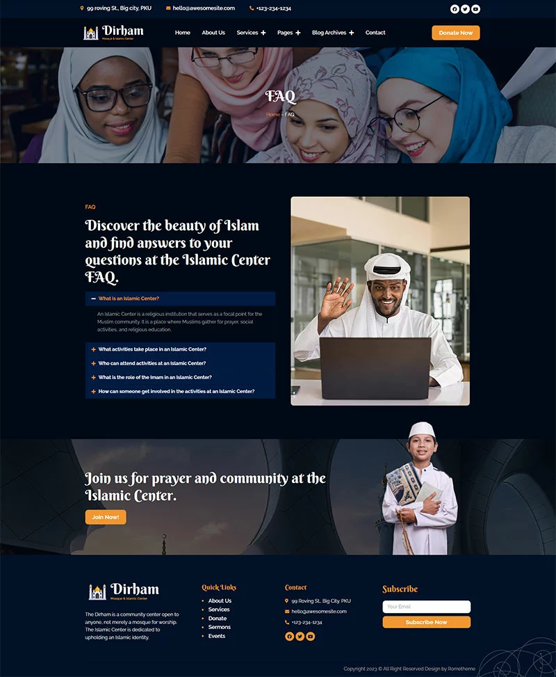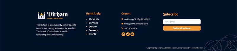 با استفاده از کیت قالب المنتور مسجد و مرکز اسلامی Dirham، شما میتوانید به سرعت و به سادگی یک وبسایت حرفهای و واکنشگرا برای مسجد یا مرکز اسلامی خود ایجاد کنید. این کیت با طراحی مدرن و حرفهای خود، تمامی ابزارهای لازم برای نمایش خدمات، پروژهها، تیم و تماس با ما را در اختیار شما قرار میدهد. با قابلیت سفارشیسازی آسان و بدون نیاز به کدنویسی، Dirham انتخابی عالی برای ایجاد یک حضور آنلاین حرفهای برای مراکز اسلامی و مساجد است.