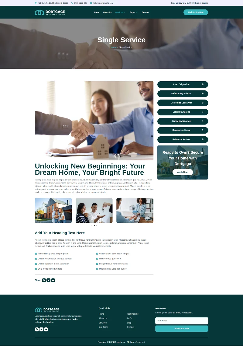 کیت قالب المنتور شرکت وام مسکن Dortgage دارای طراحی مدرن و منحصربهفردی است که با یک طرح کاملاً واکنشگرا ارائه میشود. نصب آسان و سفارشیسازی بسیار راحت، به لطف استفاده از Elementor، باعث میشود که برای استفاده از آن نیاز به دانش کدنویسی نداشته باشید!