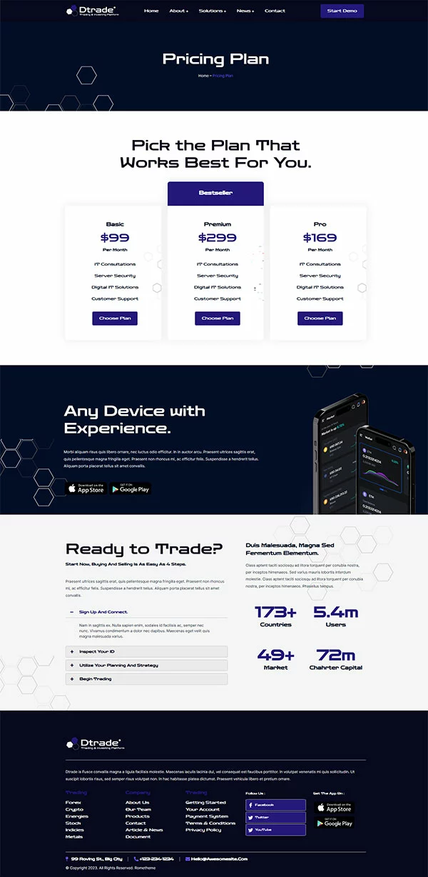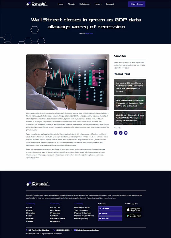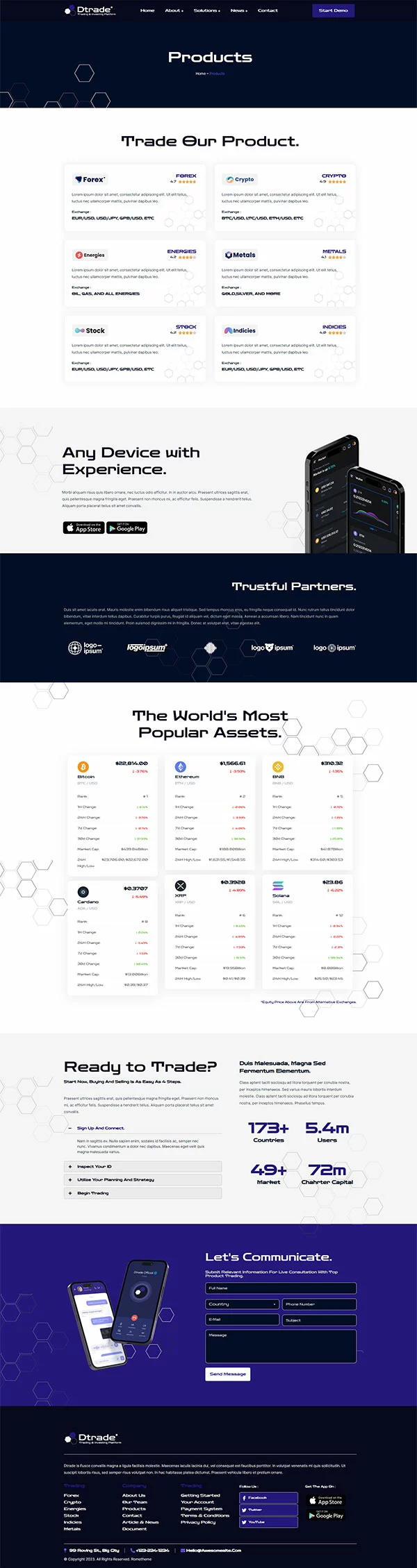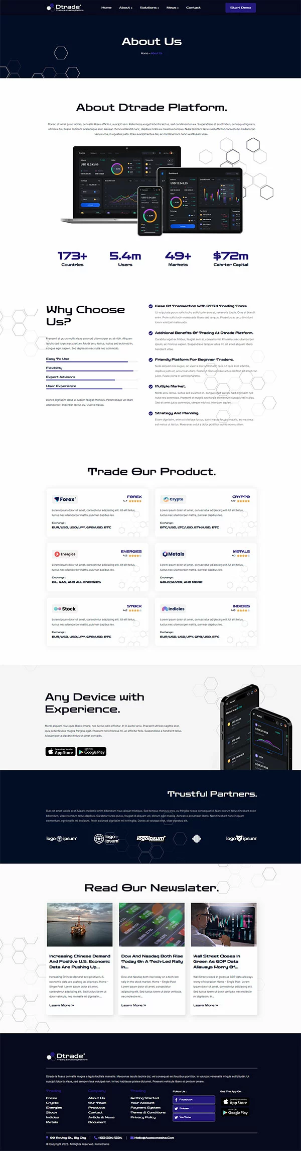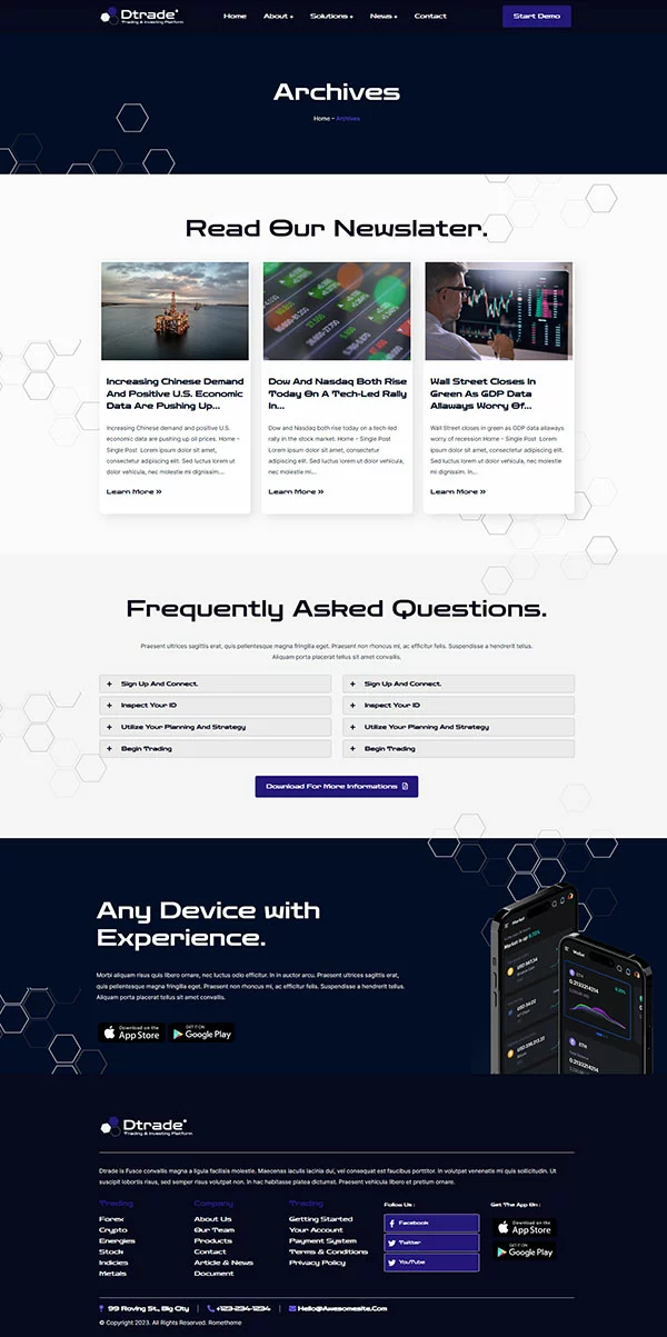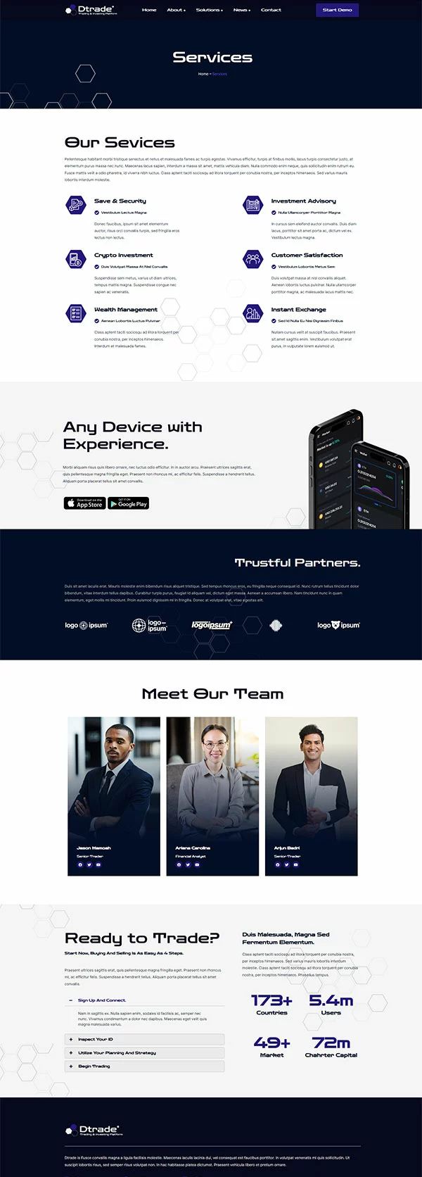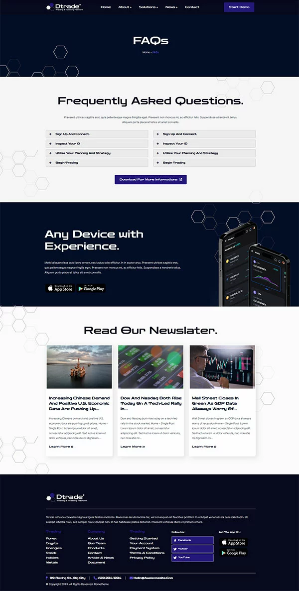 کیت قالب المنتور شرکت تجارت و سرمایه گذاری Dtrade شامل 12+ قالب از پیش ساخته شده با طراحی تمیز، واکنشگرا و قابل تنظیم است. این قالبها مناسب برای ایجاد وبسایتهای مرتبط با امور مالی مانند شرکتهای سرمایهگذاری، تجارت، صندوقهای سرمایهگذاری مشترک، مدیریت ثروت، مشاوره سرمایهگذاری، سرمایهگذاری در ارزهای دیجیتال و سرمایهگذاری در سهام میباشد. با استفاده از این کیت المنتور، میتوانید وبسایت حرفهای خود را بدون نیاز به کدنویسی، تنها با کشیدن و رها کردن ایجاد کنید.