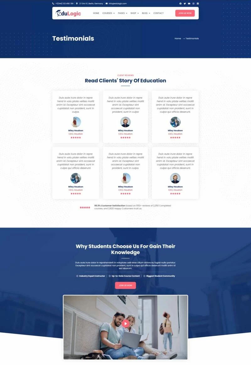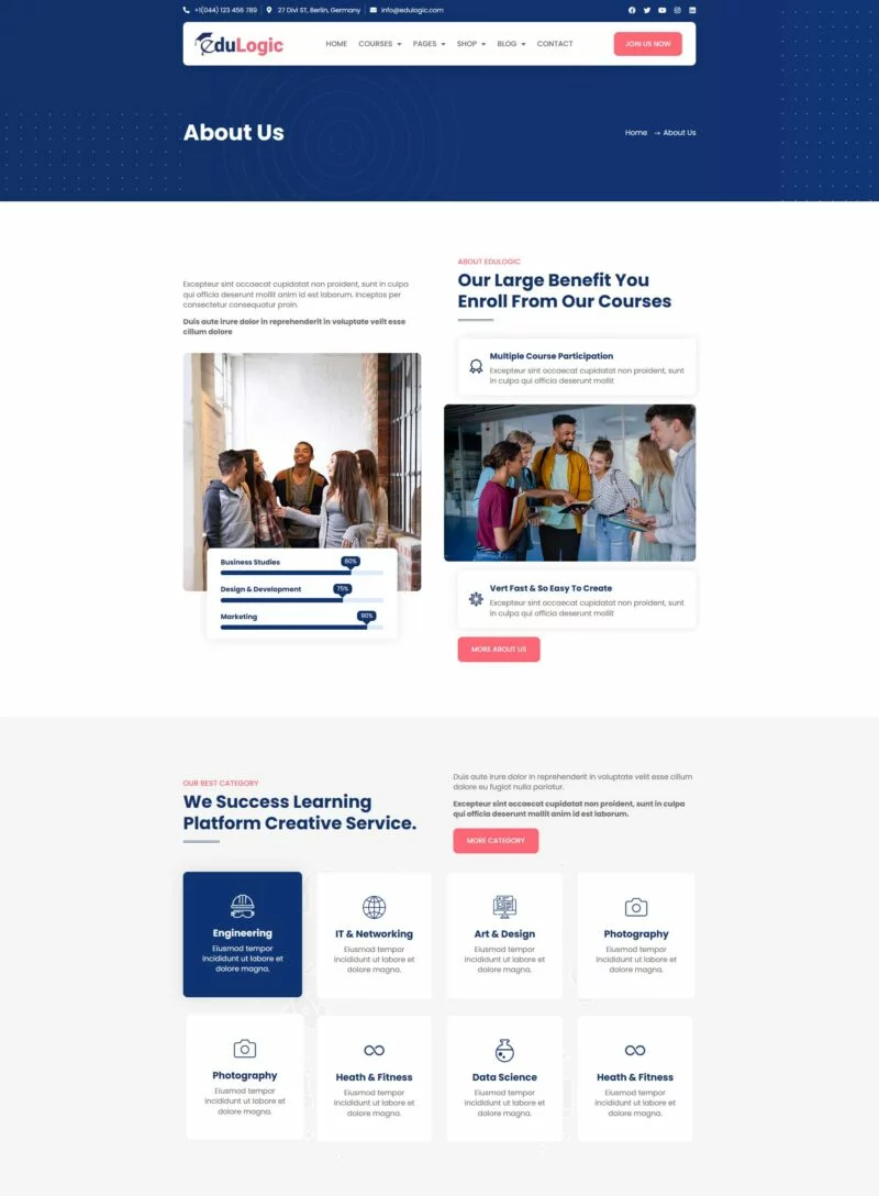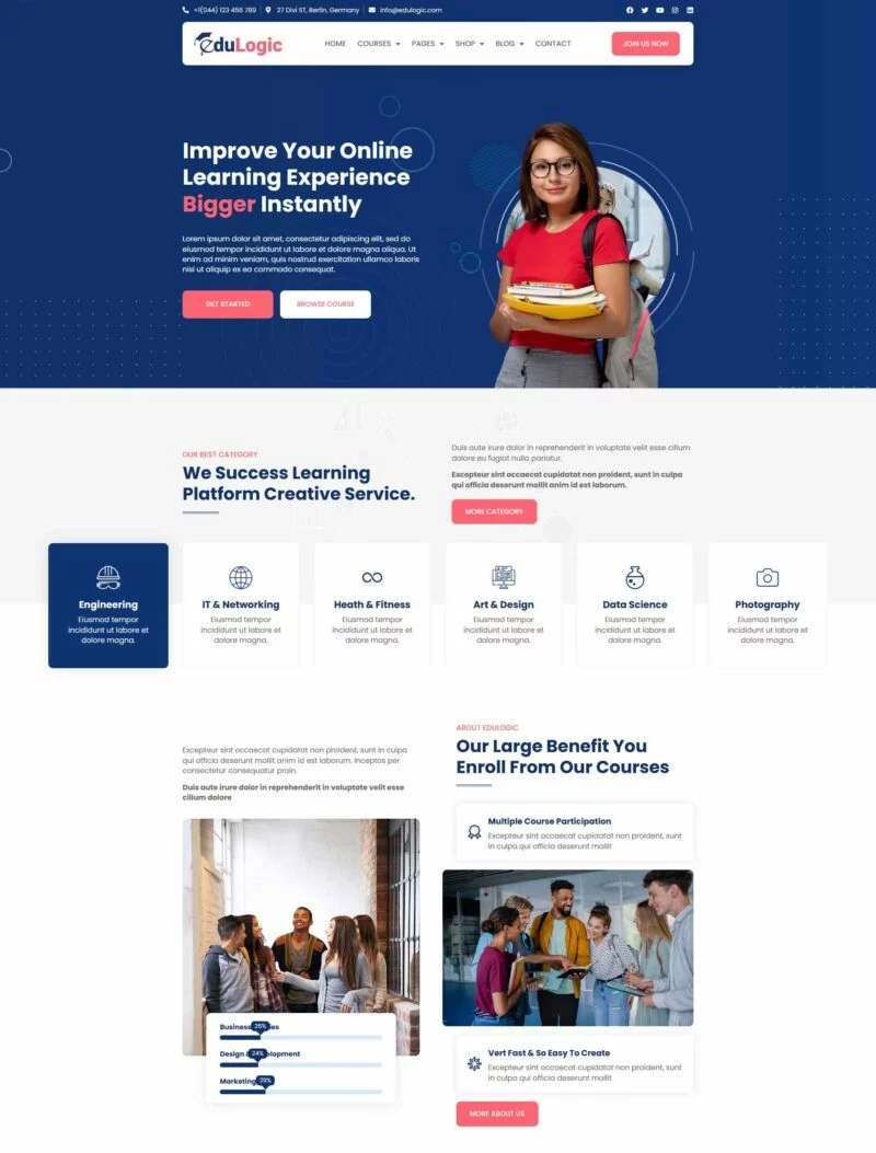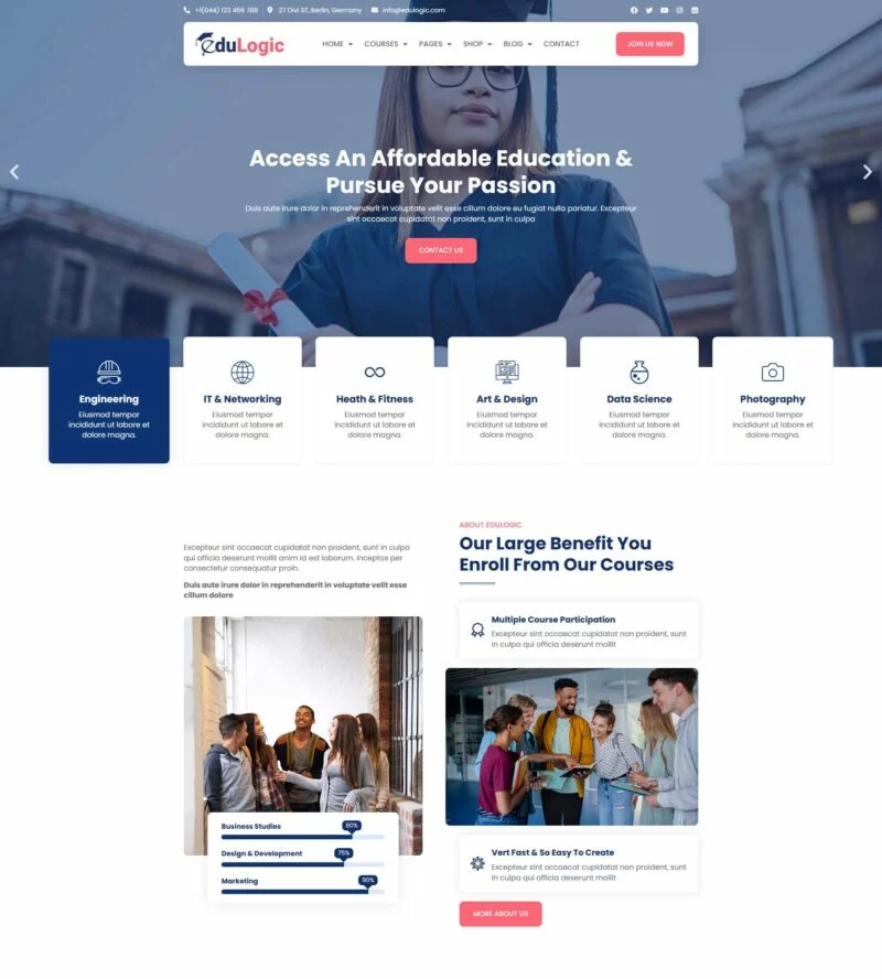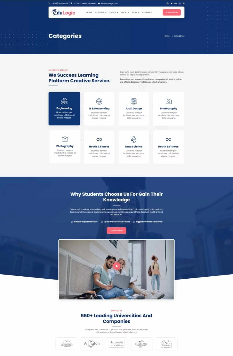 کیت قالب المنتور آموزشگاه و دانشگاه Edulogic بهطور ویژه برای وبسایتهای آموزشی مانند آکادمی، کلاسها، کالج، دورهها، یادگیری الکترونیکی، رویدادها، مهدکودک، آموزش، مدرسه، دانشآموز، معلم، دانشگاه و سایر وبسایتهای آموزشی مناسب است. این کیت قالب شامل بیش از 20 صفحه با طراحی ساده، مدرن و تمیز و با چیدمان 100% واکنشگرا است که بسیار آسان برای سفارشیسازی میباشد و توسط هر کسی قابل استفاده است. این کیت قالب با برنامهریزی، طراحی و ایجاد آنها بهگونهای طراحی و توسعه یافته است که رضایت و خوشحالی مشتریان را تضمین کند.