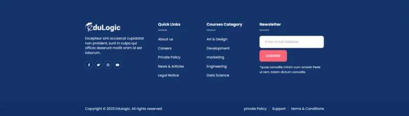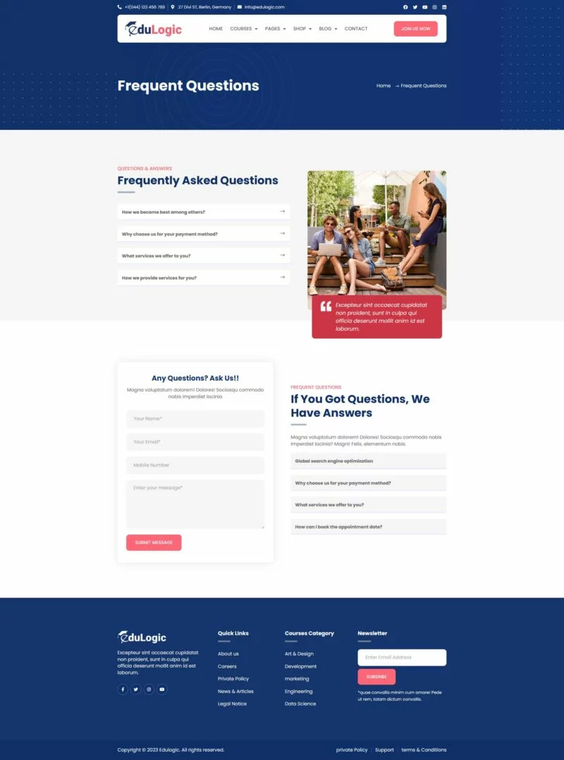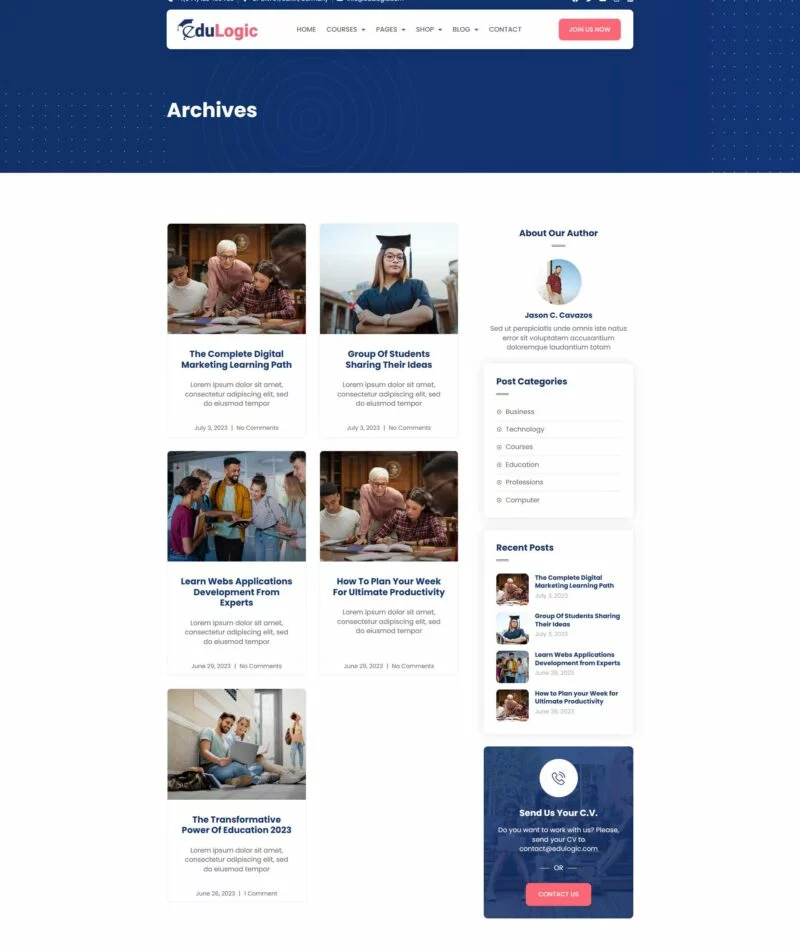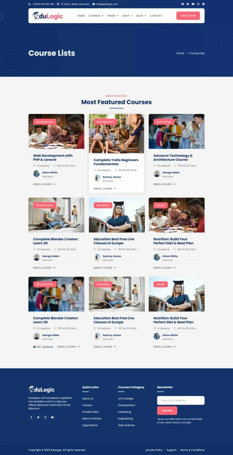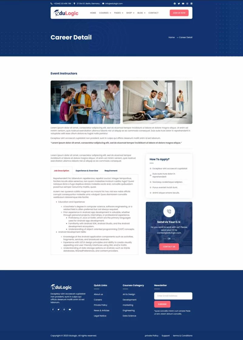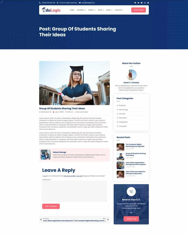 کیت قالب المنتور آموزشگاه و دانشگاه Edulogic بهطور ویژه برای وبسایتهای آموزشی مانند آکادمی، کلاسها، کالج، دورهها، یادگیری الکترونیکی، رویدادها، مهدکودک، آموزش، مدرسه، دانشآموز، معلم، دانشگاه و سایر وبسایتهای آموزشی مناسب است. این کیت قالب شامل بیش از 20 صفحه با طراحی ساده، مدرن و تمیز و با چیدمان 100% واکنشگرا است که بسیار آسان برای سفارشیسازی میباشد و توسط هر کسی قابل استفاده است. این کیت قالب با برنامهریزی، طراحی و ایجاد آنها بهگونهای طراحی و توسعه یافته است که رضایت و خوشحالی مشتریان را تضمین کند.
