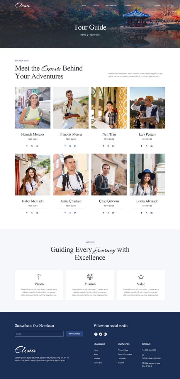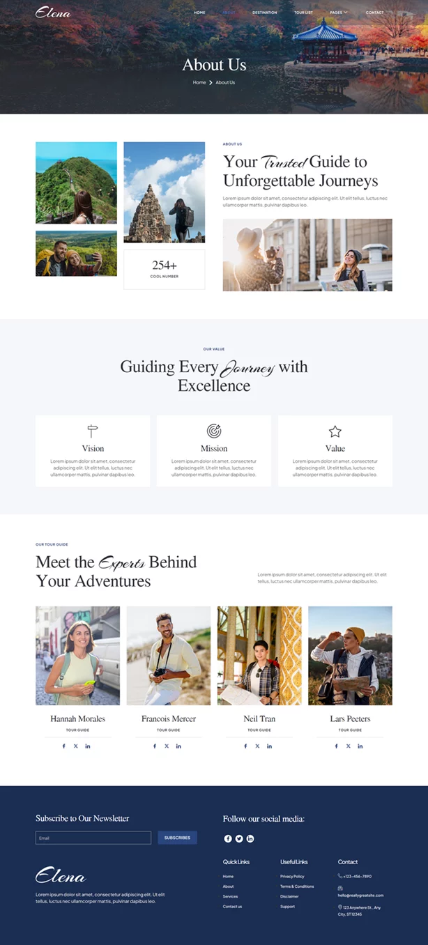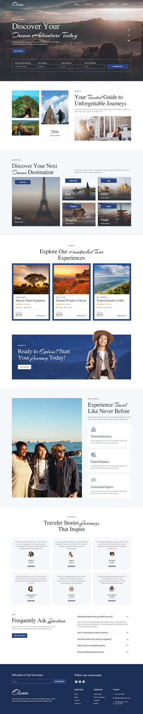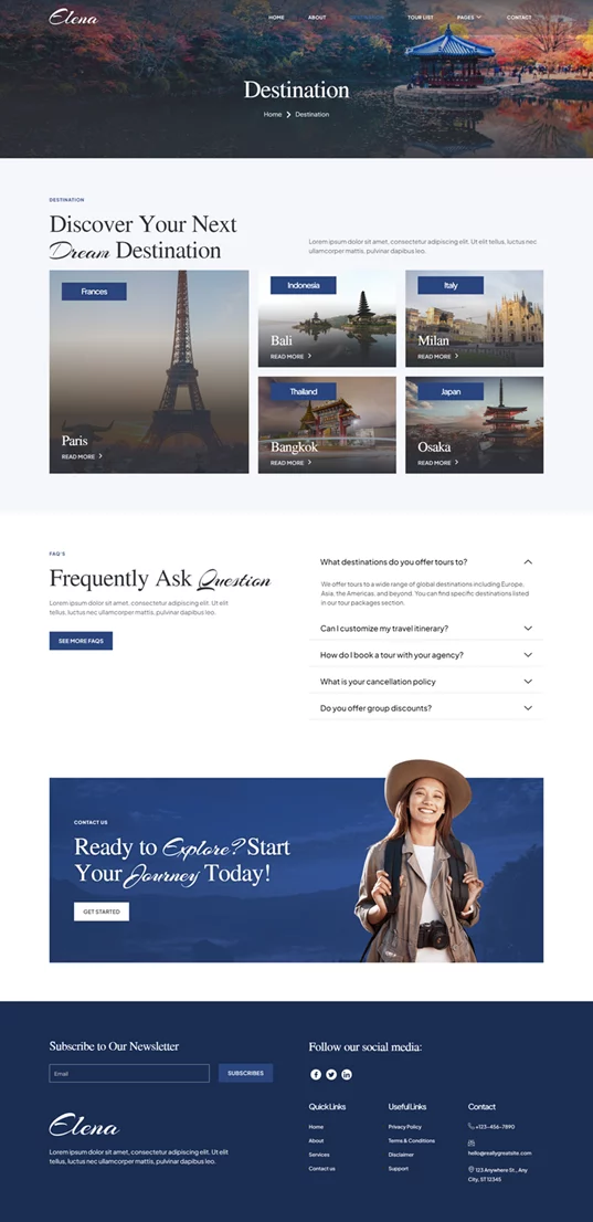 Elena یک کیت قالب حرفهای برای وبسایتهای مرتبط با راهنمای سفر و آژانسهای مسافرتی است. این قالب بهطور اختصاصی برای آژانسهای مسافرتی، تورگردانها و بلاگرهای سفر طراحی شده و امکانات و طراحی خاصی را برای ایجاد یک وبسایت زیبا و کاربرپسند بدون نیاز به کدنویسی فراهم میکند. Elena با بهرهگیری از افزونههای رایگان المنتور، به شما امکان میدهد که در فضای آنلاین به راحتی فعالیت کنید و حضوری موثر و جذاب داشته باشید.