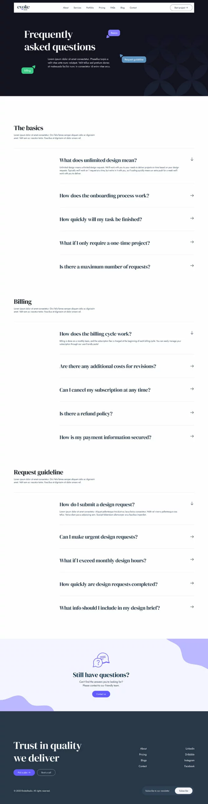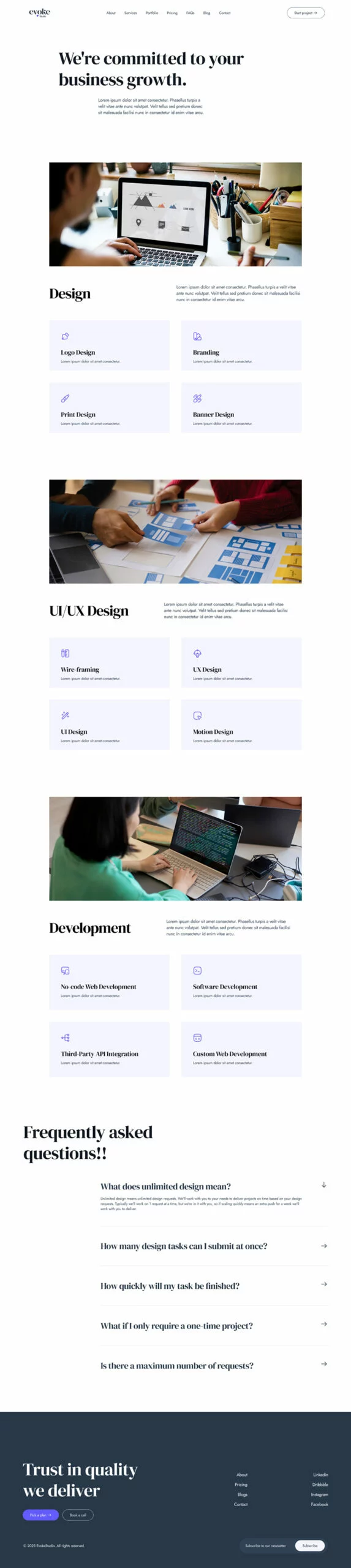 صفحات اصلی ، صفحه درباره ما، صفحه خدمات، صفحه نمونه کارها، صفحه وبلاگ، صفحه پست وبلاگ، صفحه قیمتگذاری، صفحه تماس با ما، صفحه سوالات متداول، هدر و فوتر، صفحه 404