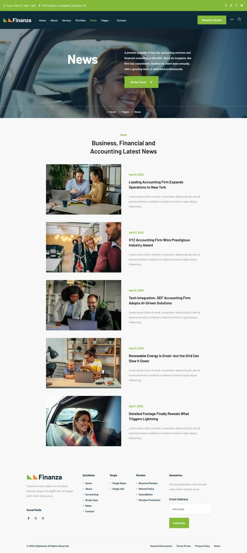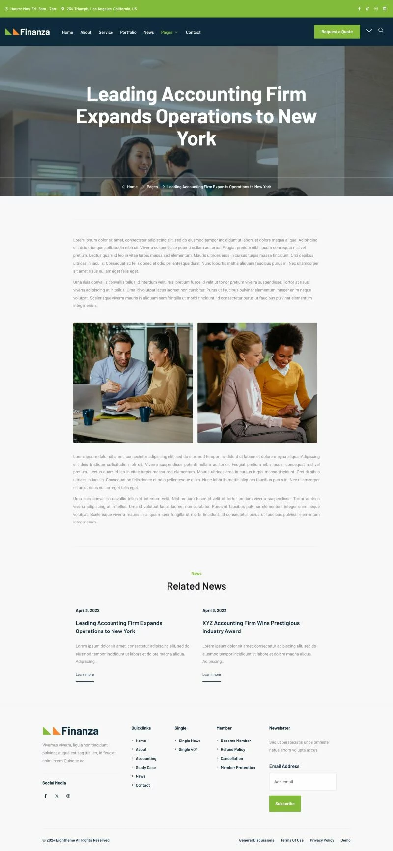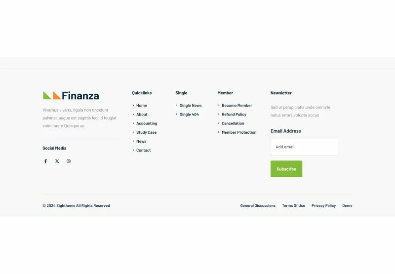 کیت قالب المنتور شرکت مالی و حسابداری Finanza با طراحی ساده و تمیز و استایل مدرن ارائه شده است. با استفاده از این کیت، میتوانید وبسایتهایی با طراحی واکنشگرا و جذاب بسازید که به نیازهای ویژه شرکتهای مالی و تجاری پاسخ میدهد.